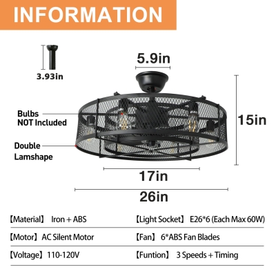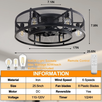 Depuley 26" maalaistalon kattotuuletin 6 valolla, teollinen sisä-/ulkokattotuuletinvalaistus, mattamusta kattotuuletinvalot, häkkikattotuuletin 6-nopeuksisella kaukosäätimellä (polttimo ei sisälly)