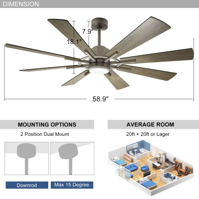 Depuley-kattotuuletin valoilla, 60" käännettävä suuri teollisuuskattotuuletin 8 vaneriterällä, 3 vaaleaa Fandelier-kattotuuletinta kaukosäätimellä sisätiloihin ja katettuihin ulkotiloihin, 5-nopeuksin