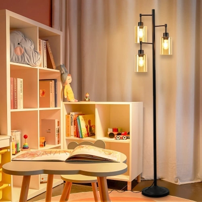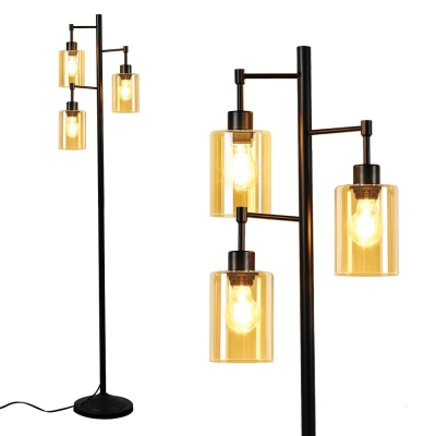 Depuley Industrial -lattiavalaisin olohuoneeseen, 3-valoinen maalaistalon puulattiavalaisin, maalaismainen seisova LED-lamppu meripihkanvärisellä lasivarjostimella, musta napainen korkea lattiavalaisi