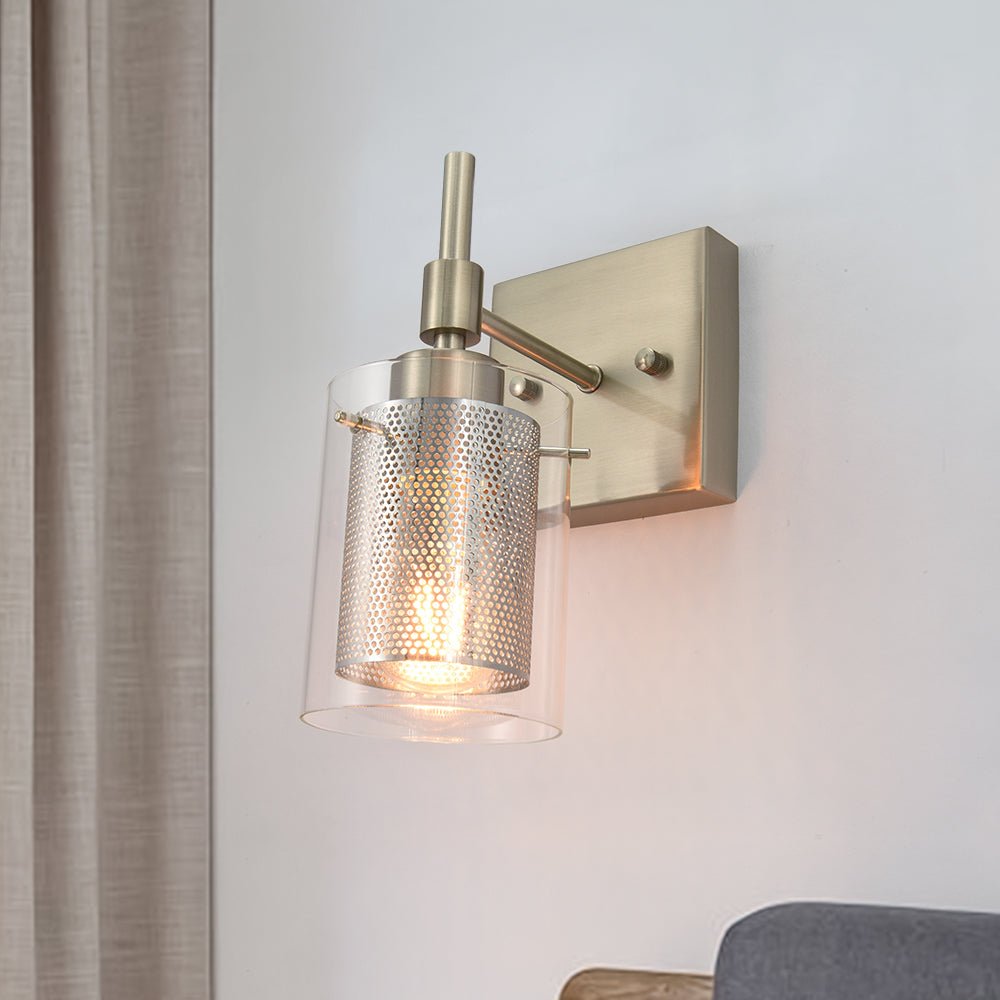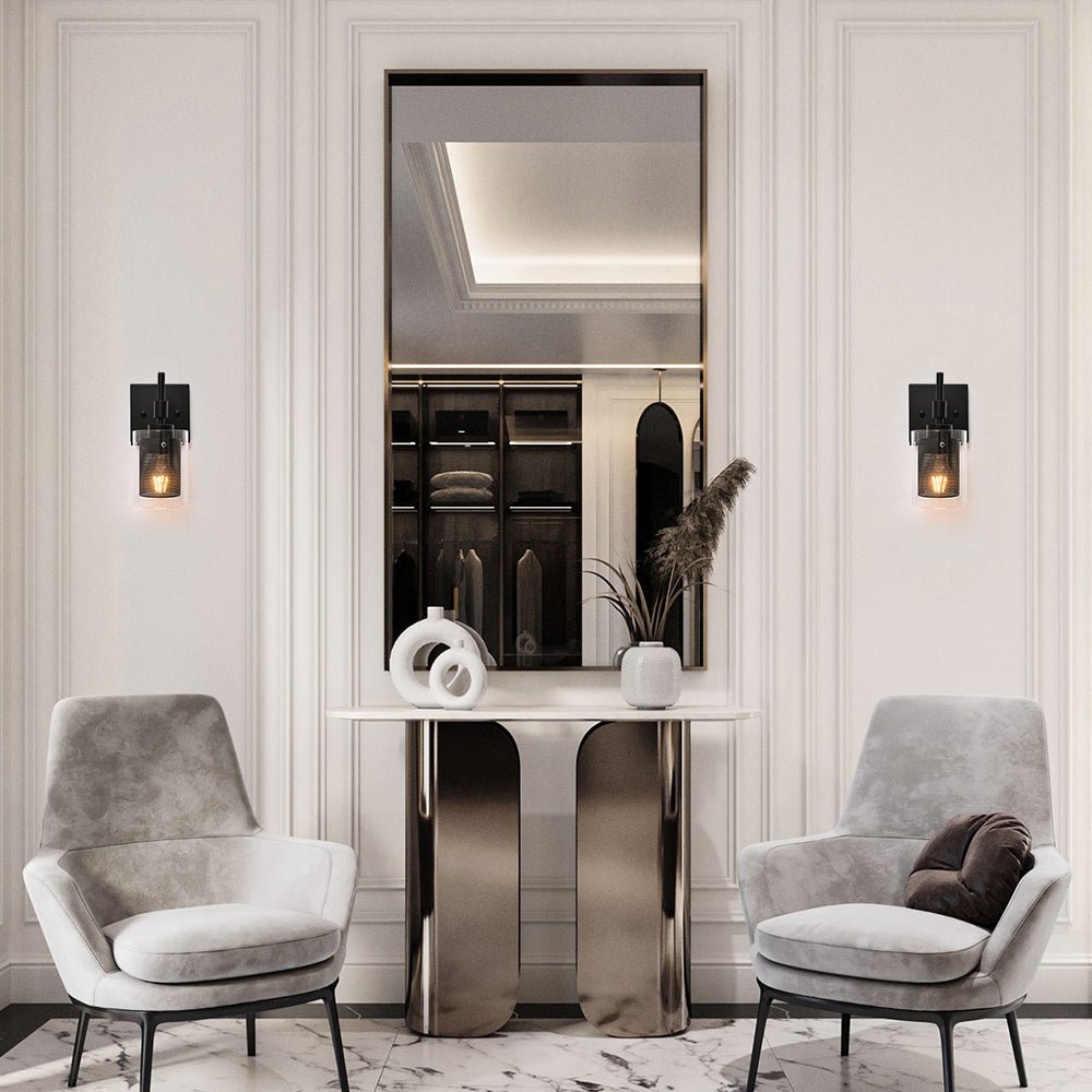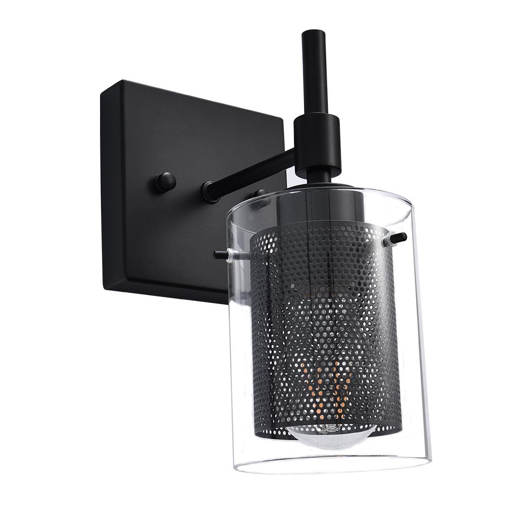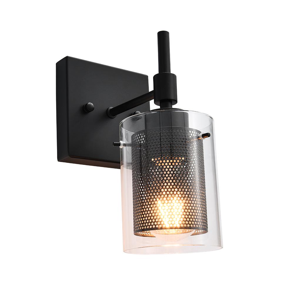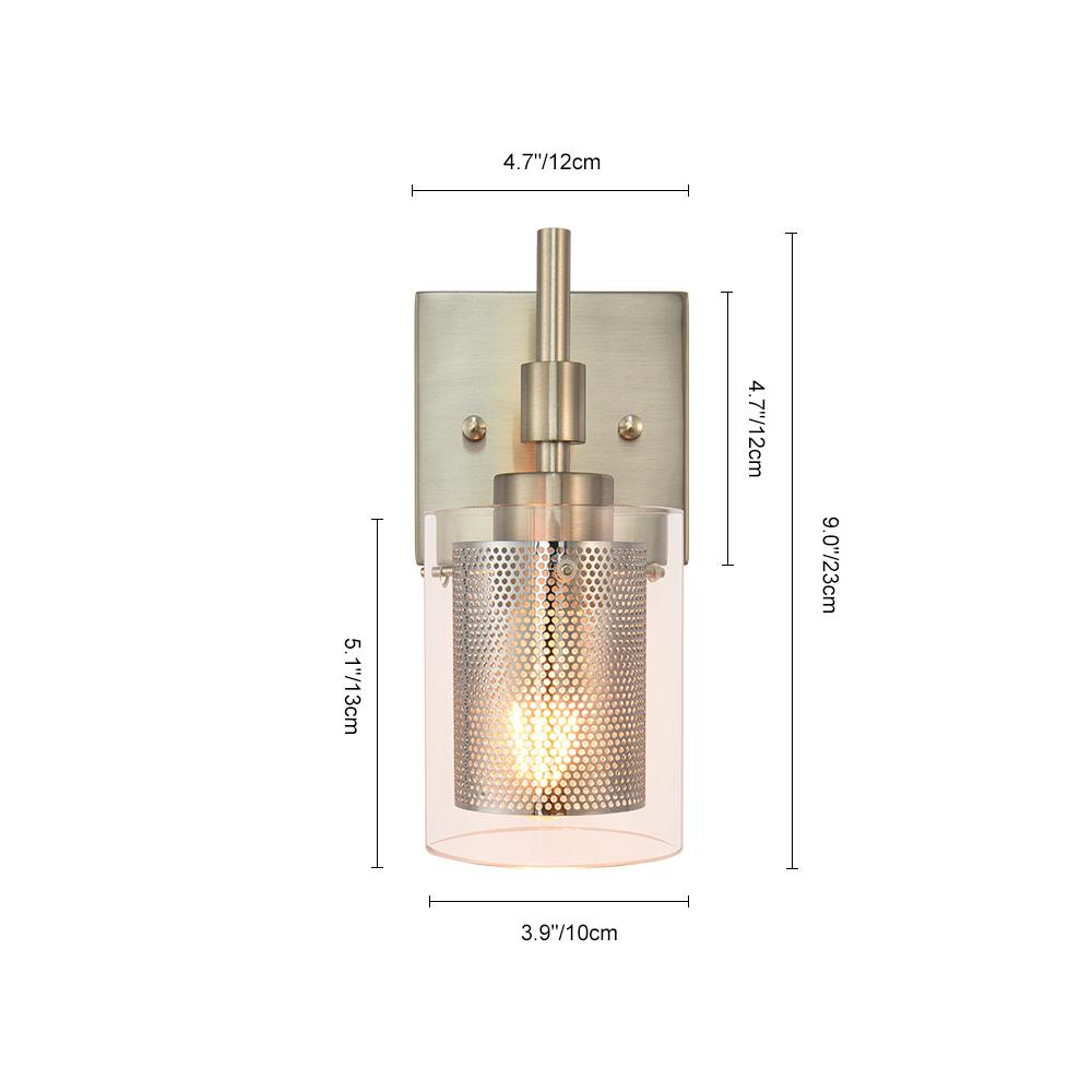 Taskulamppujen inspiroima lieriömäinen lasivarjostin, jota tukee suorakulmainen taustalevy ja suora varsi, rakentaa siirtymäkauden yhden valon seinävalaisin. Tämä lasisylinterinen seinävalaisin on korostettu sopivalla verkolla, joka ympäröi keskipitkän E26/E27-polttimoa (ei sisälly toimitukseen). Mukavuuden vuoksi voit asentaa lasiseinävalaisimen ylös- tai alaspäin tarpeidesi mukaan. Tämä yhden valon lasisylinterinen lasivalaisin sopii täydellisesti kylpyhuoneeseen, pukuhuoneeseen, makuuhuoneeseen, käytävään, eteiseen tai muihin oleskelutiloihin. Se auttaa sinua omistamaan hyvin valaistun kodin.Detail
