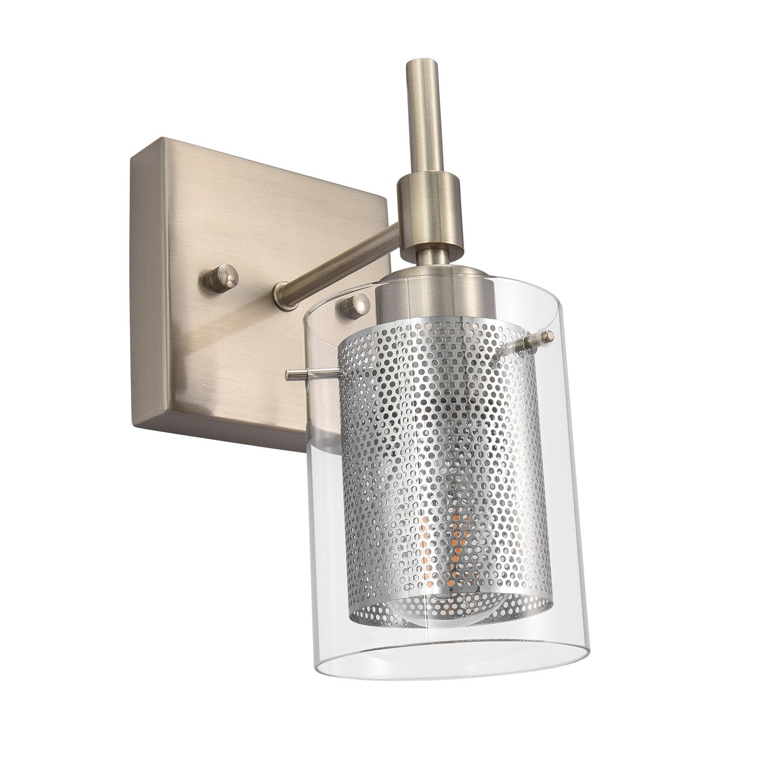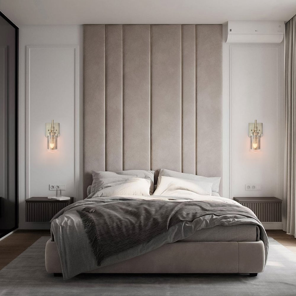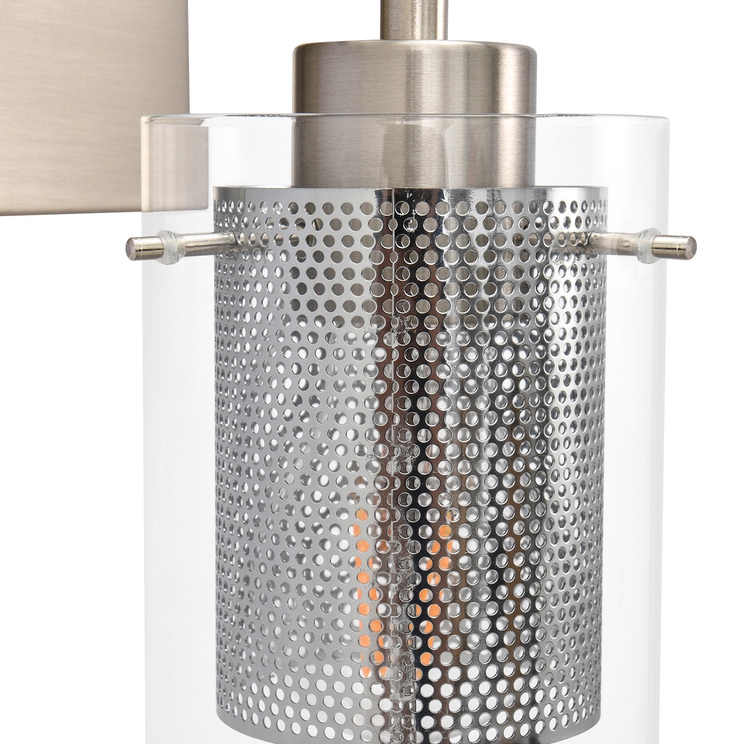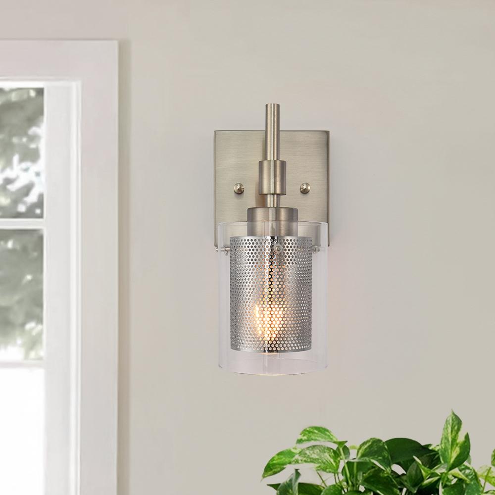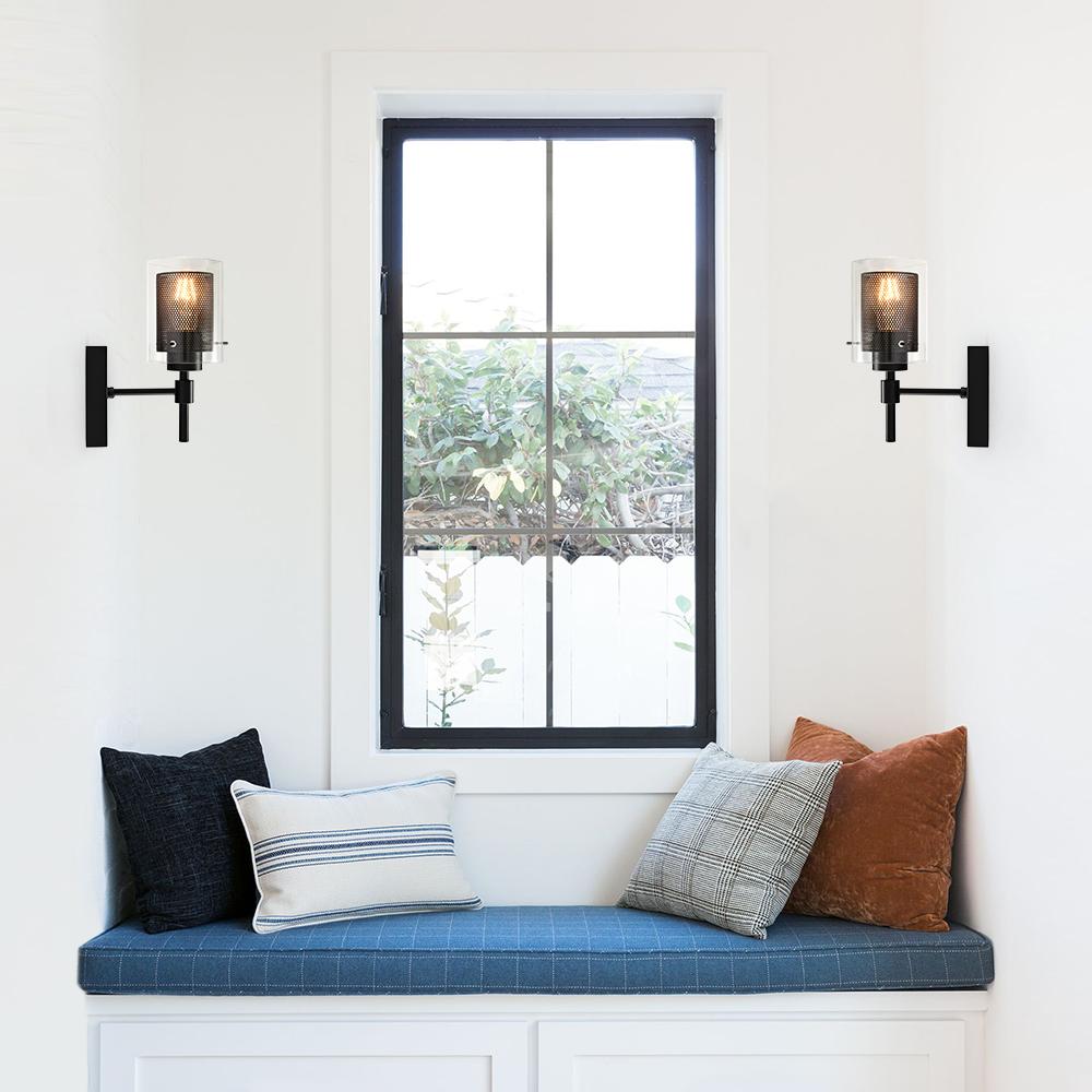 Taskulamppujen inspiroima lieriömäinen lasivarjostin, jota tukee suorakulmainen taustalevy ja suora varsi, rakentaa siirtymäkauden yhden valon seinävalaisin. Tämä lasisylinterinen seinävalaisin on korostettu sopivalla verkolla, joka ympäröi keskipitkän E26/E27-polttimoa (ei sisälly toimitukseen). Mukavuuden vuoksi voit asentaa lasiseinävalaisimen ylös- tai alaspäin tarpeidesi mukaan. Tämä yhden valon lasisylinterinen lasivalaisin sopii täydellisesti kylpyhuoneeseen, pukuhuoneeseen, makuuhuoneeseen, käytävään, eteiseen tai muihin oleskelutiloihin. Se auttaa sinua omistamaan hyvin valaistun kodin.Detail