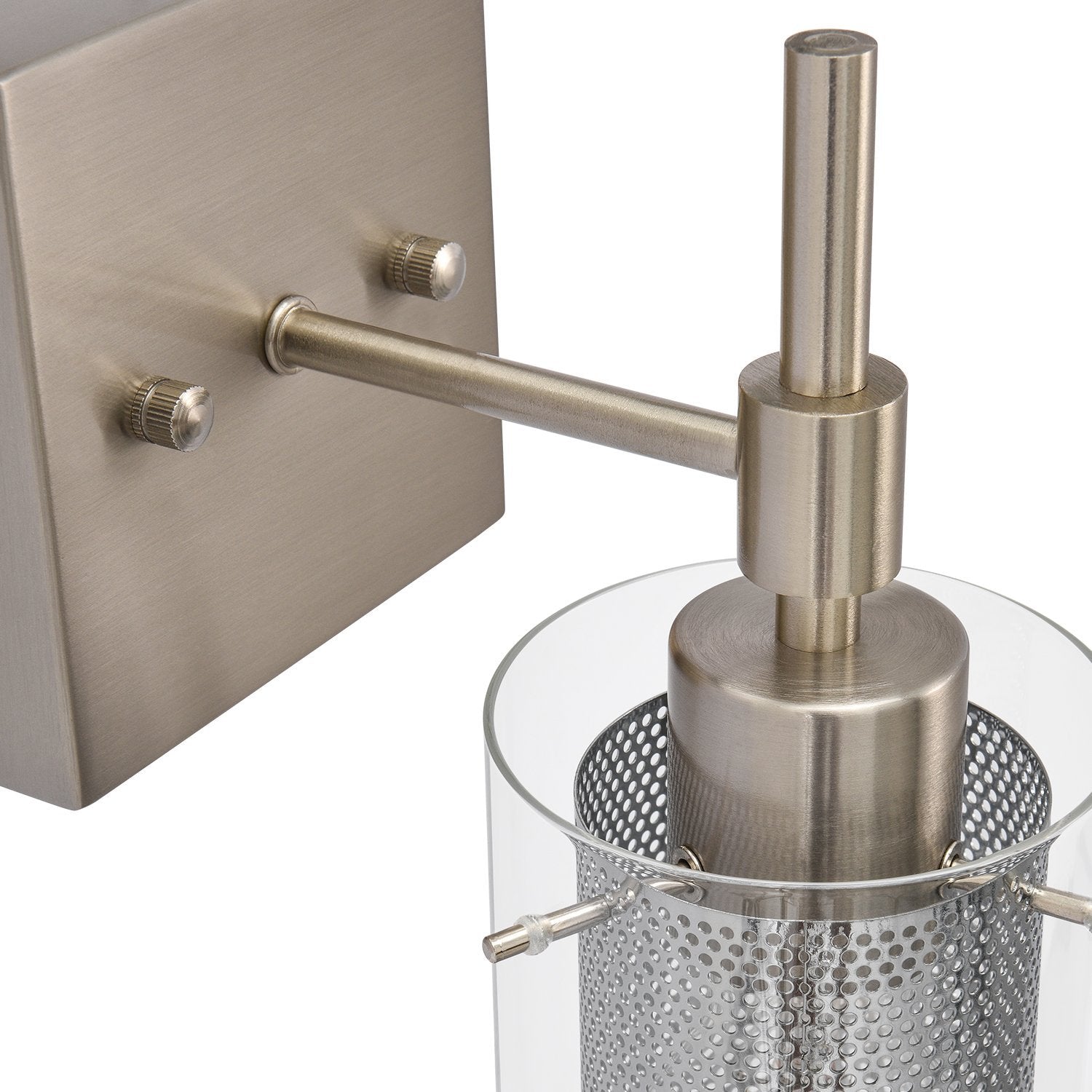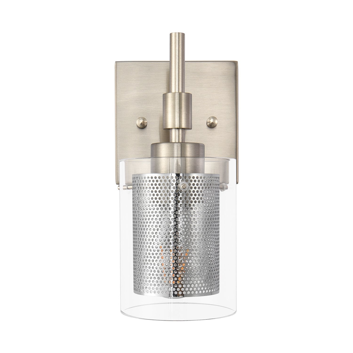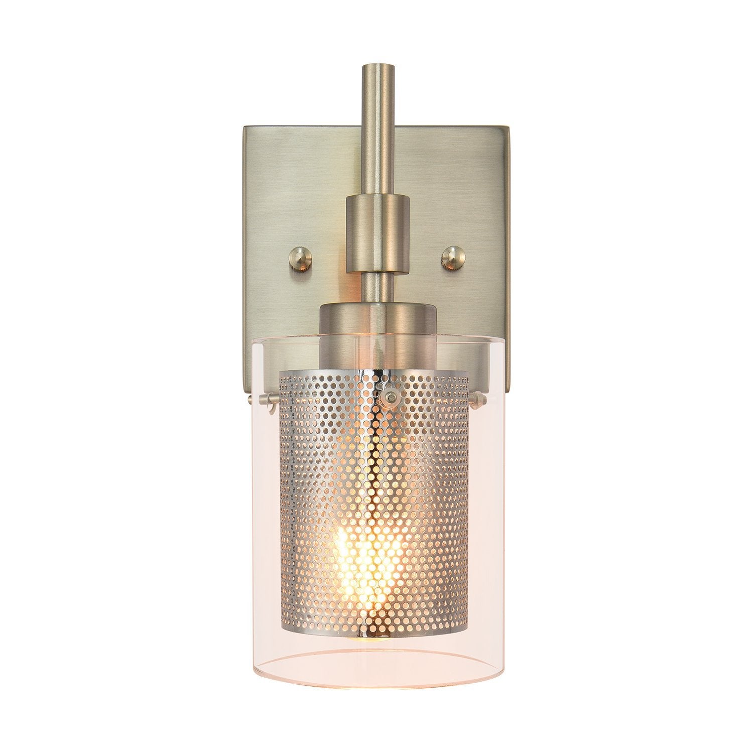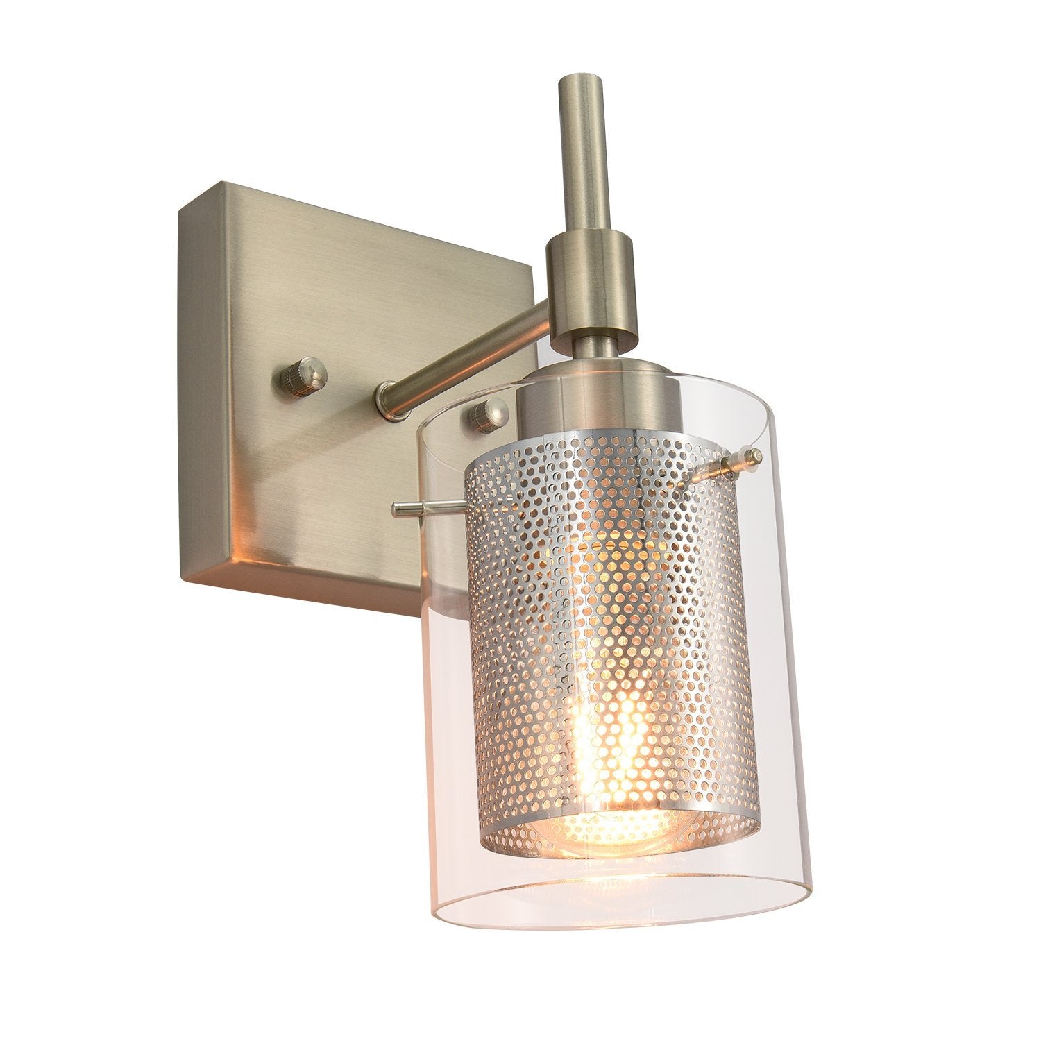 Taskulamppujen inspiroima lieriömäinen lasivarjostin, jota tukee suorakulmainen taustalevy ja suora varsi, rakentaa siirtymäkauden yhden valon seinävalaisin. Tämä lasisylinterinen seinävalaisin on korostettu sopivalla verkolla, joka ympäröi keskipitkän E26/E27-polttimoa (ei sisälly toimitukseen). Mukavuuden vuoksi voit asentaa lasiseinävalaisimen ylös- tai alaspäin tarpeidesi mukaan. Tämä yhden valon lasisylinterinen lasivalaisin sopii täydellisesti kylpyhuoneeseen, pukuhuoneeseen, makuuhuoneeseen, käytävään, eteiseen tai muihin oleskelutiloihin. Se auttaa sinua omistamaan hyvin valaistun kodin.Detail
