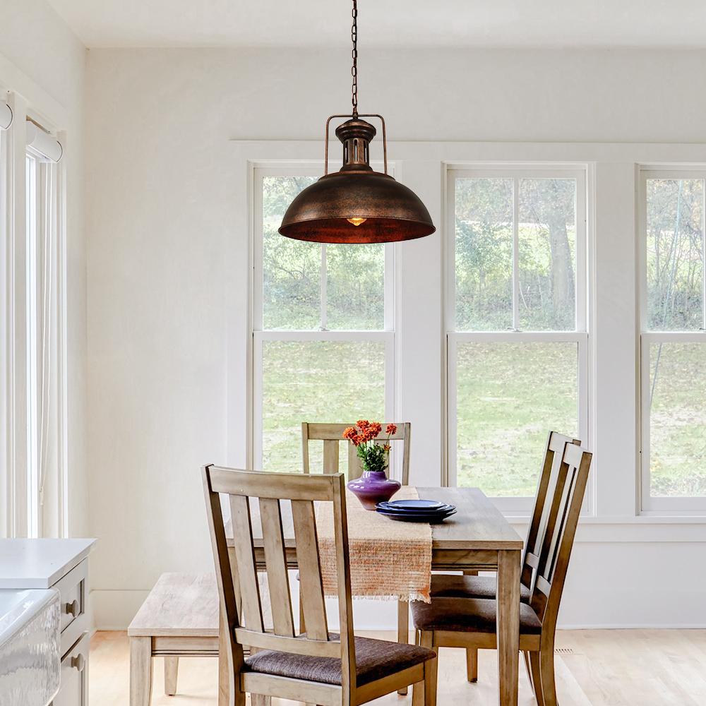 Perinteisestä kattilan kannesta vihjeen otettu 1-kevytmetallinen riippuvalaisin on täynnä teollista kosketusta. Leveä kupolin muotoinen riipus ripustetaan säädettävällä ketjulla ja pyöreällä kuomulla. Tämä kupoliriippuvalaisin on saatavana kolmella maalaismaisella metalliviimeistelyllä, joka lisää luonnetta klassiseen ja ajattomaan navettaan. Tämä 1-kevyinen teollisuuskupoliriippuvalaisin sopii täydellisesti keittiösaarekkeeseen, kodin baariin, ruokailutilaan, työtilaan tai tiloihin, jotka vaativat vahvaa ilmettä.Detail