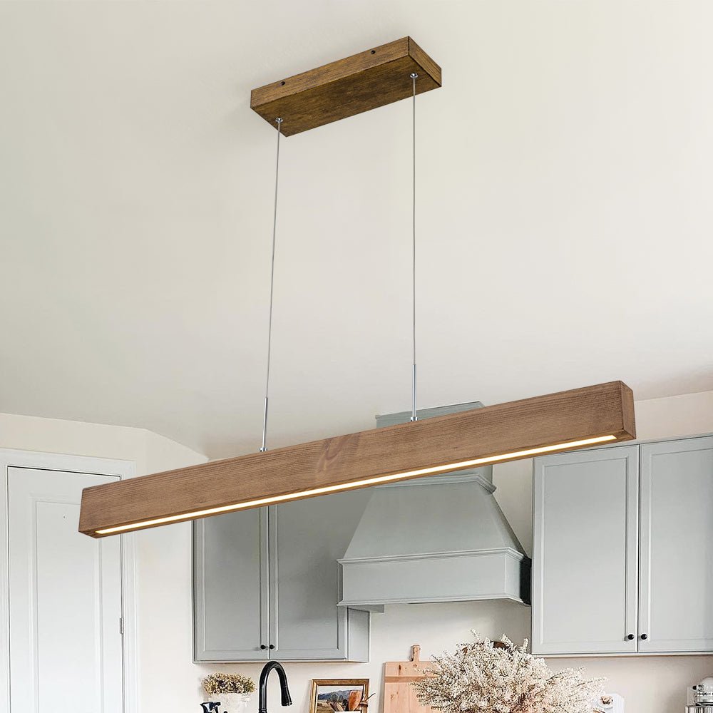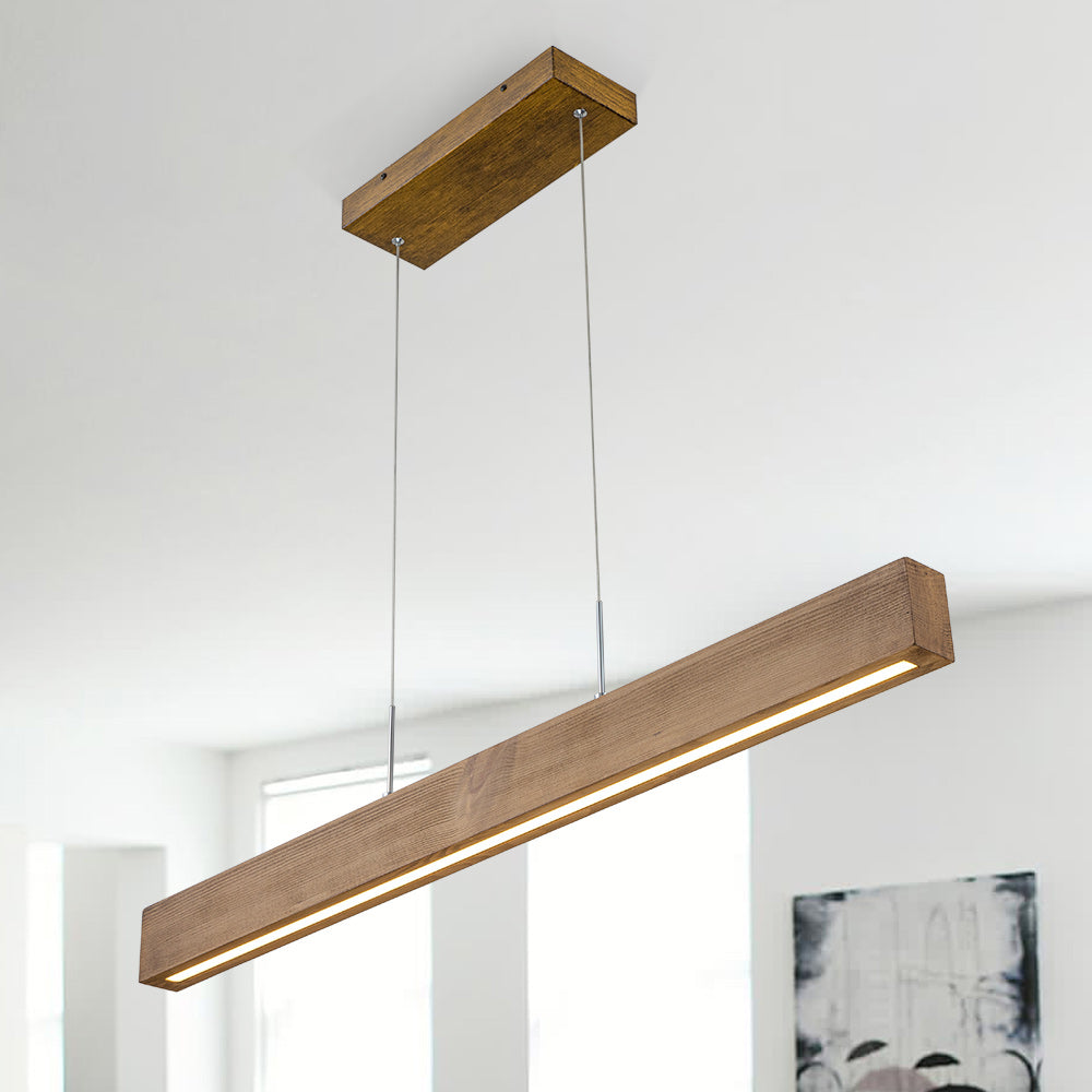 Taitava yhdistelmä modernia minimalistista ja eleganttia rustiikkia on viimeinen sana tässä leveässä LED-riippuvalaisimessa. Vaaleasta pähkinäpuusta tai mäntypuusta valmistettu laajan suorakaiteen muotoinen riipus ripustetaan kahdella ohuella nyörillä väriä vastaavasta katoksesta. Sisäänrakennetun LED-moduulin ansiosta tämä puinen lineaarinen kattokruunu heittää tehokkaan työvalaistuksen alaspäin. Yhteensopiva himmenninkytkimen kanssa, se tarjoaa kätevästi himmennettävän toiminnon. Tämä LED-saaririipus on syntynyt moderniin tai talonkeittiön saarelle ja pitkälle pöydälle.Detail