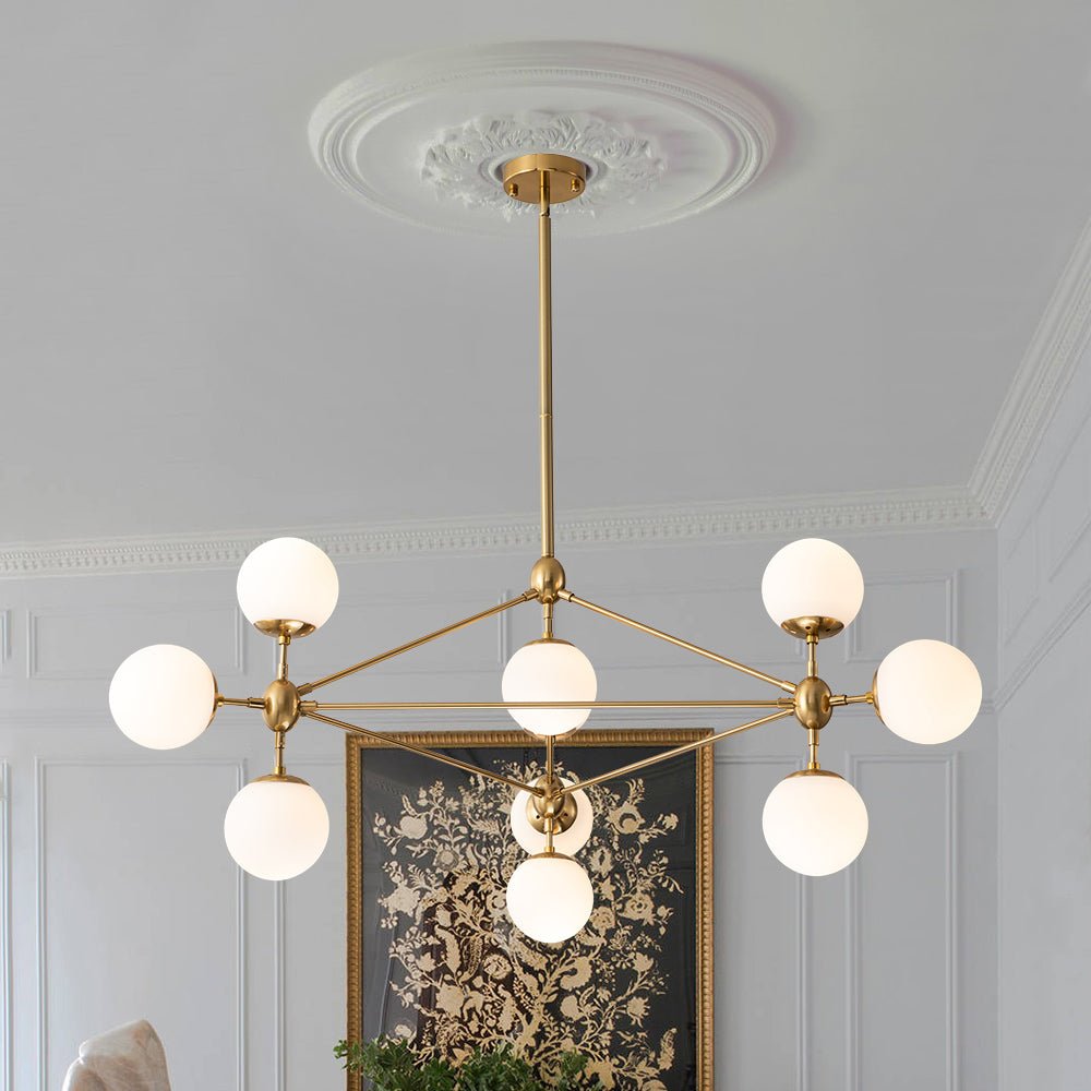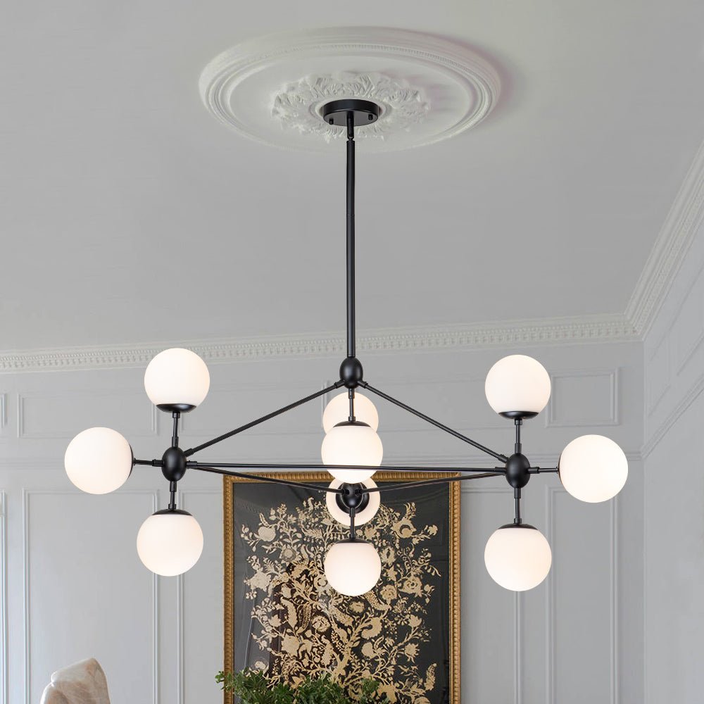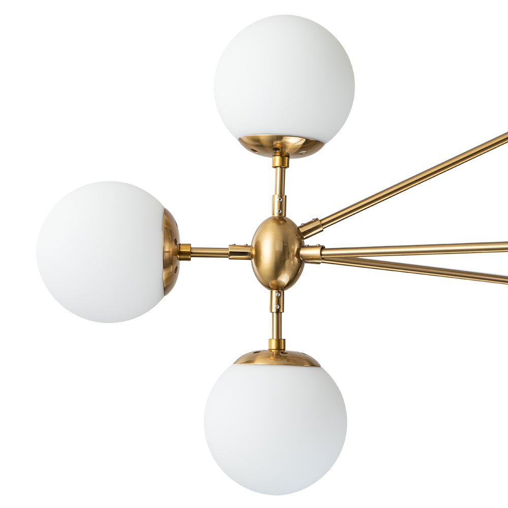 Kymmenen valoa • Opaalilasipallot • Päivitetty Sputnik-muotoilu • Geometrinen kehys • Musta/messinkiviimeistely • E26 Keskikantaiset polttimot (ei sisälly) • Kiinteä • UL-listattu