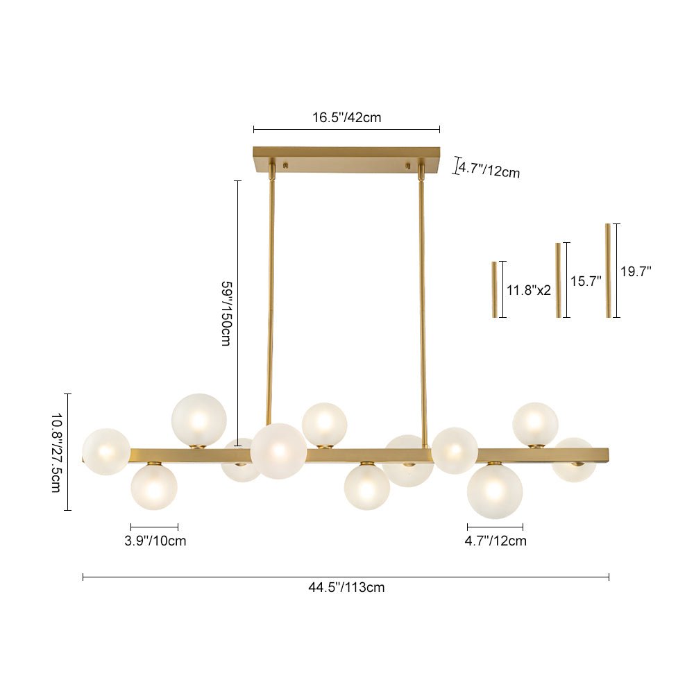 Tyylikkääseen vuosisadan puolivälin tyyliin suuntautuvassa keittiösaarekeriipuksessamme on 12 himmeää lasipalloa, jotka on levitetty vaakasuoraan lineaariseen palkkiin. Tuloksena on lumoavan eteerinen look, joka muistuttaa pillin ympärille kerääntyviä kuplia. Tämä kuplakruunu, joka on suunniteltu käytettäväksi G9-polttimoiden kanssa (ei sisälly toimitukseen), tarjoaa ihastuttavan romanttisen tunnelmavalaistuksen, joka ympäröi harjattua messinkikehystä ja maidonvalkoisia maapalloja. Täydellinen avoimiin tiloihin, tämä 12 valon messinkinen himmeä lasipallomainen lineaarinen kattokruunu lisää hämmästyttävän hienostuneisuutta, varsinkin kun se ripustetaan tärkeimpien alueiden, kuten ruokasalien, keittiösaarten, kodin baarien, tiskien ja muiden yläpuolelle.Tiedot