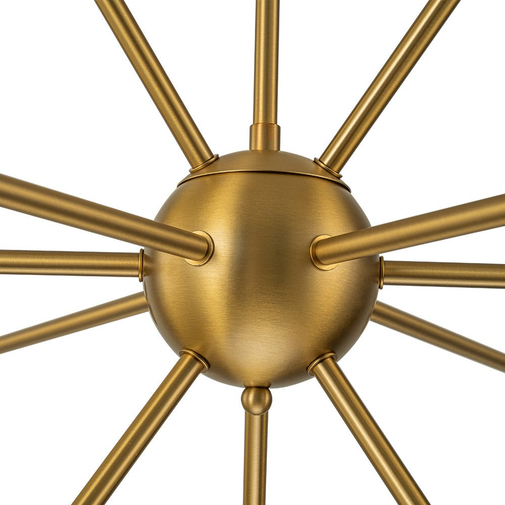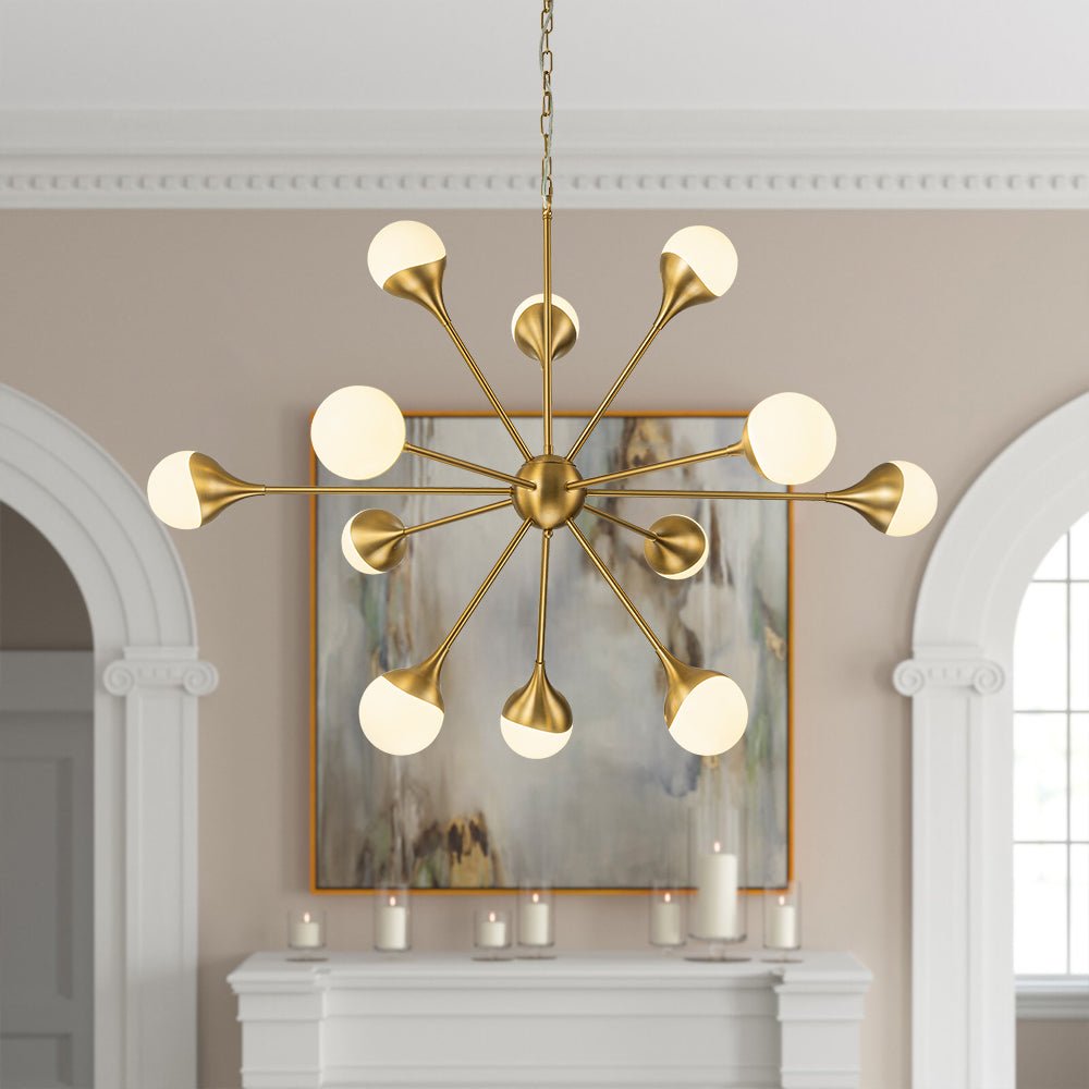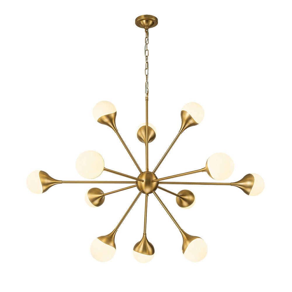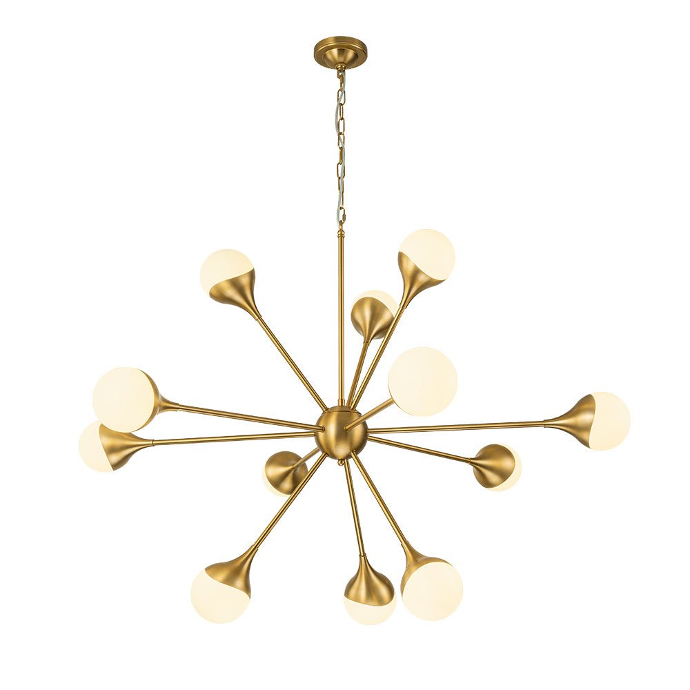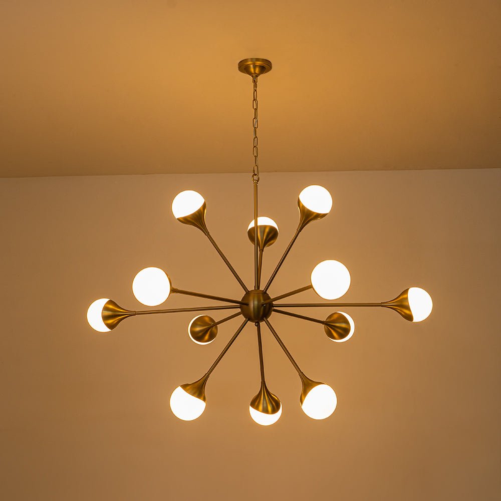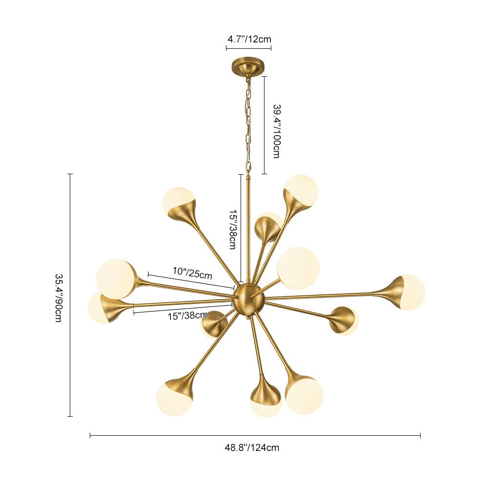 Kaksitoista valoa • Maidonvalkoiset lasipallot • Sputnik Design • Harjattu messinkiviimeistely • E26-pohjaiset polttimot (ei sisälly) • Kiinteä • UL-listattu
