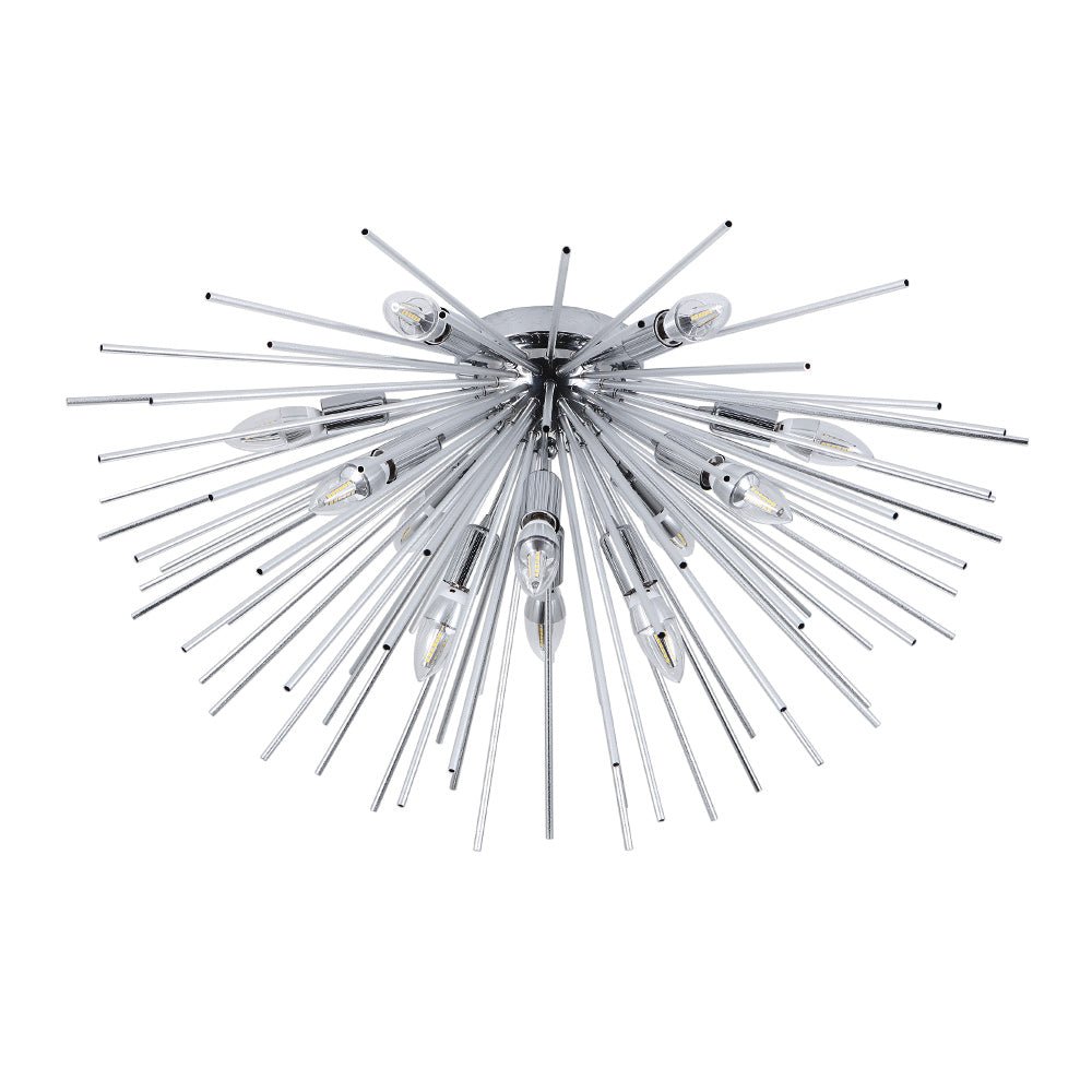 Lisää kattoon ilotulitusilta tällä sputnik-uppoasennettavalla kattokruunulla. Rohkean auringonpaisteen innoittamana tämä ilotulituskattovalaisin levittää useita ohuita putkia luoden rohkean ja näyttävän siluetin. Putken joukossa on kaksitoista E12 kynttelikköpolttimoa (ei sisälly), jotka valaisevat kirkkaasti ja saavat heijastuneen loiston kulta- tai kromiviimeistelyllä. Tämä uppoasennettava starburst-valaistus sopii täydellisesti eteiseen, makuuhuoneeseen, ruokailuhuoneeseen tai oleskelutiloihin.Tiedot