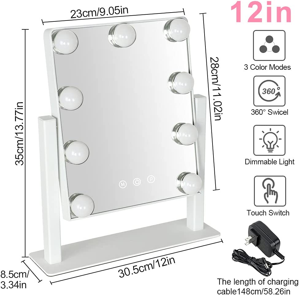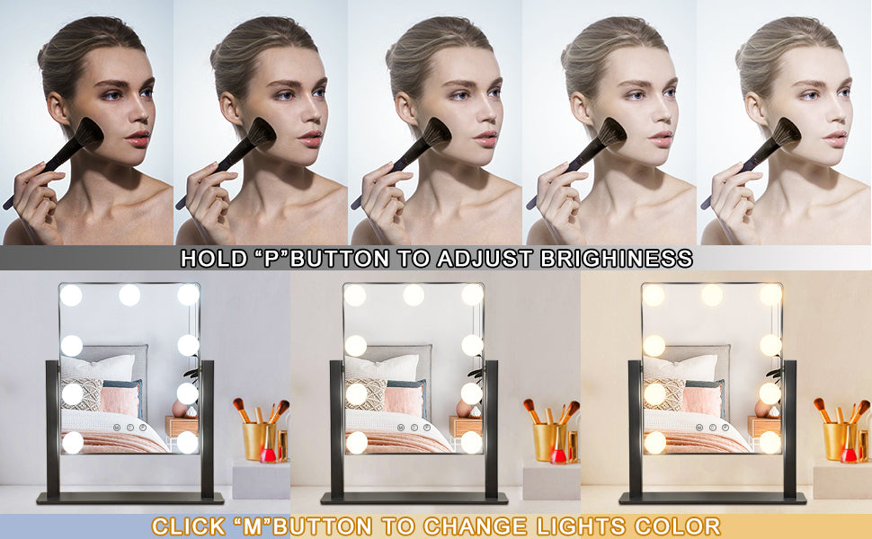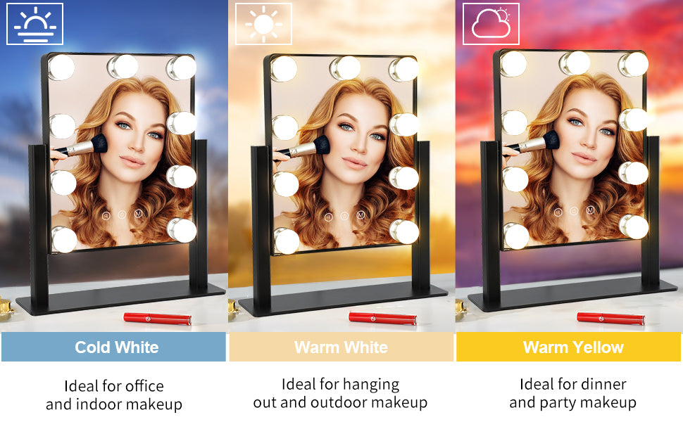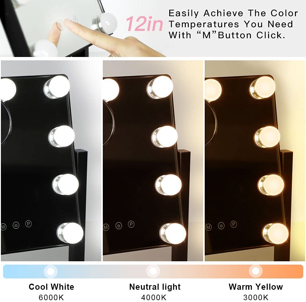 - �【Säädettävä kirkkaus ja 3 värivaloa】 Tämä meikkipeili, jossa on 3 säädettävää värivalotilaa (lämmin valkoinen 3000K / luonnonvalkoinen 4000K / kylmävalkoinen 6000K), koostuu 9 himmennettävästä LED-polttimosta varmistaakseen, että meikkisi ja varusteesi ovat virheettömät. voit tarkistaa kauniin meikkisi erilaisissa valaistusolosuhteissa.