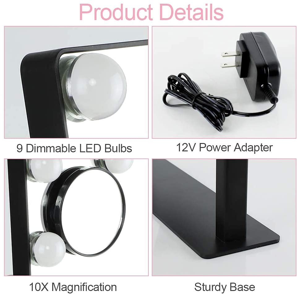 - �【Kestävät ja turvalliset materiaalit】 Tämä pöytäpeili saa virtansa 60 tuuman erikoispitkästä 12 V:n UL-sertifioidusta sovittimesta, joka on suunniteltu 9:llä ei-vaihdattavalla polttimolla. Ainutlaatuinen pudotuksenkestävä pakkaus takaa, että pieni meikkipeili on hyvässä kunnossa.___10110