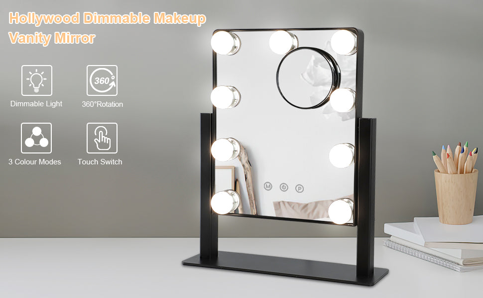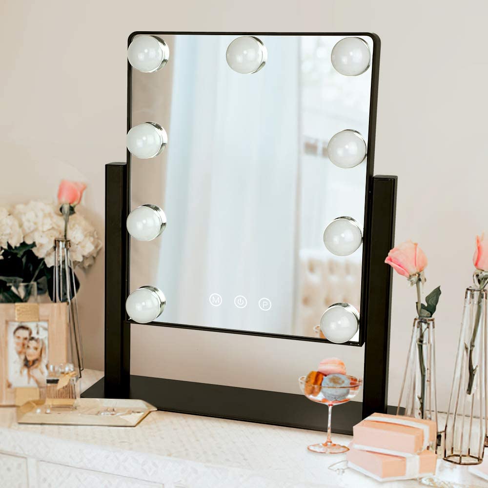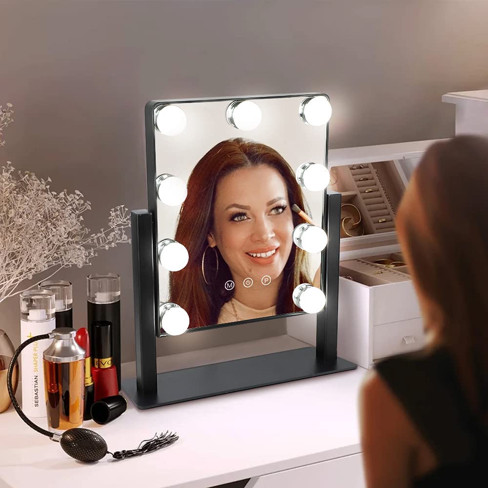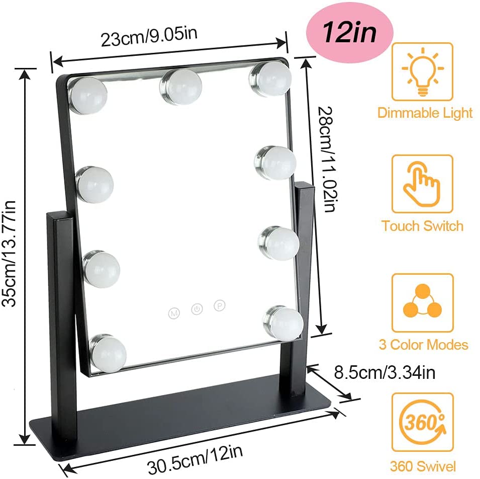 Depuley 14 x 12 Hollywoodissa valaistu meikkipeili valolla 9 himmennettyä led-polttimoa Smart Touch Control, 3 värillistä valaistustilaa, irrotettava 10X suurennus 360°, 35 x 30 cm (musta)