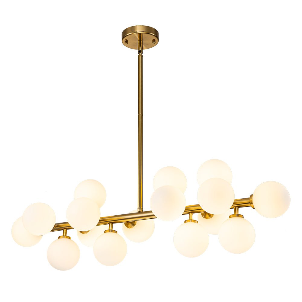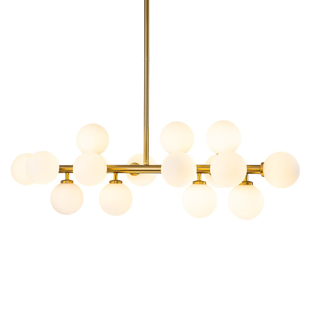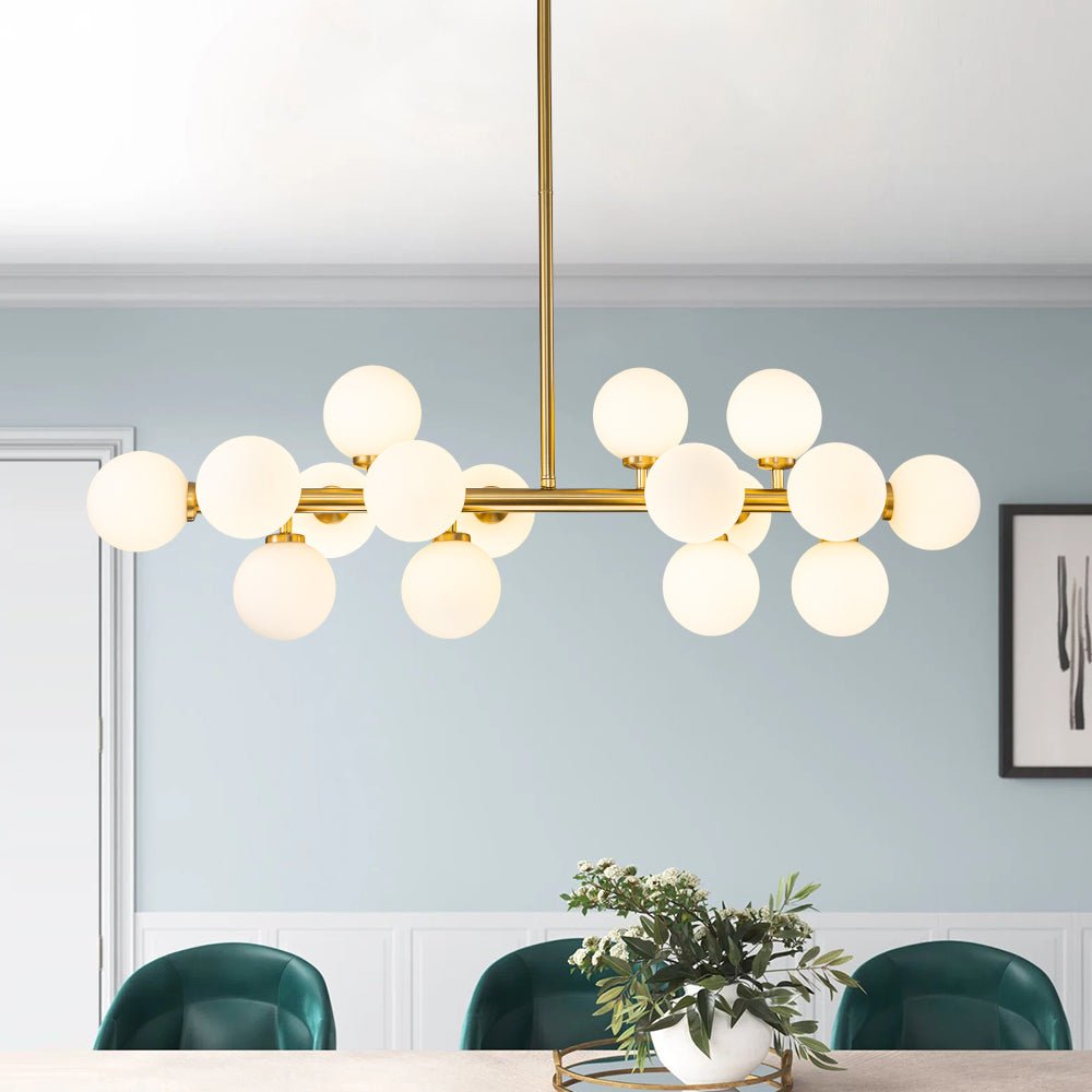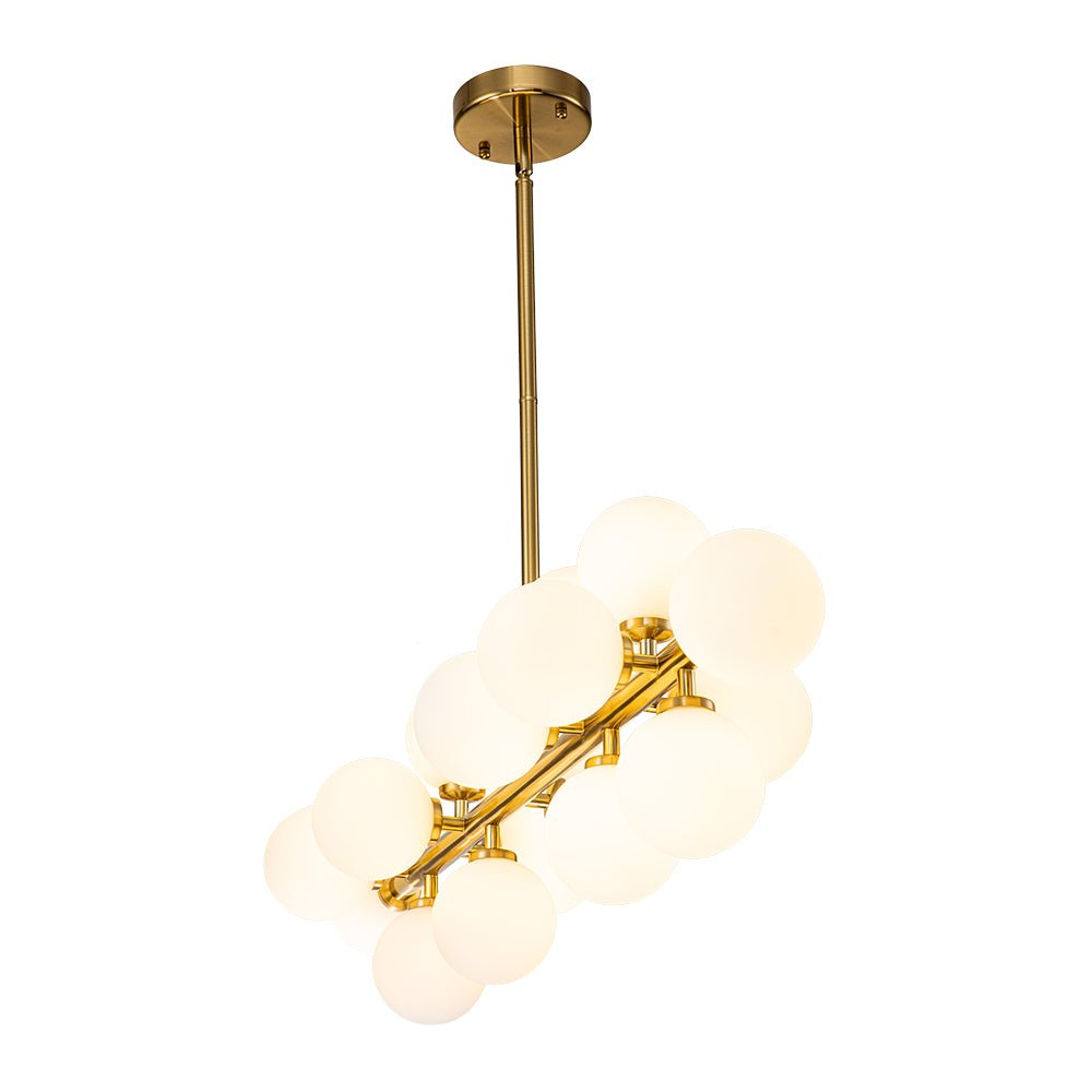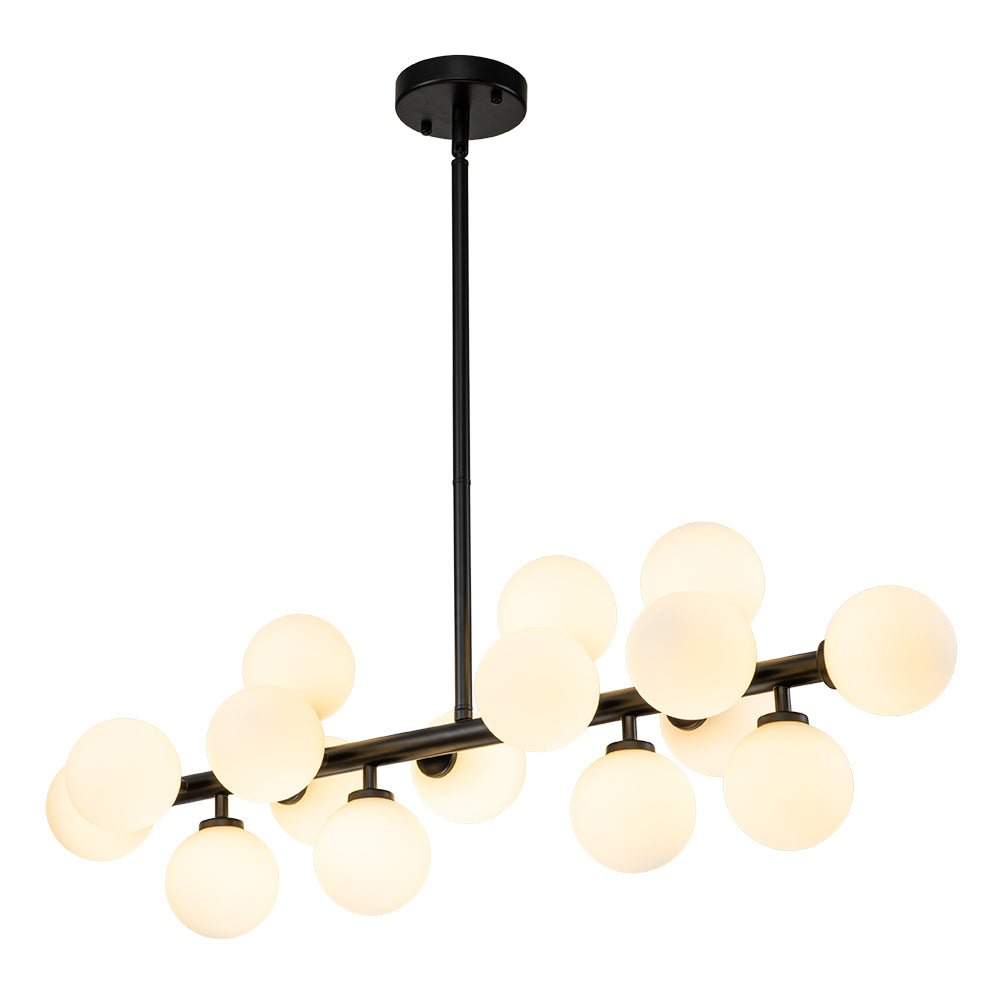 Liuku vuosisadan puolivälin modernin eleganssin maailman läpi tämän ylellisen 16-valoisen kuplakruunun avulla. Tämän houkuttelevan sputnik-kattokruunun lineaarinen runko tarjoaa täydellisen taustan sen ihanille, siroille opaalilasipalloille, jotka koristavat sitä kuin herkkiä kipsinkukkia. Saatavana täyteläisenä messinkinä tai mustana viimeistelynä, tämä hieno 16 valon maidonvalkoinen lasipallomainen lineaarinen kattokruunu tarjoaa varmasti hienostuneen ilmeen ja kodikkaan tunnelman, joka parantaa mitä tahansa eteistä, ruokailutilaa, olohuonetta, keittiösaareketta tai makuuhuonetta.Tiedot