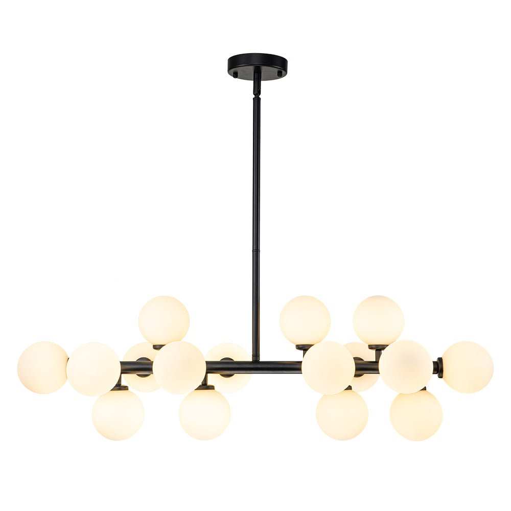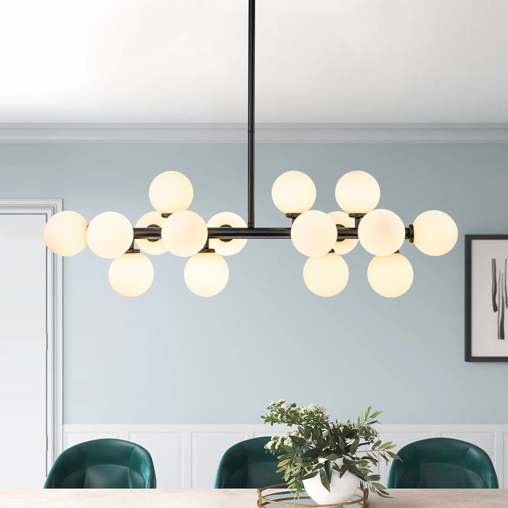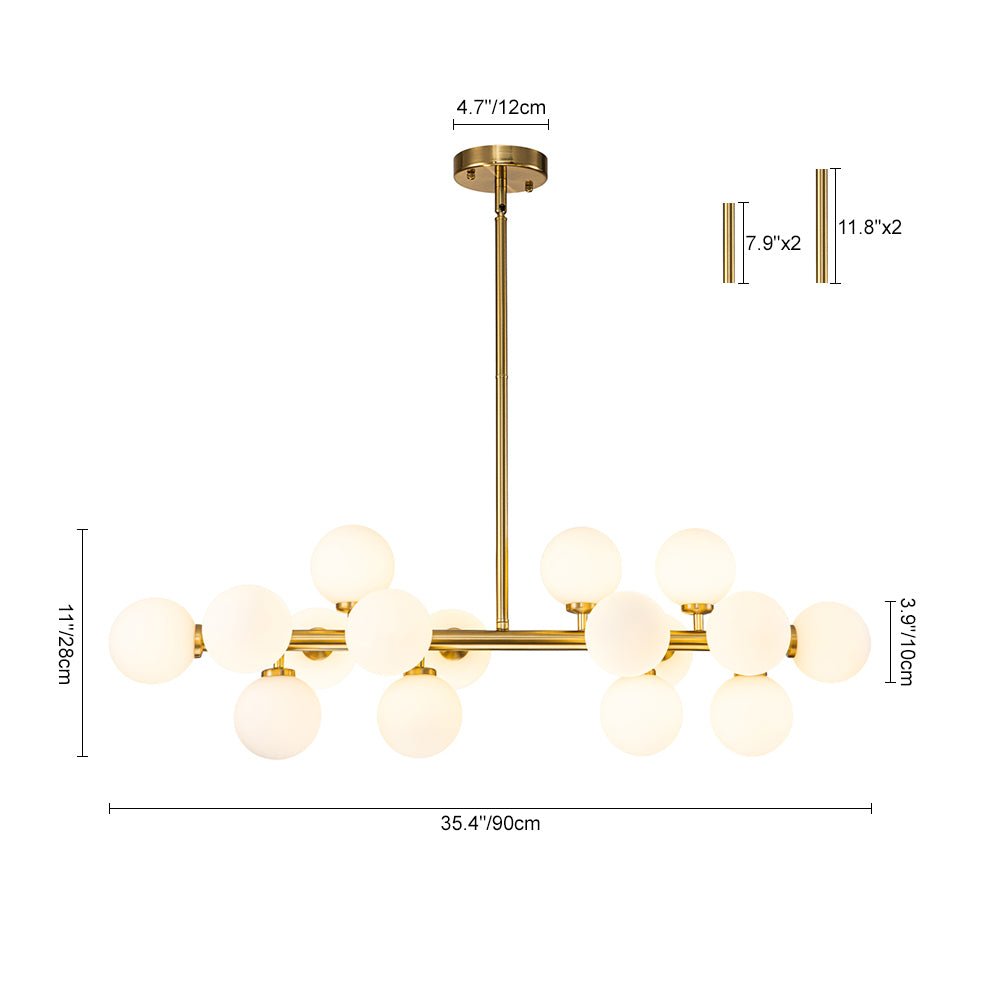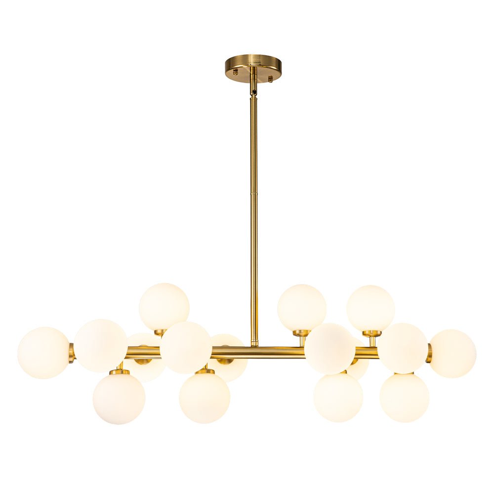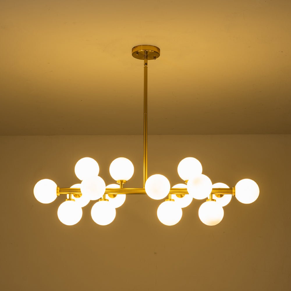 Liuku vuosisadan puolivälin modernin eleganssin maailman läpi tämän ylellisen 16-valoisen kuplakruunun avulla. Tämän houkuttelevan sputnik-kattokruunun lineaarinen runko tarjoaa täydellisen taustan sen ihanille, siroille opaalilasipalloille, jotka koristavat sitä kuin herkkiä kipsinkukkia. Saatavana täyteläisenä messinkinä tai mustana viimeistelynä, tämä hieno 16 valon maidonvalkoinen lasipallomainen lineaarinen kattokruunu tarjoaa varmasti hienostuneen ilmeen ja kodikkaan tunnelman, joka parantaa mitä tahansa eteistä, ruokailutilaa, olohuonetta, keittiösaareketta tai makuuhuonetta.Tiedot