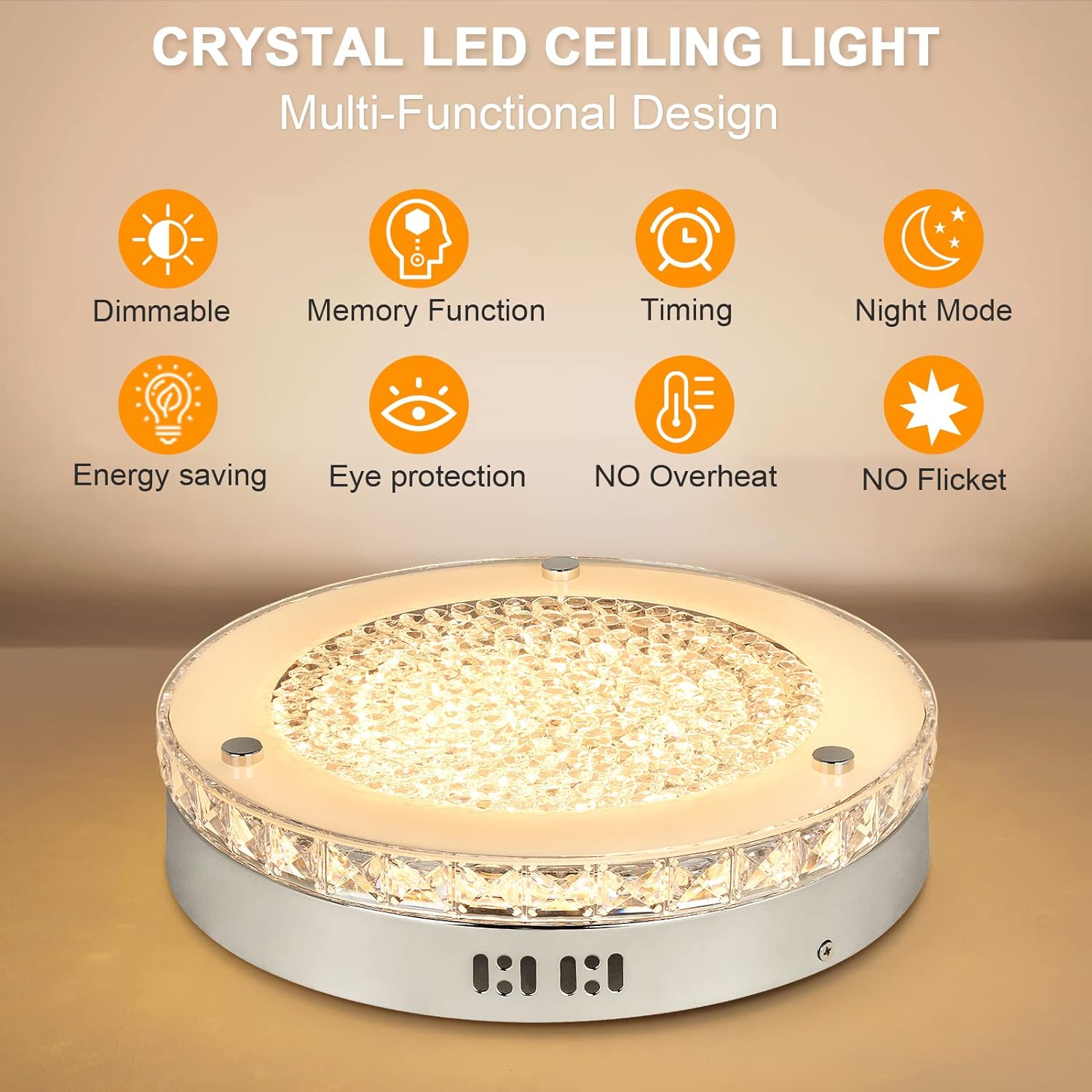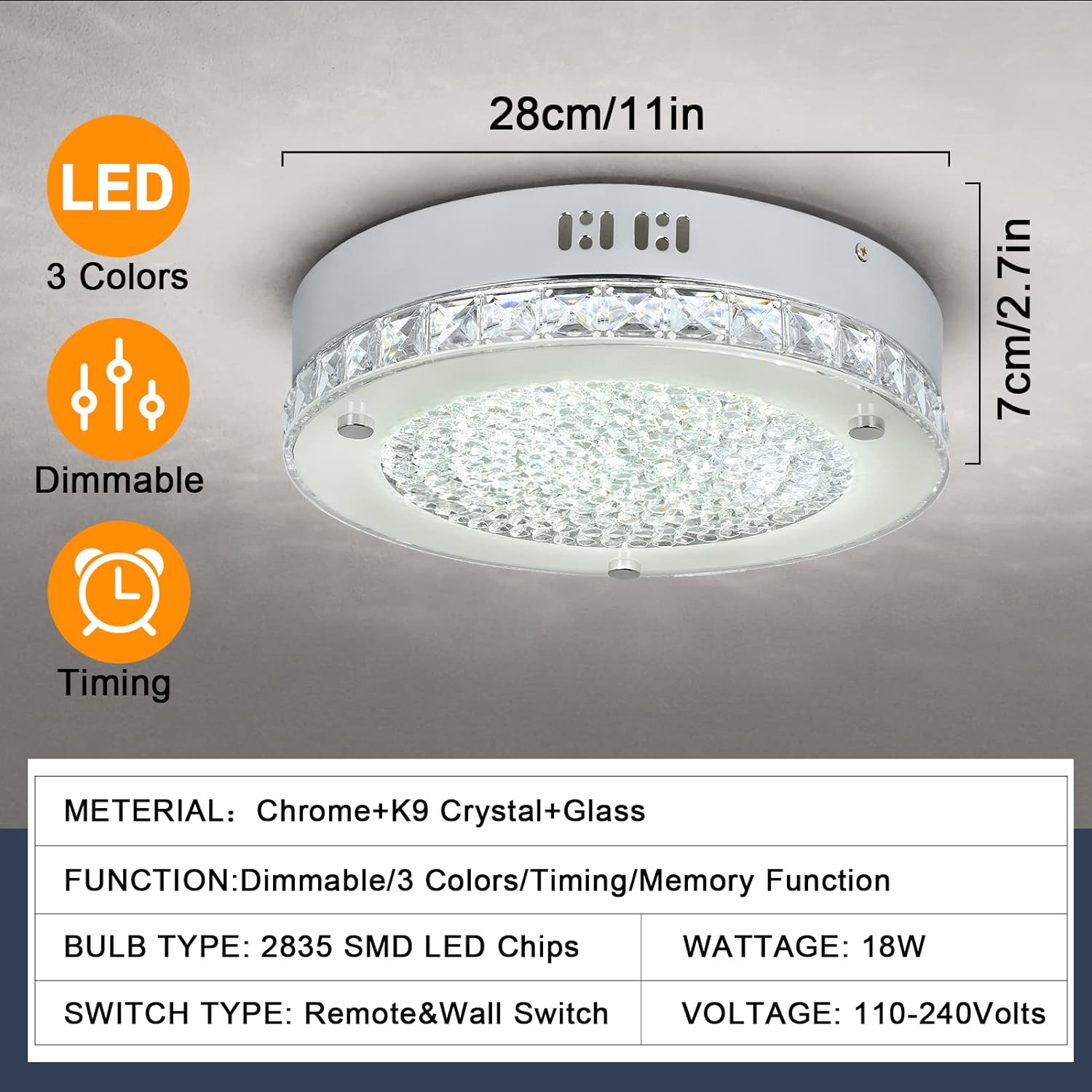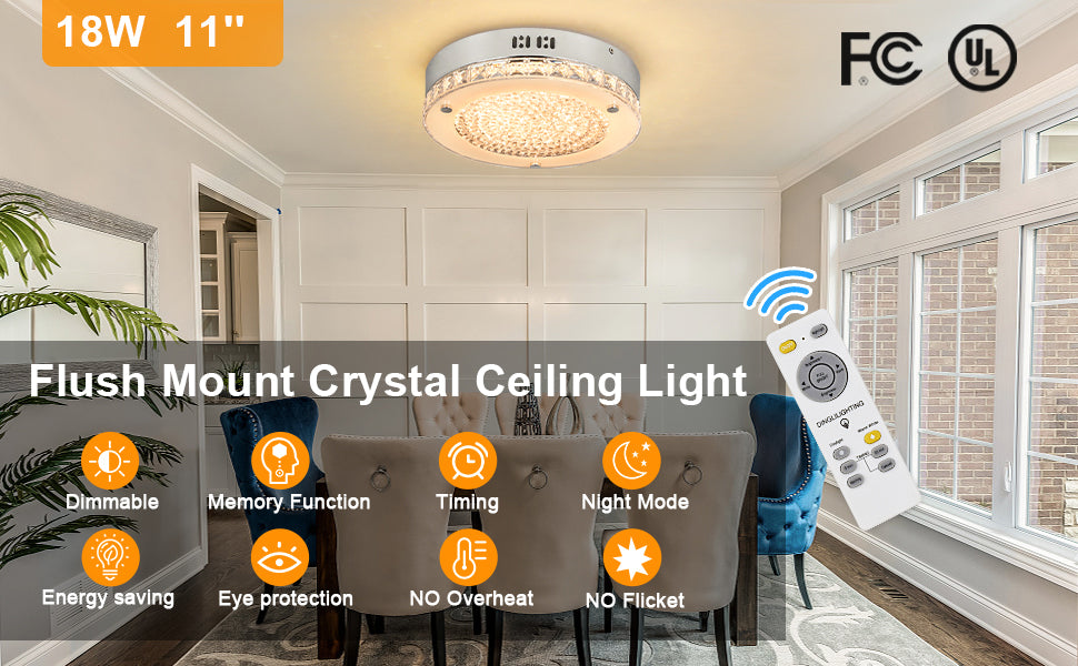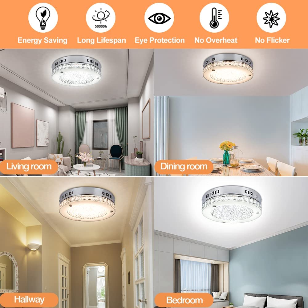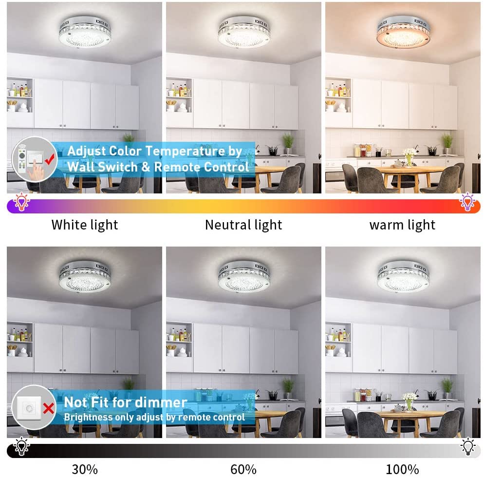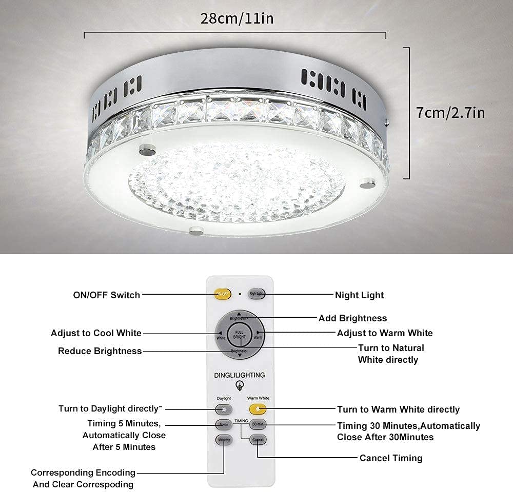 DINGLILIGHTING 18 W LED-kristalli uppoasennuslamppu kaukosäätimellä, 11 tuuman moderni himmennettävä läheltä kattoa valaisin, 3000K-6000K keittiöön, makuuhuoneeseen, eteiseen, 1440LM, 3 väriä vaihdettava