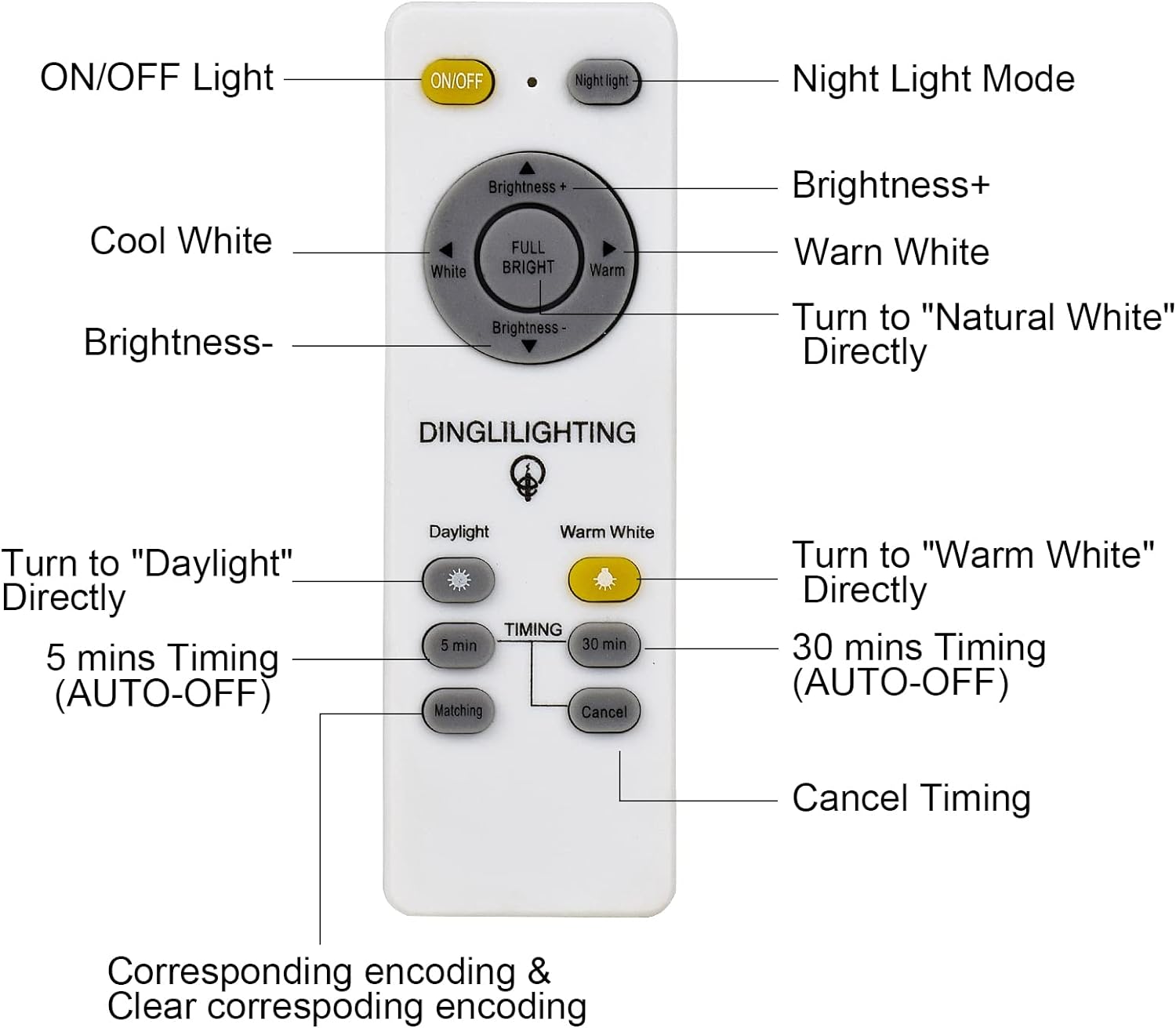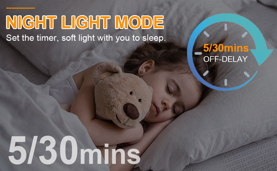 - Yövalo: Säädä yövalotilaa kaukosäätimellä, valo on säädetty 3000K lämpimän valkoiseen valoon ja 10 % kirkkauteen.