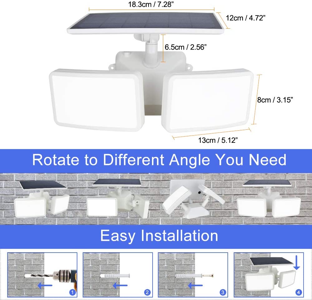 4. Joustava & IP65 Vesitiivis: Anturin valon ja aurinkopaneelin asennuskulmaa voidaan säätää 180 asteeseen, voit säätää sitä aurinkoiseen kulmaan saadaksesi suoraa auringonvaloa ja varmistaa, että se latautuu tehokkaasti. IP65-vesitiiviysluokitus varmistaa, että anturin valo toimii kunnolla sateessa, lumessa ja kuumassa tai kylmässä ympäristössä.