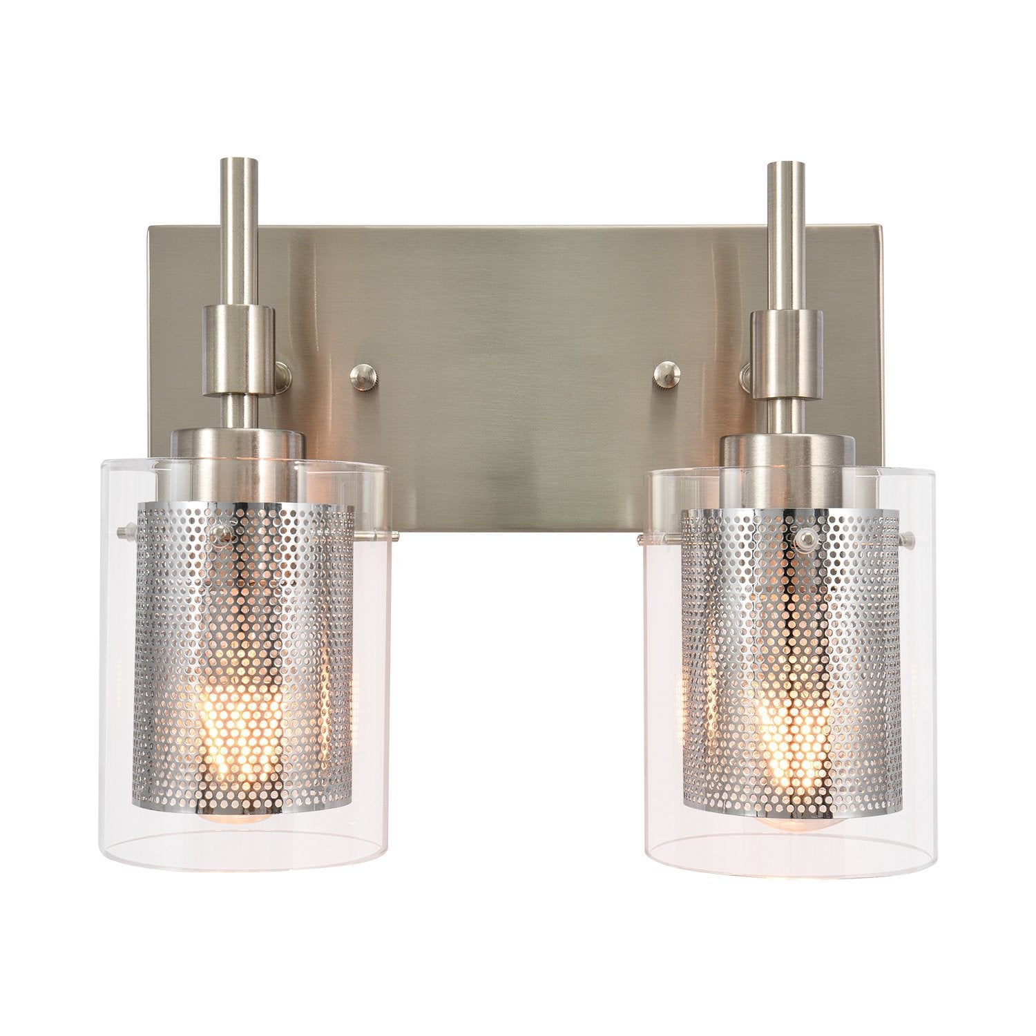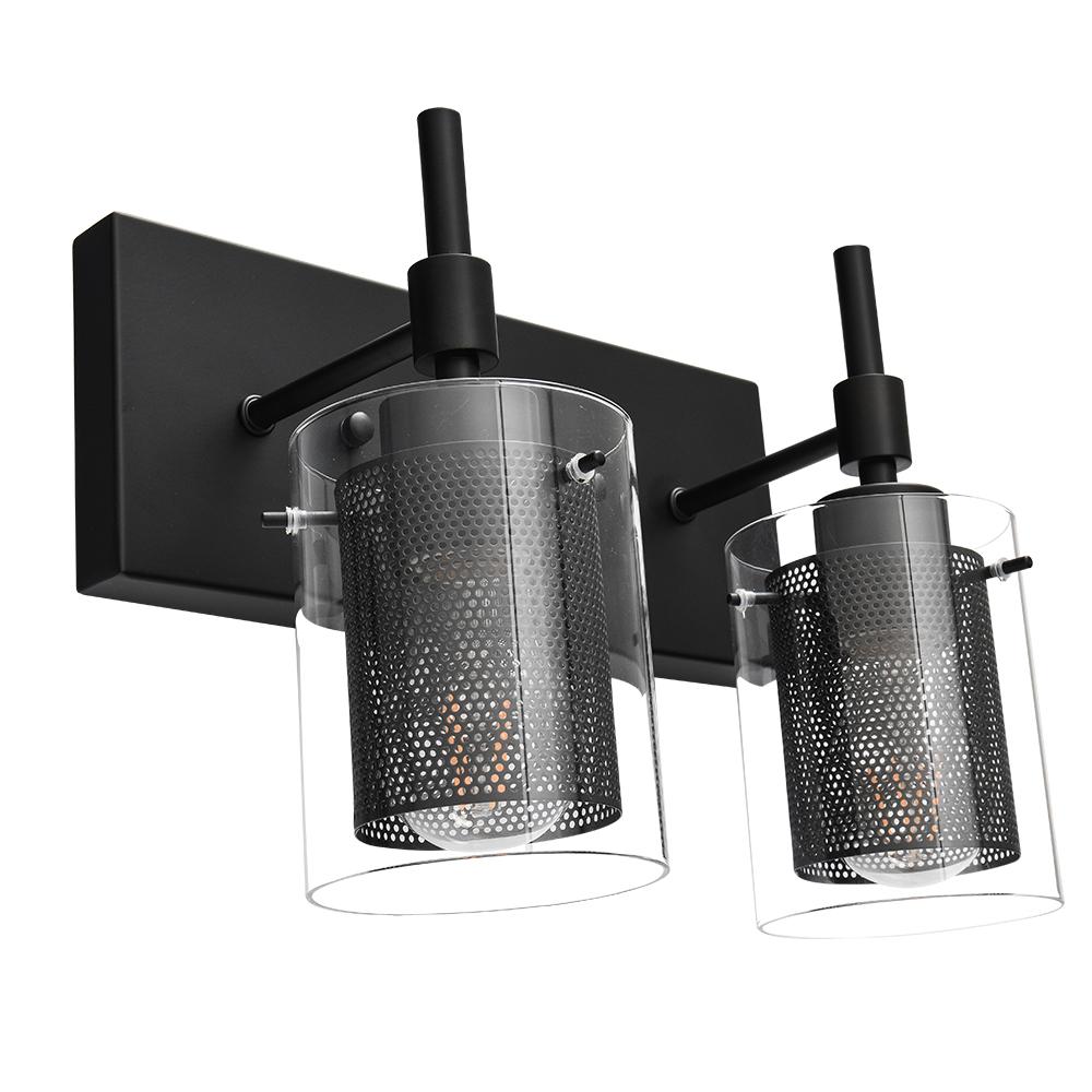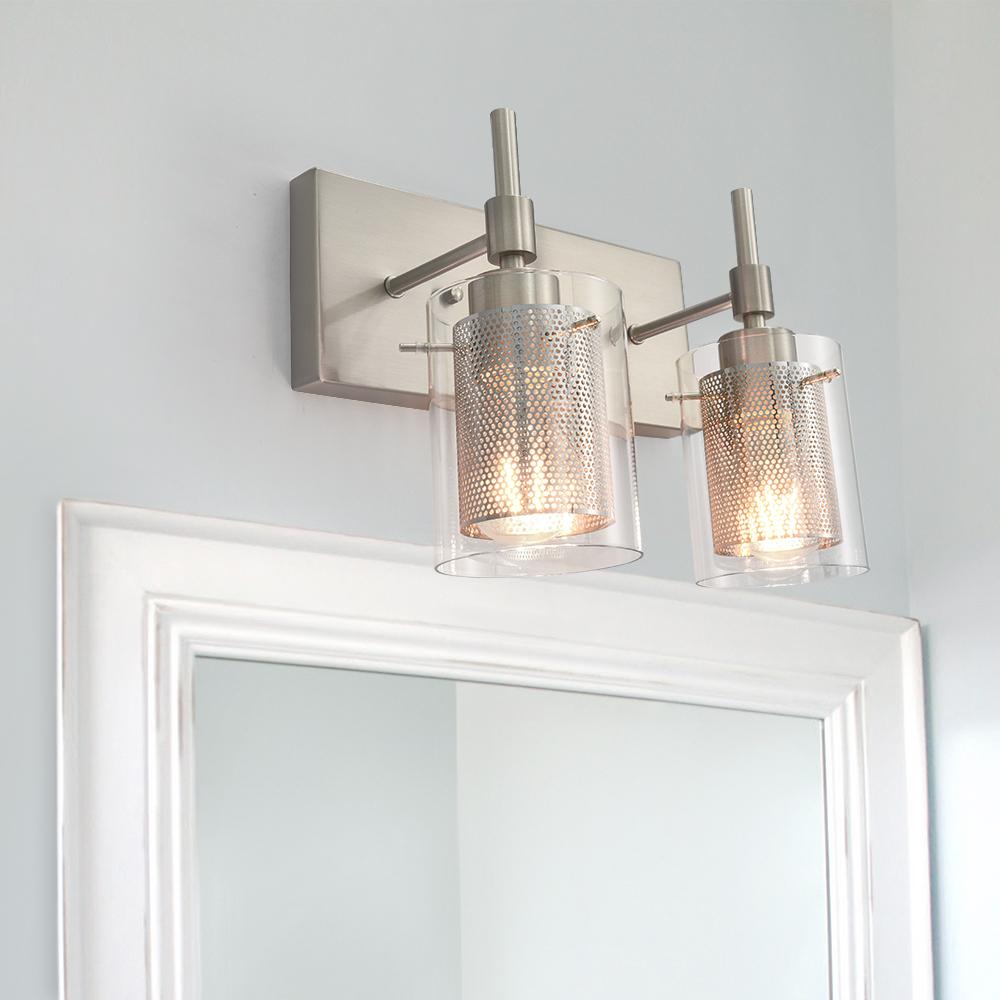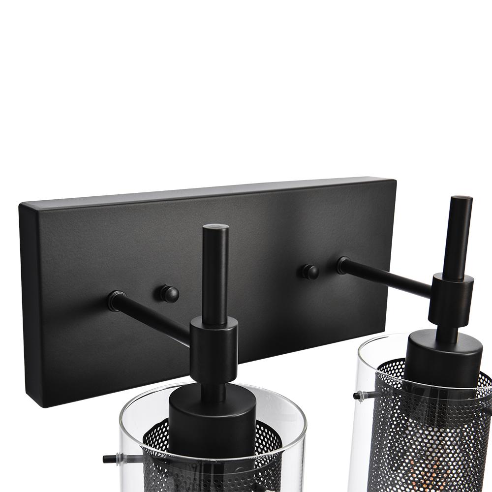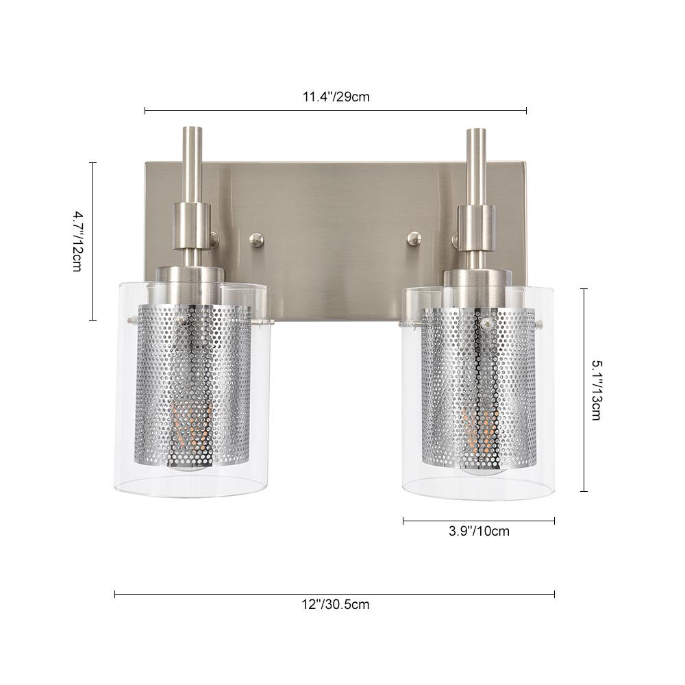 Muodin ja tekstuurin täydellinen yhdistelmä, tämä 2-valaisinsylinterinen meikkiseinävalaisin tuo sekä toimivuutta että tyyliä kylpyhuoneeseen, meikkipöytään, käytävään, eteiseen tai mihin tahansa muuhun oleskelutilaan. Kaksi E26/E27 keskikantaista polttimoa (ei sisälly) on varjostettu kirkkaasta lasista ja verkosta tehdyillä sylintereillä tässä upeassa turhamaisessa seinävalaisimessa. Verkkojen avulla tämä lasiseinävalaisin antaa häikäisemättömän valaistuksen ja luo lämpimän tunnelman. Saatavana kahdessa eri viimeistelyssä, herkkä nikkeli parantaa tyylikästä kosketusta, kun taas musta metalliviimeistely esittelee viileän sävyn. Voit kiinnittää tämän 2-kevyisen meikkivalaisimen ylös- tai alaspäin kokonaisuuden mukaan.Detail
