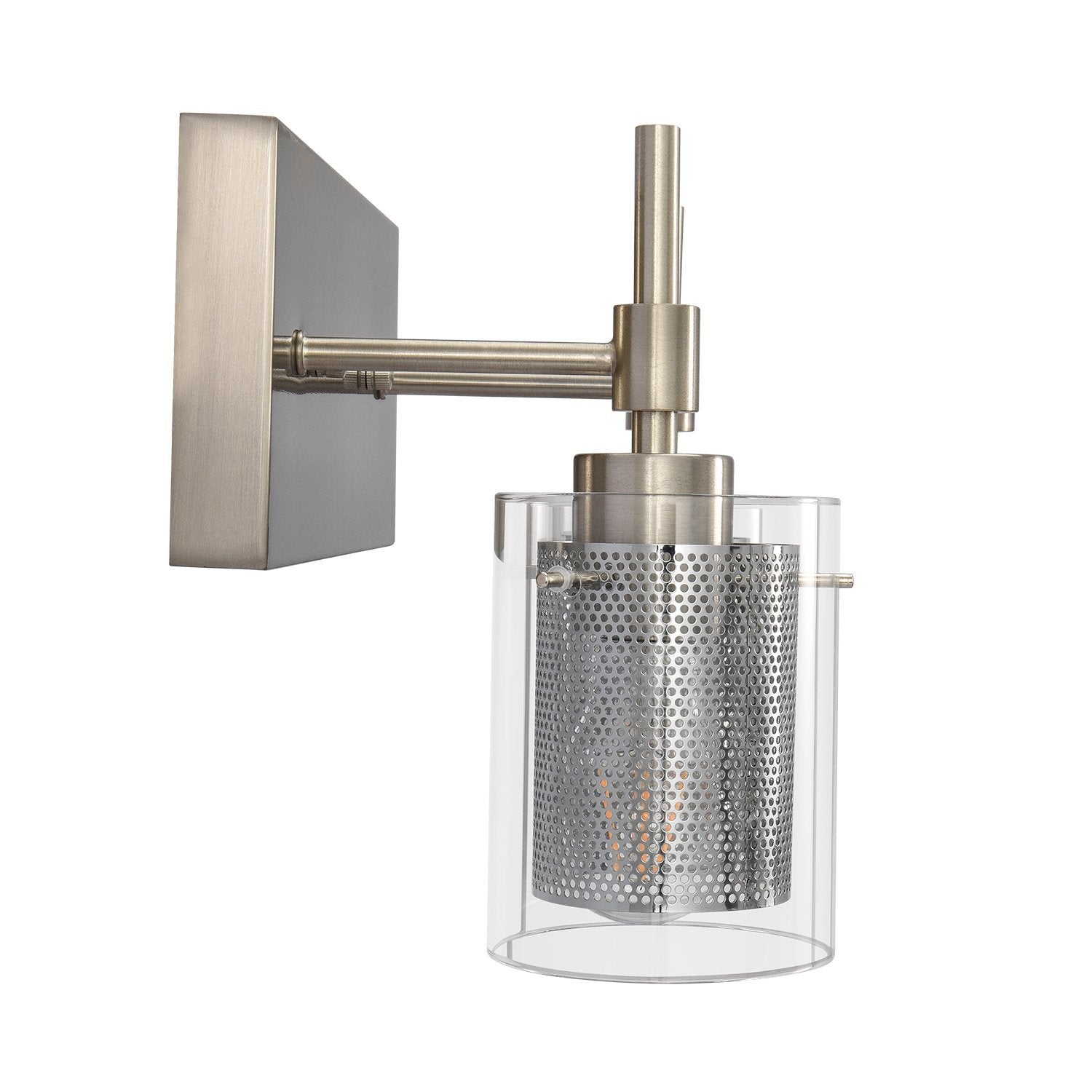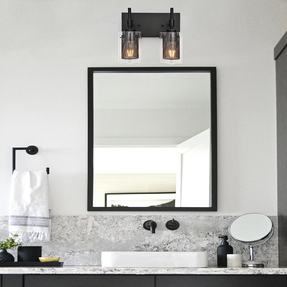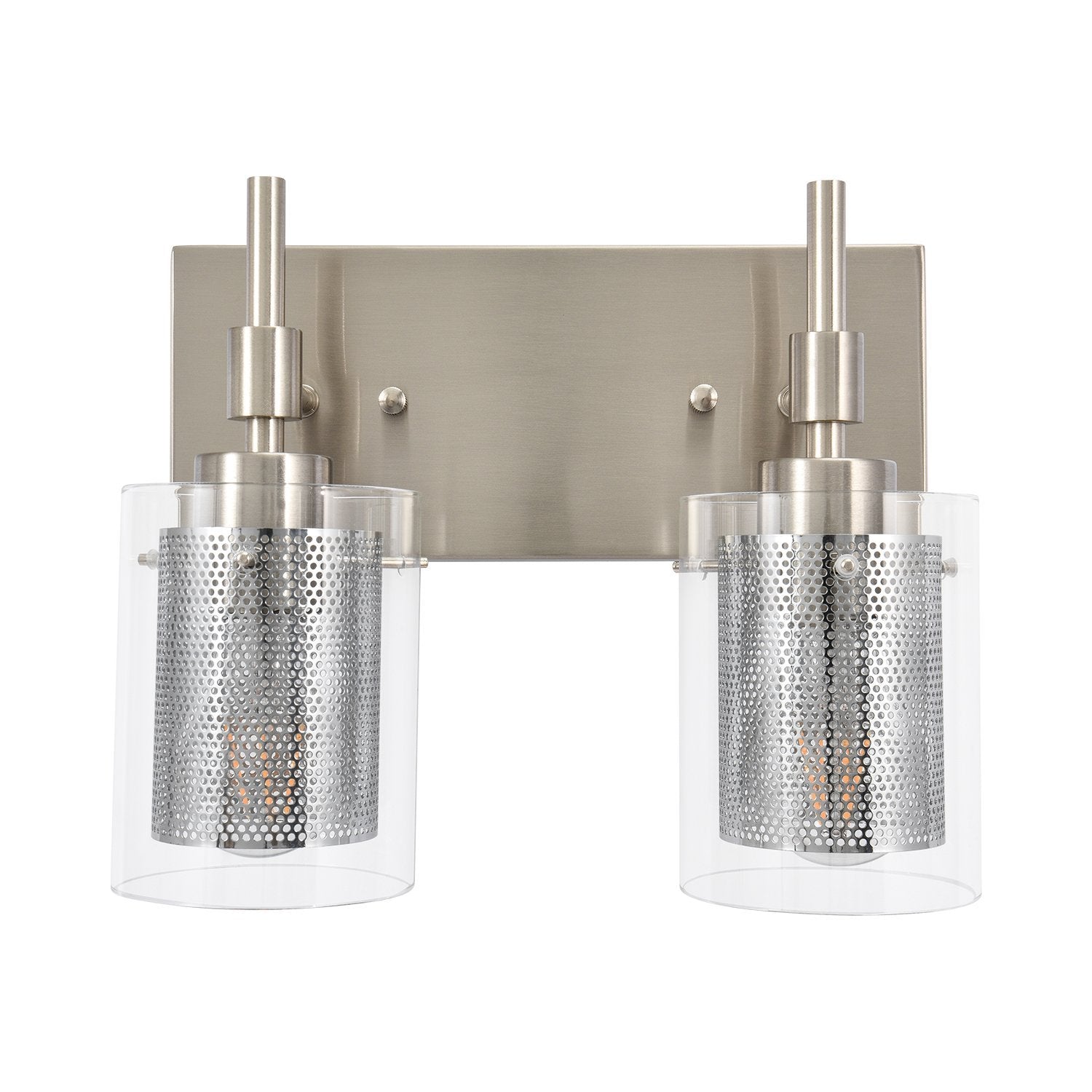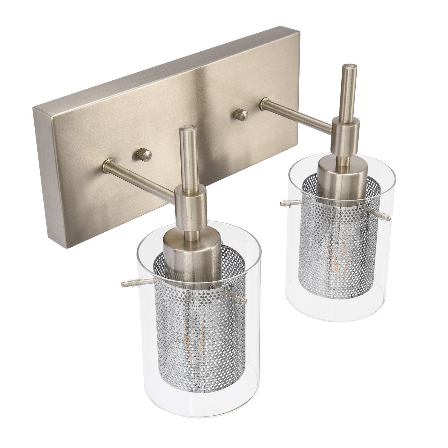 Muodin ja tekstuurin täydellinen yhdistelmä, tämä 2-valaisinsylinterinen meikkiseinävalaisin tuo sekä toimivuutta että tyyliä kylpyhuoneeseen, meikkipöytään, käytävään, eteiseen tai mihin tahansa muuhun oleskelutilaan. Kaksi E26/E27 keskikantaista polttimoa (ei sisälly) on varjostettu kirkkaasta lasista ja verkosta tehdyillä sylintereillä tässä upeassa turhamaisessa seinävalaisimessa. Verkkojen avulla tämä lasiseinävalaisin antaa häikäisemättömän valaistuksen ja luo lämpimän tunnelman. Saatavana kahdessa eri viimeistelyssä, herkkä nikkeli parantaa tyylikästä kosketusta, kun taas musta metalliviimeistely esittelee viileän sävyn. Voit kiinnittää tämän 2-kevyisen meikkivalaisimen ylös- tai alaspäin kokonaisuuden mukaan.Detail