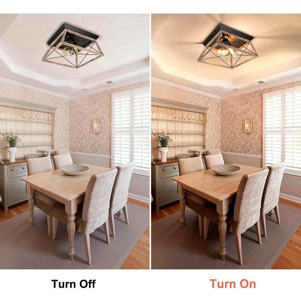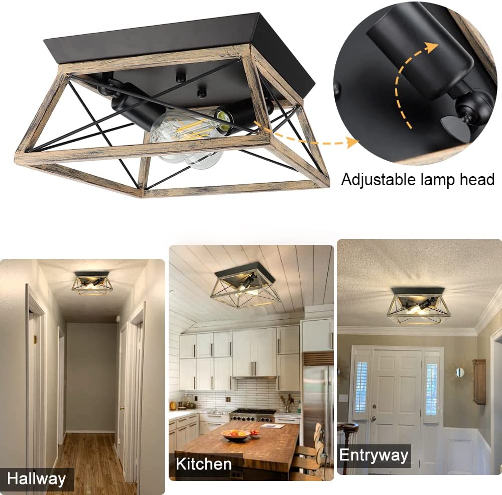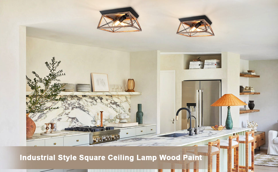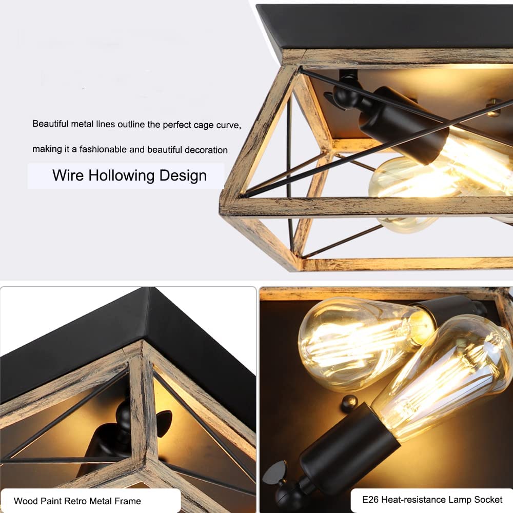 DLLT teollinen uppoasennettava kattovalaisin, neliönmuotoinen maalaistalo 2-valoa lähellä kattoa, maalaismainen metallikattolamppu puu-/mustamaalauksella keittiön makuuhuoneeseen, E26-jalusta