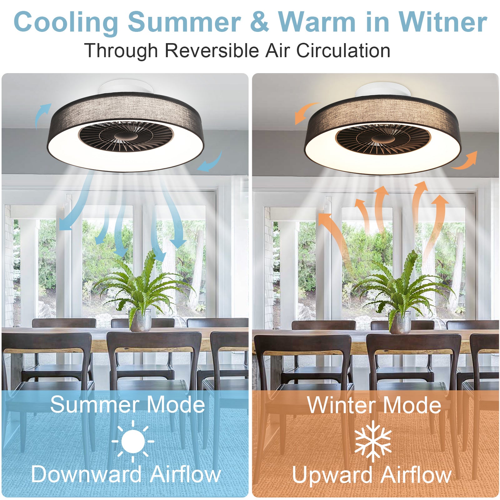 - ✤Käännettävä ja hiljainen moottori✤ Uppoasennettava kattotuuletin on varustettu kuiskuvalla tuulella toimivalla tasavirtamoottorilla, joka toimii äänettömästi. Voit vaihtaa kätevästi alas- ja ylösvedon tilojen välillä, joten se sopii kaikkiin vuodenaikoihin. Läpinäkyvät 5 terää täydentävät päivittäistä sisustustasi ja pitävät huoneesi tyylikkään ja tyylikkään näköisenä.