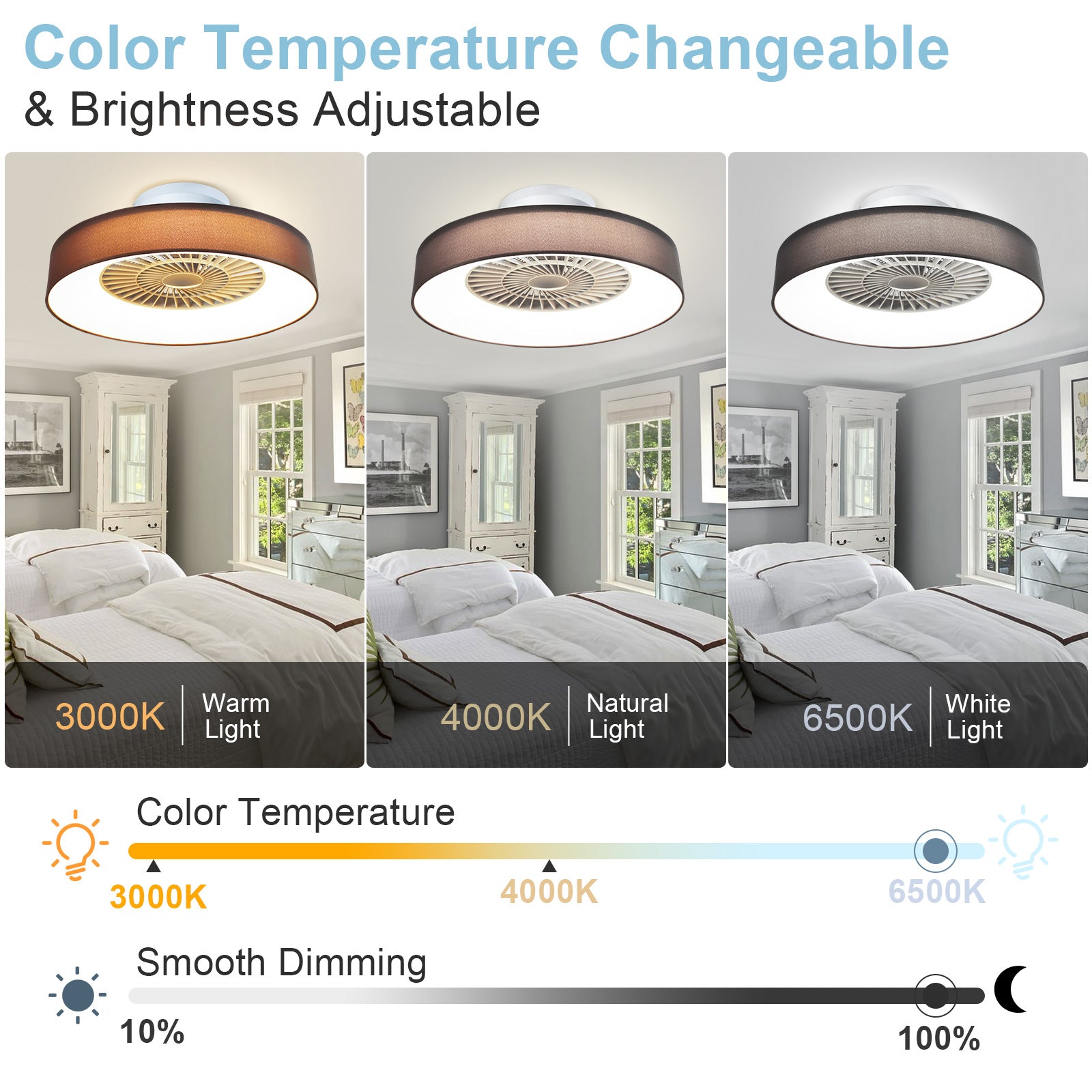 - ✤Himmennettävä LED-valo✤ LED-valoja voidaan ohjata kaukosäätimellä, ja niiden kirkkaustasot vaihtelevat 10 %:sta 100 %:iin ja värivaihtoehdot ovat lämmin, neutraali ja valkoinen.