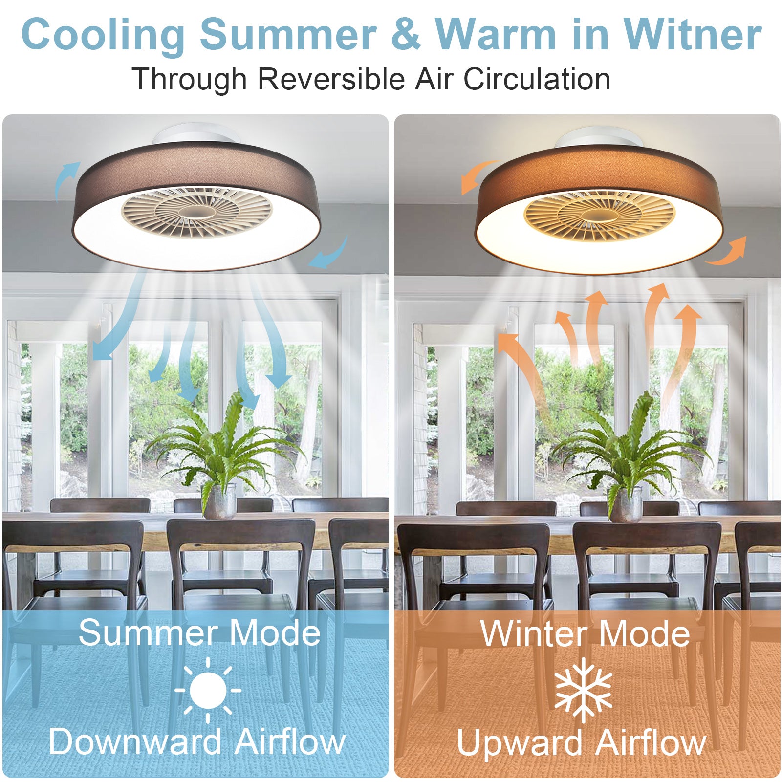 - ✤Käännettävä ja hiljainen moottori✤ Uppoasennettava kattotuuletin on varustettu kuiskuvalla tuulella toimivalla tasavirtamoottorilla, joka toimii äänettömästi. Voit vaihtaa kätevästi alas- ja ylösvedon tilojen välillä, joten se sopii kaikkiin vuodenaikoihin. Läpinäkyvät 5 terää täydentävät päivittäistä sisustustasi ja pitävät huoneesi tyylikkään ja tyylikkään näköisenä.