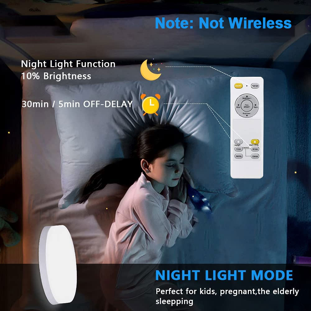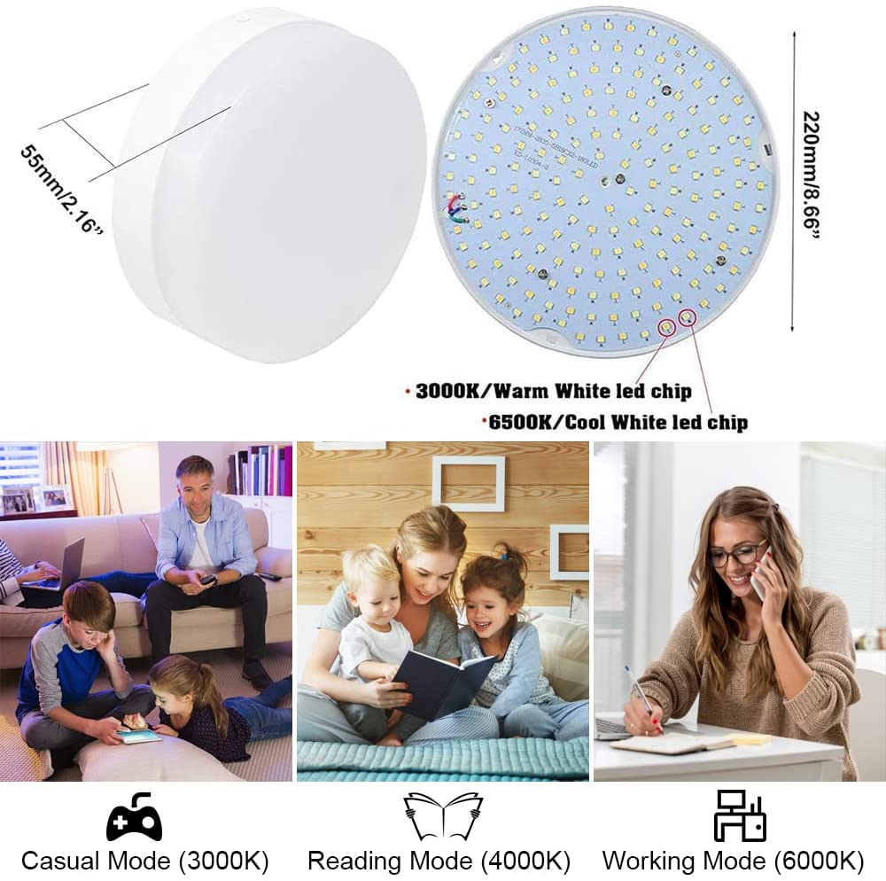- 【Himmennettävä ja 3 väriä vaihdettava】: Kaukosäädin säätää himmennettävän kirkkauden ja 3 värin lämpötilan mielesi mukaan (3000K lämmin valkoinen, 4500K neutraali valkoinen, 6000K kylmä valkoinen). Lisäksi led-kattovalaisimessamme on yövalotila ja ajoituksen suunnittelu. Voit valita 5 minuutin ja 30 minuutin väliltä tarpeidesi mukaan. (Ei langaton/Ei paristokäyttöinen/Ei liiketunnistinta)