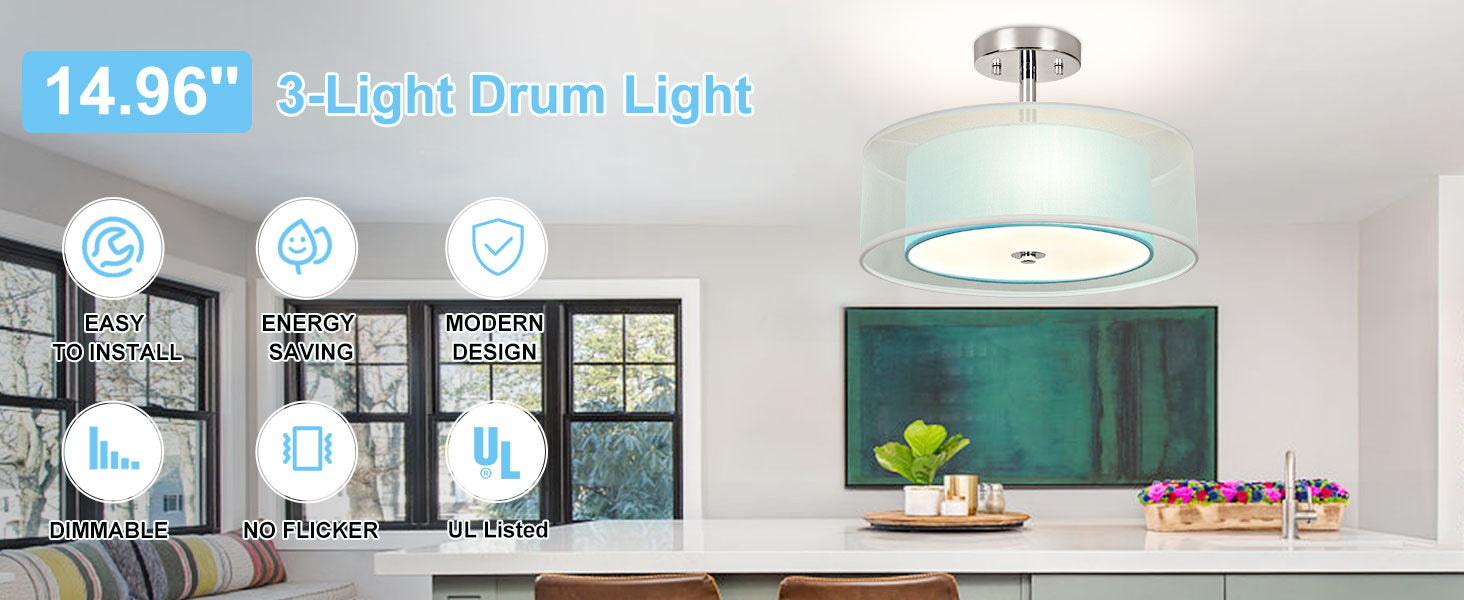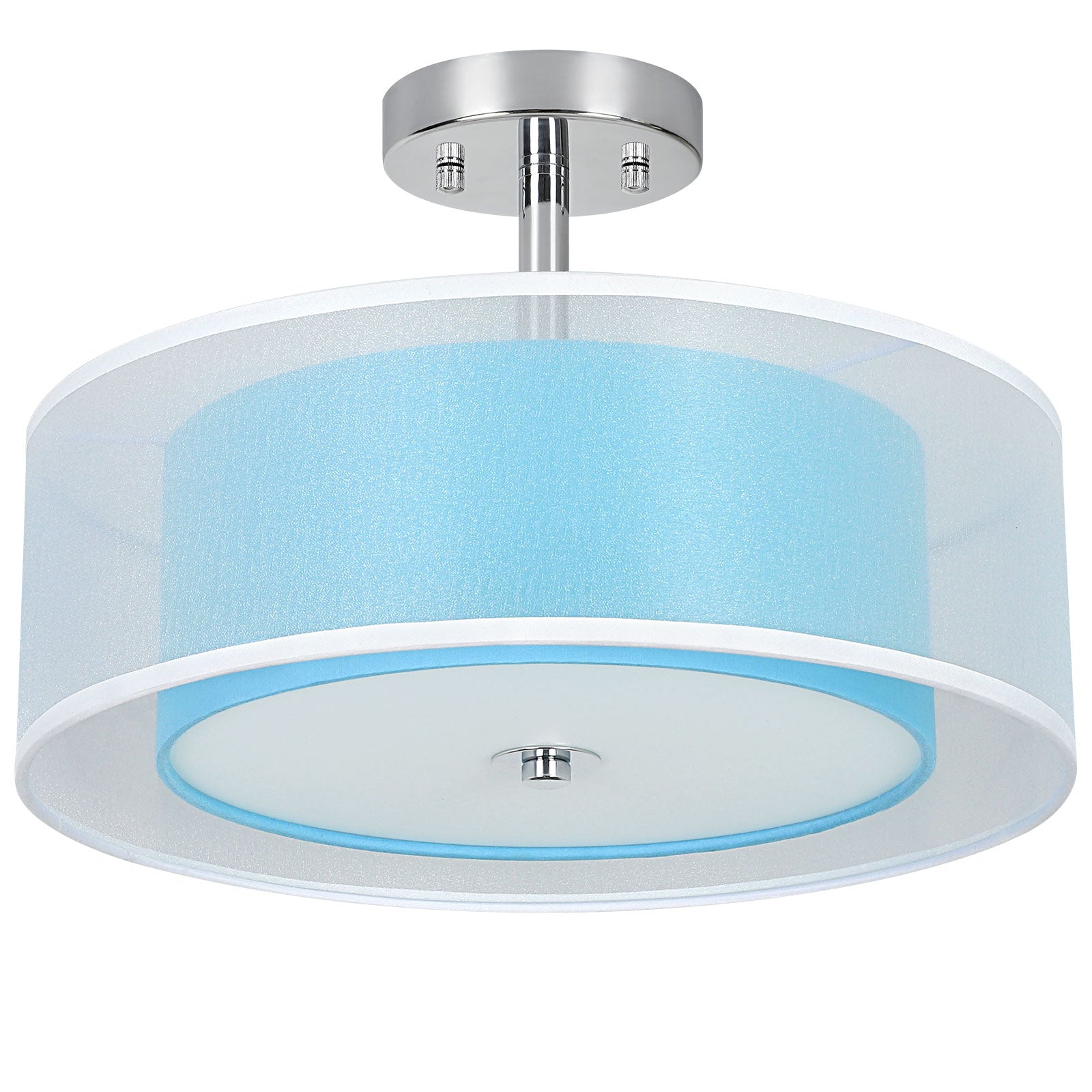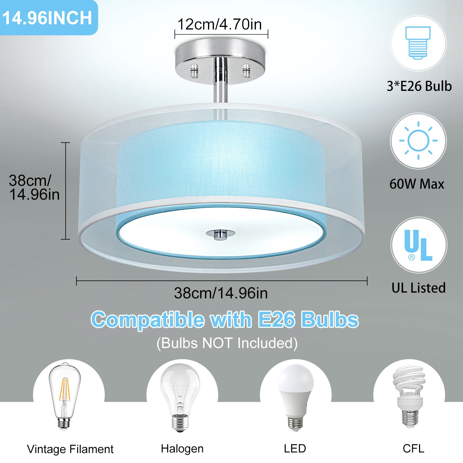 3-kevyt, puolitasossa asennettava kattovalaisin, 15 tuuman sininen rumpuvalaisin, kattoon ripustettu kaksinkertainen kangasvarjostin, moderni lähellä kattoa oleva valaisin olohuoneeseen Makuuhuone Kei