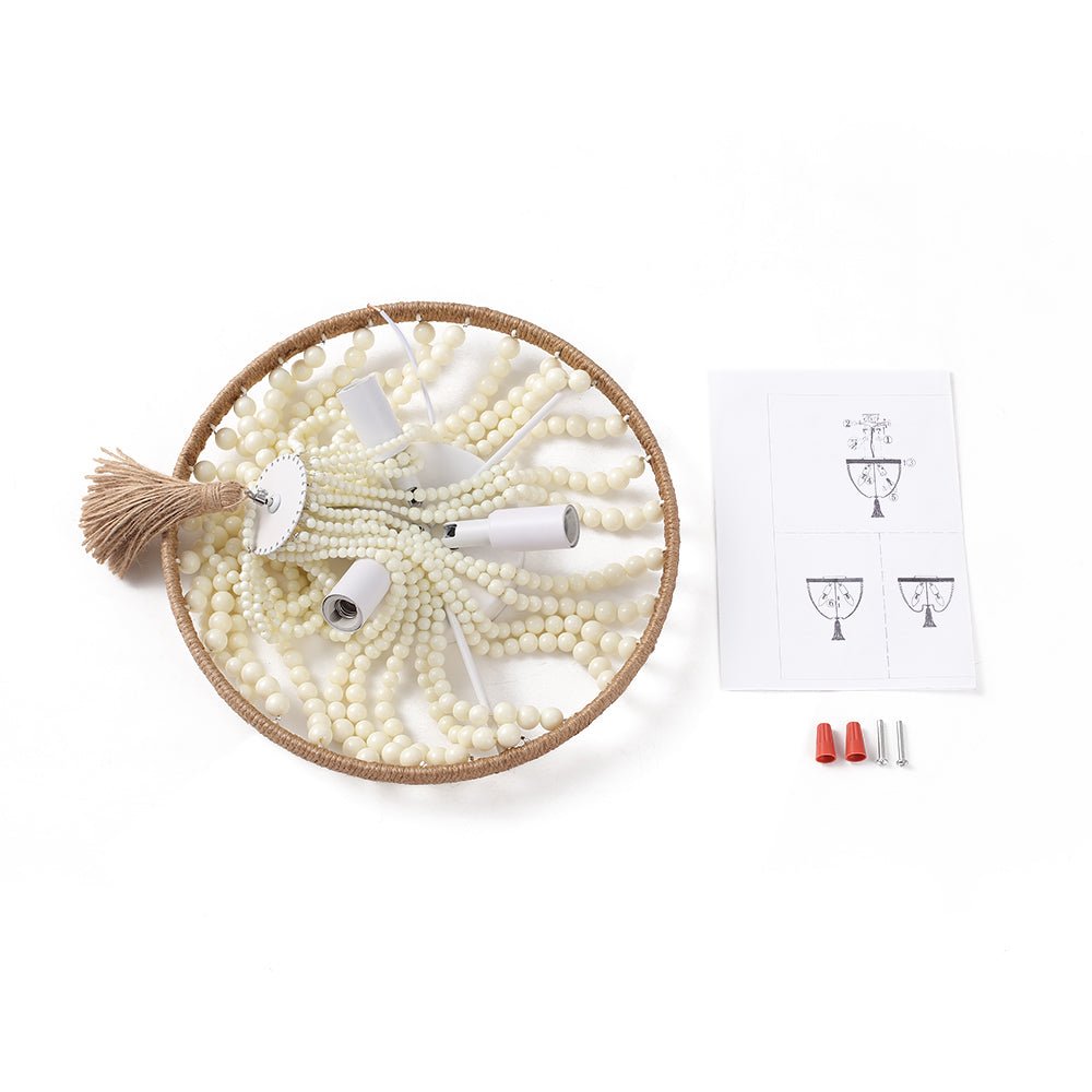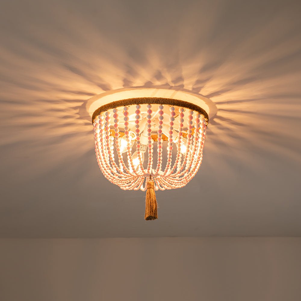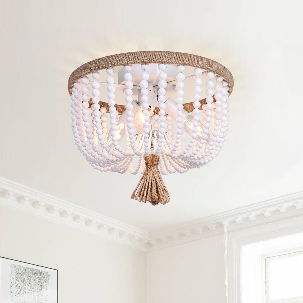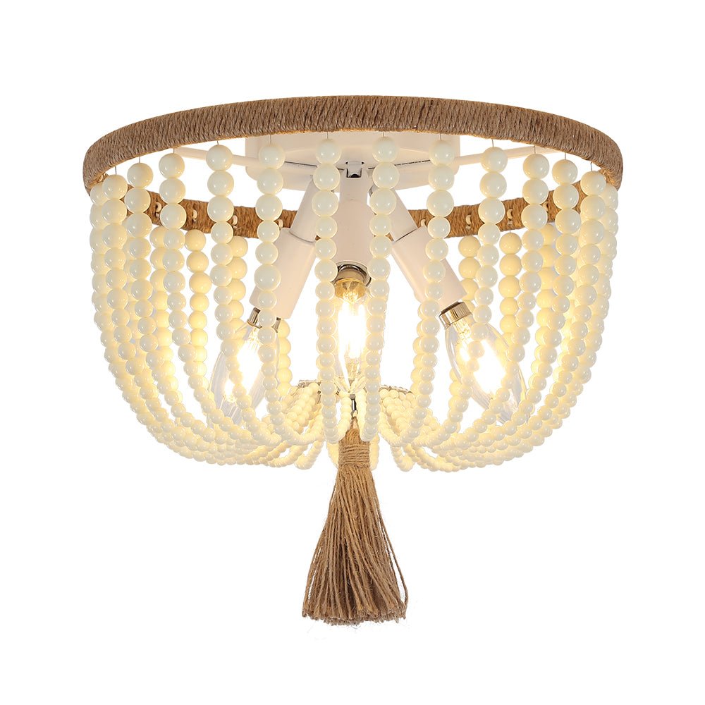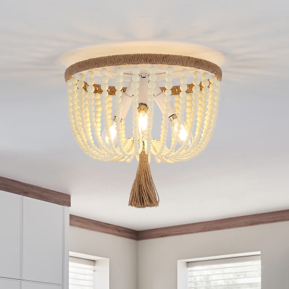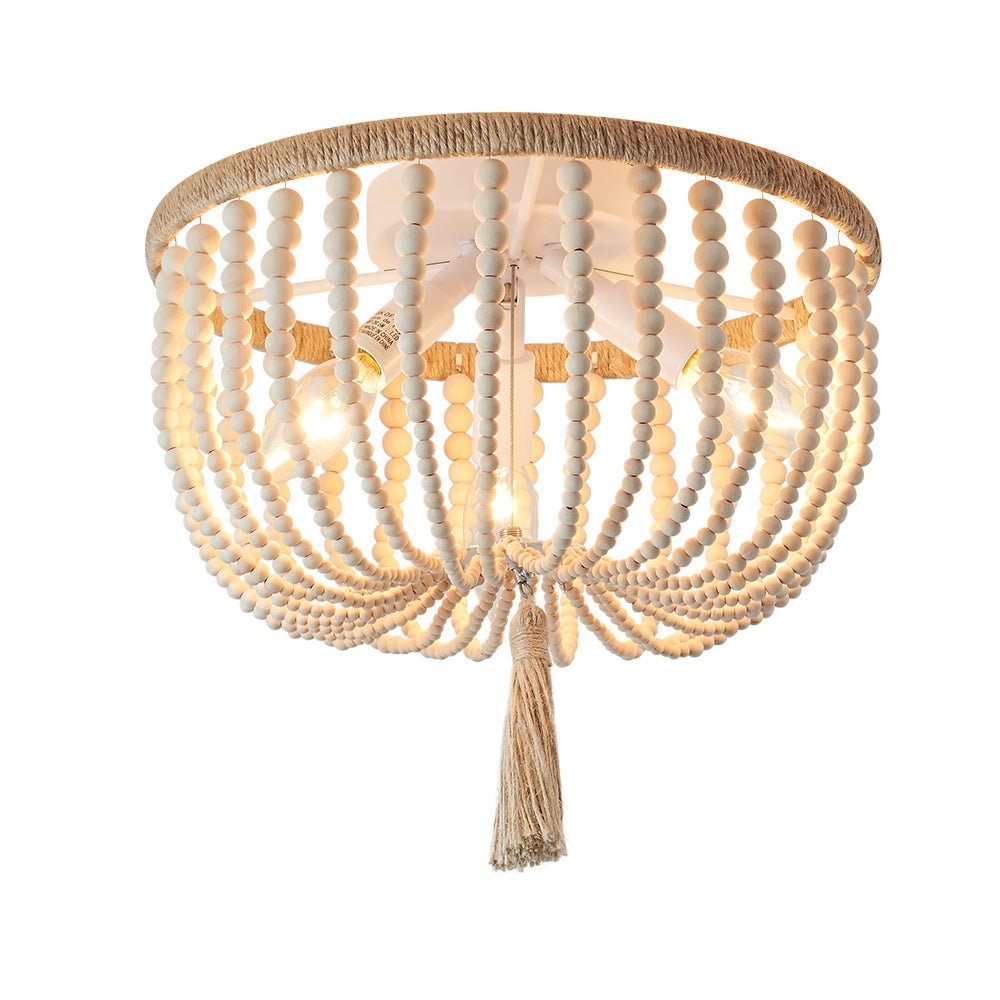 Ikonisena eksoottisena valaisimena tämä boheemi helmitaskuasennus tuo luonnollisen ja reippaan rannikon kosketuksen laajaan tyyliin modernista maalaistalosta ihanaan Barbie-tyyliin. Tämä kulhoon asennettava valaistus esittelee pyöreän kattokehyksen reunasta ripustettuja muovi- tai puuhelmiä, jotka kerääntyvät keskelle ja muodostavat kupolin muotoisen harjakattoisen ilmeen. Luonnonruskeat hamppuköysiyksityiskohdat ja käsintehty tupsu keskellä alaosassa luovat maanläheisen aksentin tähän helmillä koristeltu kattovalaisin. Kolmessa E12/E14-polttimossa (ei sisälly toimitukseen) on oikea määrä valoa, jotta voit pestä tilan avoimen varjostimen läpi, kun se sytytetään. Täydellinen asennettavaksi eteiseen, portaikkoon, pesuhuoneeseen, keittiöön tai makuuhuoneeseen klassisen ja näyttävän viimeistelyn saamiseksi.Detail