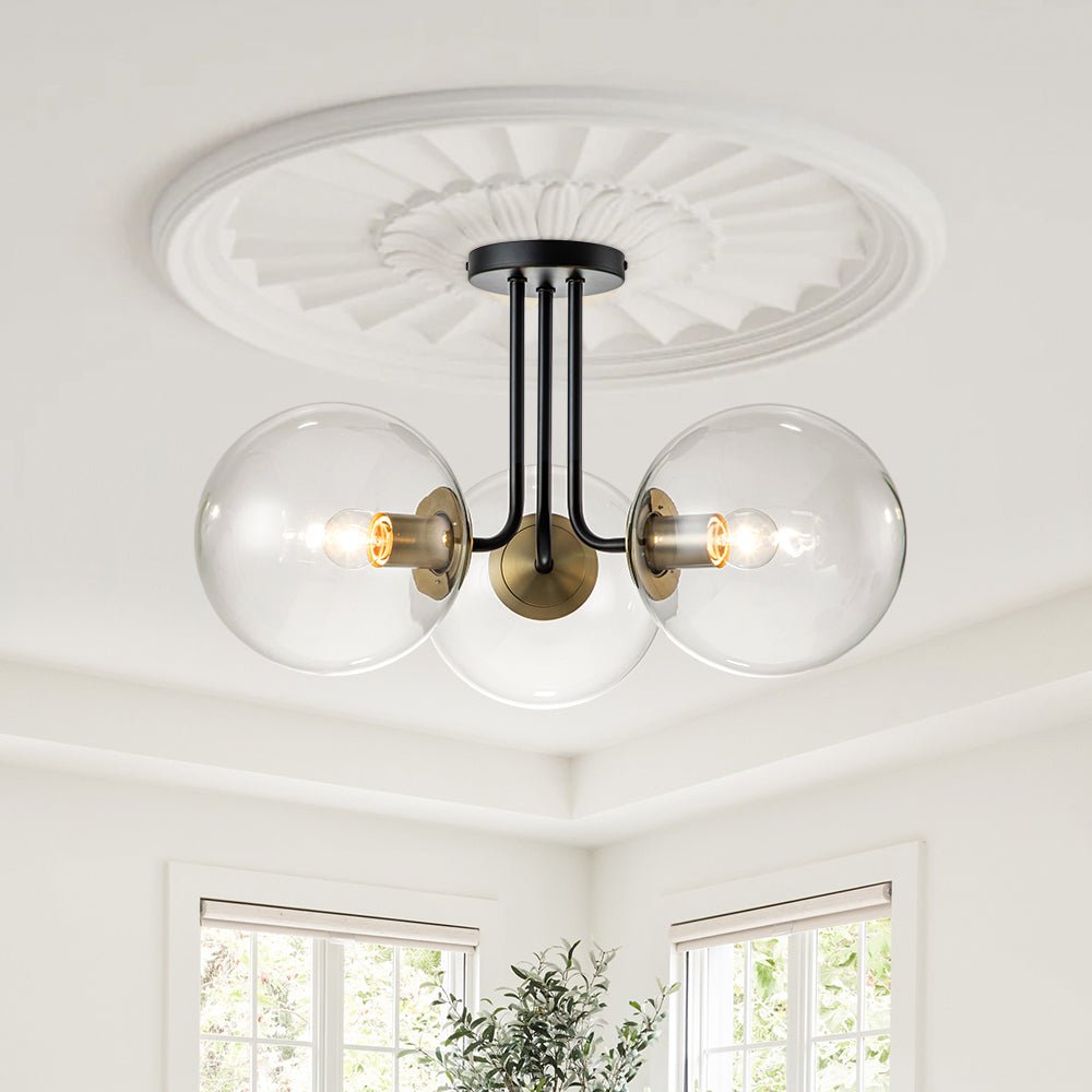 Tämä 3-valokuplakattovalaisin on siro ja tyylikäs, ja siinä on kolme kaarevaa vartta, jotka ulottuvat alas pyöreästä katosta tukemaan lasipalloja ja E26-keskipohjaisia lamppuja (ei sisällä). Klassisen mustan ja messingin värimaailmassa tämä kuplavalaisin sopii yhteen moderniin, vuosisadan puoliväliin, siirtymävaiheeseen tai nykyaikaiseen tyyliin. Tämä kirkas lasipallokattovalaisin sopii täydellisesti ruokailutilan, eteisen, makuuhuoneen, eteisen, olohuoneen ja kylpyhuoneen valaisemiseen. Se tuo tilaan ajatonta eleganssia.