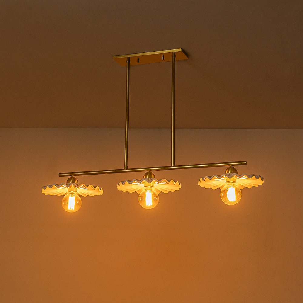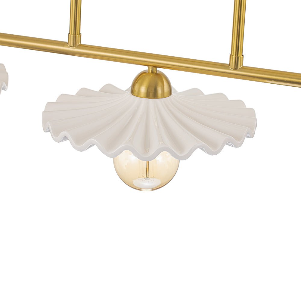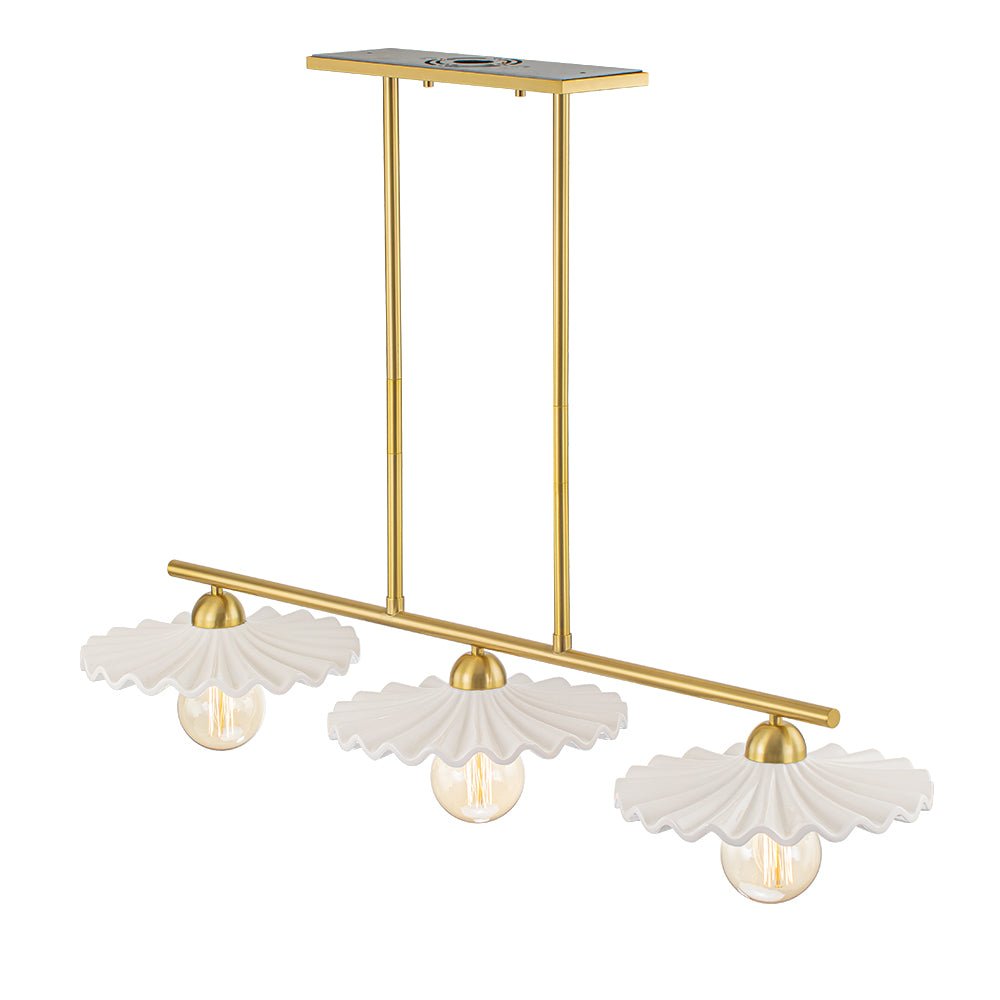 Luova ja elegantti, tämä keittiösaarekeriippuvalaisin on upea taideteos, joka tarjoaa tilaan uudenlaisen tunnelman. Kiiltävästä kermaisesta keramiikasta valmistetuissa kolmessa suloisessa lautasmaisessa sävyssä on taidokas laskostettu yksityiskohta, jotka luovat herkän ulkonäön kuin houkuttelevat kuoret. Upea messinkiviimeistely lisää tyylikkään vuosisadan puolivälin ja ylellisen silauksen tähän 3 valon saarekeriipukseen. Heitä ruokailuhuoneesi tai keittiösi saareke tällä kauniilla keraamisella lineaarisella kattokruunulla.Tiedot