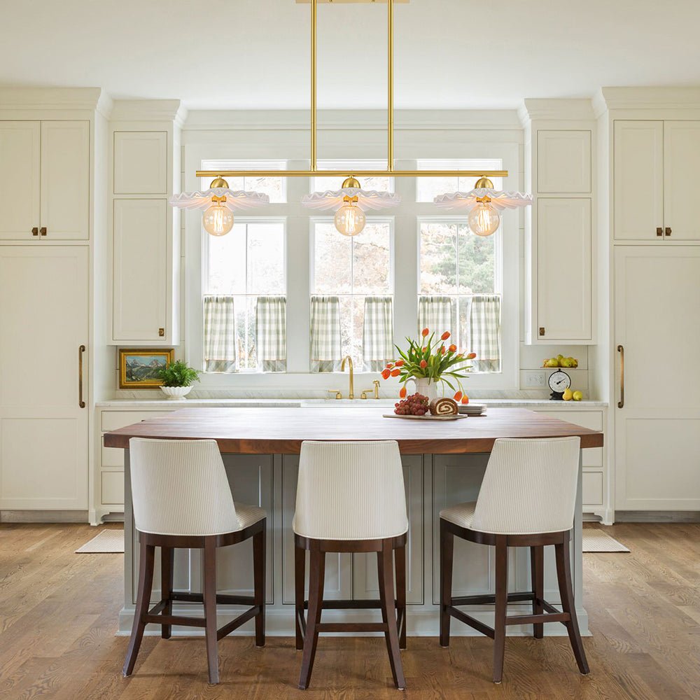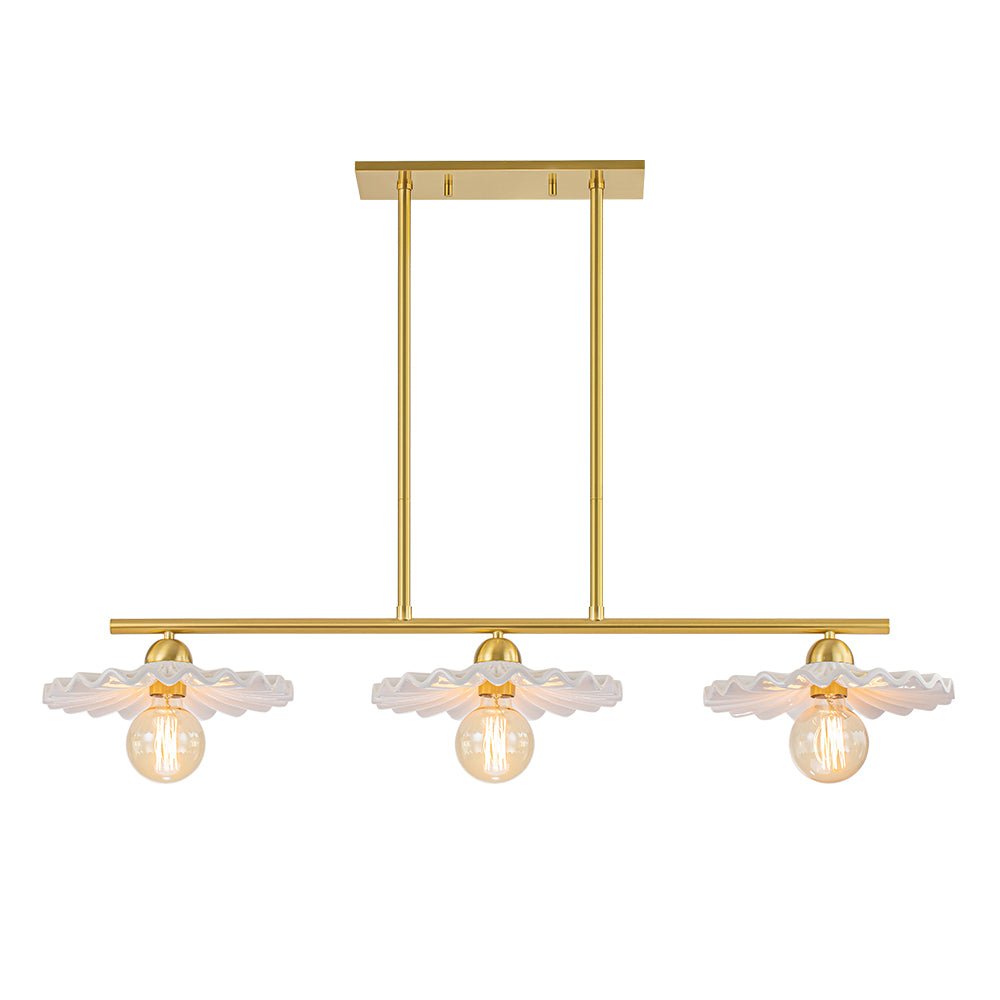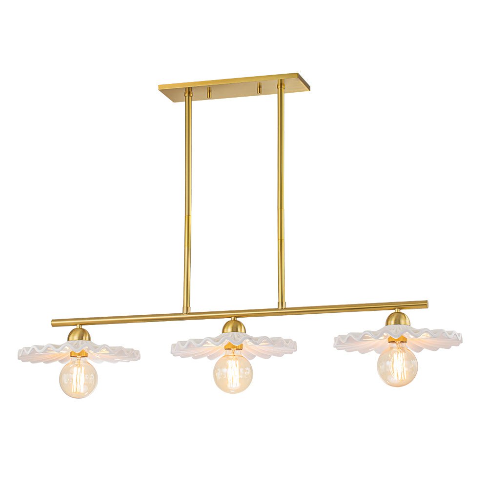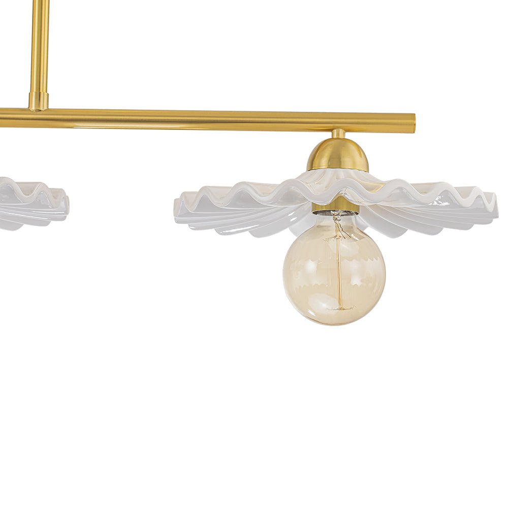 Luova ja elegantti, tämä keittiösaarekeriippuvalaisin on upea taideteos, joka tarjoaa tilaan uudenlaisen tunnelman. Kiiltävästä kermaisesta keramiikasta valmistetuissa kolmessa suloisessa lautasmaisessa sävyssä on taidokas laskostettu yksityiskohta, jotka luovat herkän ulkonäön kuin houkuttelevat kuoret. Upea messinkiviimeistely lisää tyylikkään vuosisadan puolivälin ja ylellisen silauksen tähän 3 valon saarekeriipukseen. Heitä ruokailuhuoneesi tai keittiösi saareke tällä kauniilla keraamisella lineaarisella kattokruunulla.Tiedot