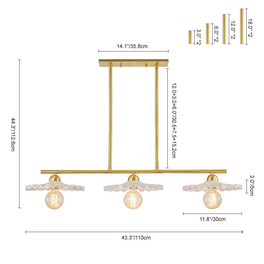 Kolme valoa • Kiiltävät kermanväriset keraamiset varjostimet • Messinkiviimeistely • E26-pohjaiset keskikokoiset polttimot (ei sisälly) • Kiinteä • UL-listattu