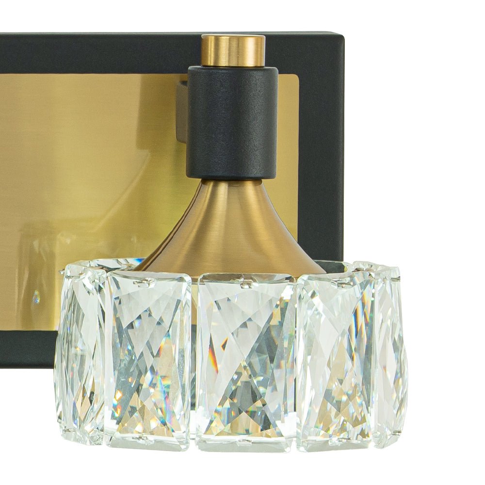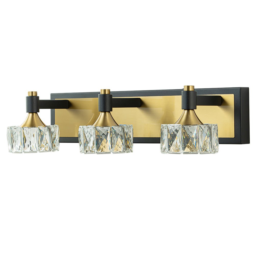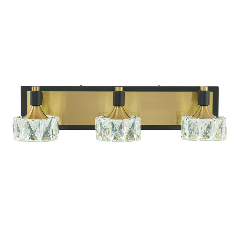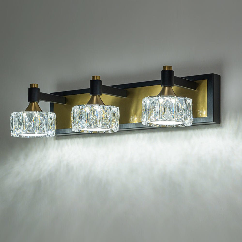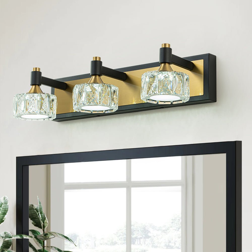 Kiiltävä kuin timantti, tämä kolmen valon kristallivalaisin on tyylikäs aksentti kylpyhuoneeseen, pesuallasi, turhamaisuuteen tai olohuoneeseen. Suorakaiteen muotoisen taustalevyn ja suorakulmaisten käsivarsien pitämänä kolme pyöreää sävyä on valmistettu viistetystä kristallista. Tämä kylpyhuoneen LED-meikkivalaisin yhdistää mustaa ja messinkiä, ja se huokuu nykyaikaista kauneutta ja loistoa estetiikkaan. Tämä 3 valon kristallikylpyhuoneen meikkilamppu on varustettu tehokkaalla LED-valolla ja himmennettävällä tavalla, ja se häikäisee turhamaisuustilaasi ja kylpyhuonettasi yhtäläisesti tyylillä ja toimivuudella.Tiedot