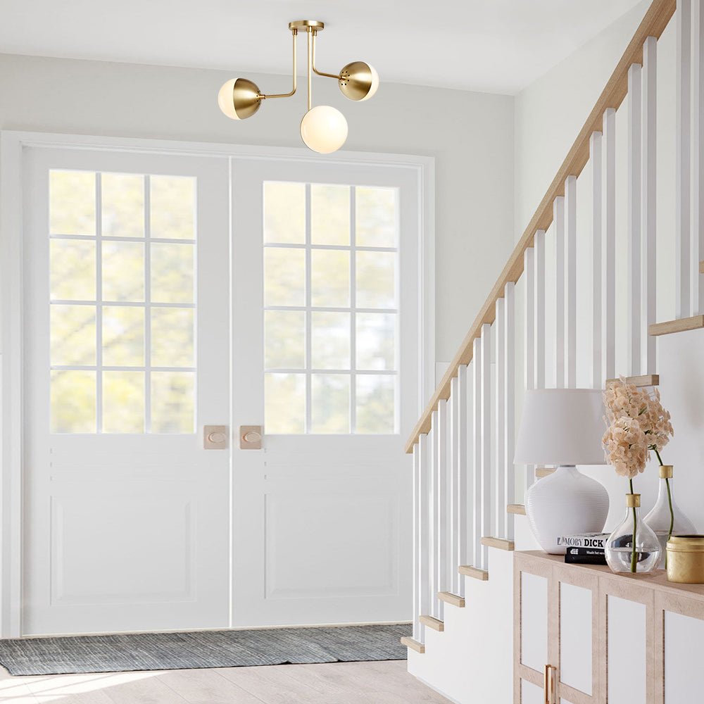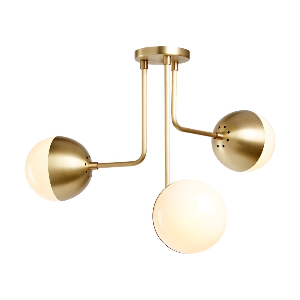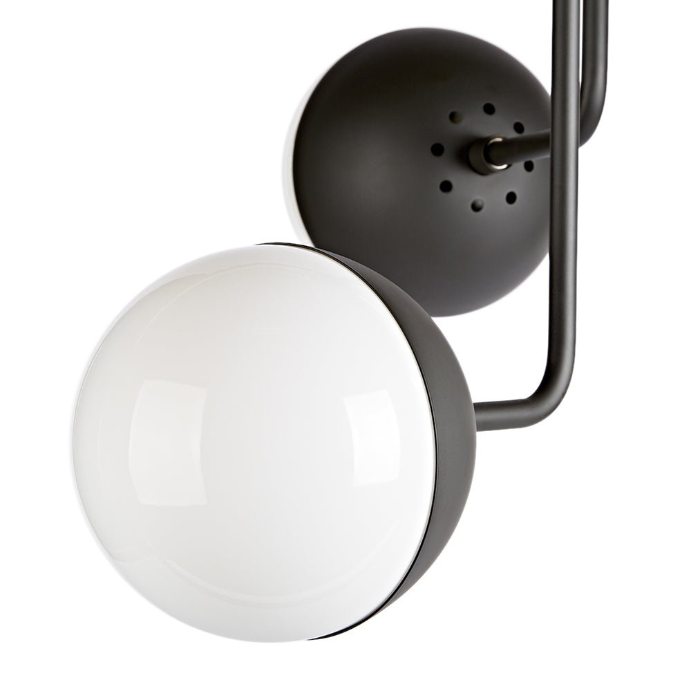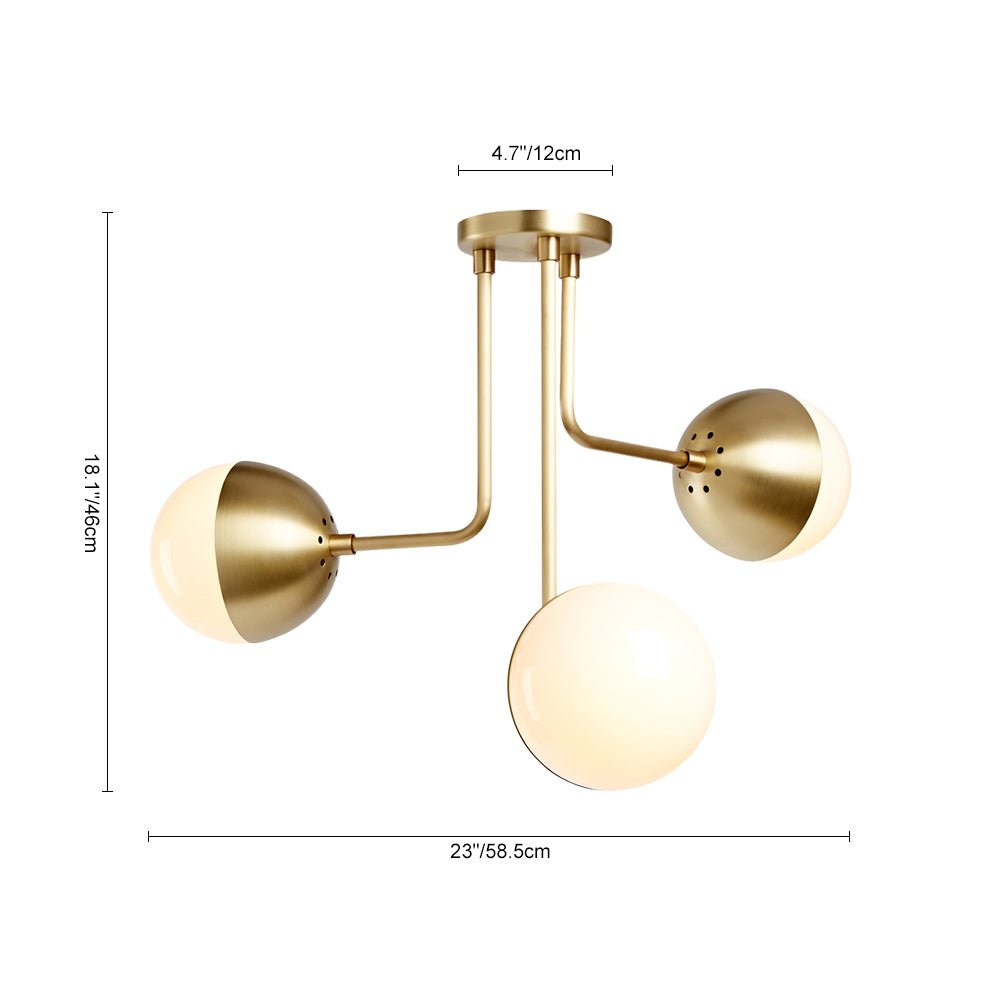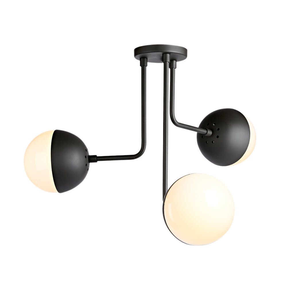 Päivitä kotisi sisustus tällä vuosisadan puolivälin maapallokattovalaisimella. Metallista valmistetut kolme eripituista kaarevaa vartta laskeutuvat alas pyöreästä katosta luoden kerroskuvan. Opaalilasipallojen varjostimet lisäävät tyylikkään ja siron kosketuksen, joka sopii sekä moderneihin että vuosisadan puoliväliin. Tämä satiinin messingillä tai mattamustalla viimeistelty opaalilasinen maapallon puoliksi upotettava valaisin on tyylikäs vaihtoehto tuomaan tunnelmallista valaistusta olohuoneeseen, makuuhuoneeseen tai eteiseen.Detail