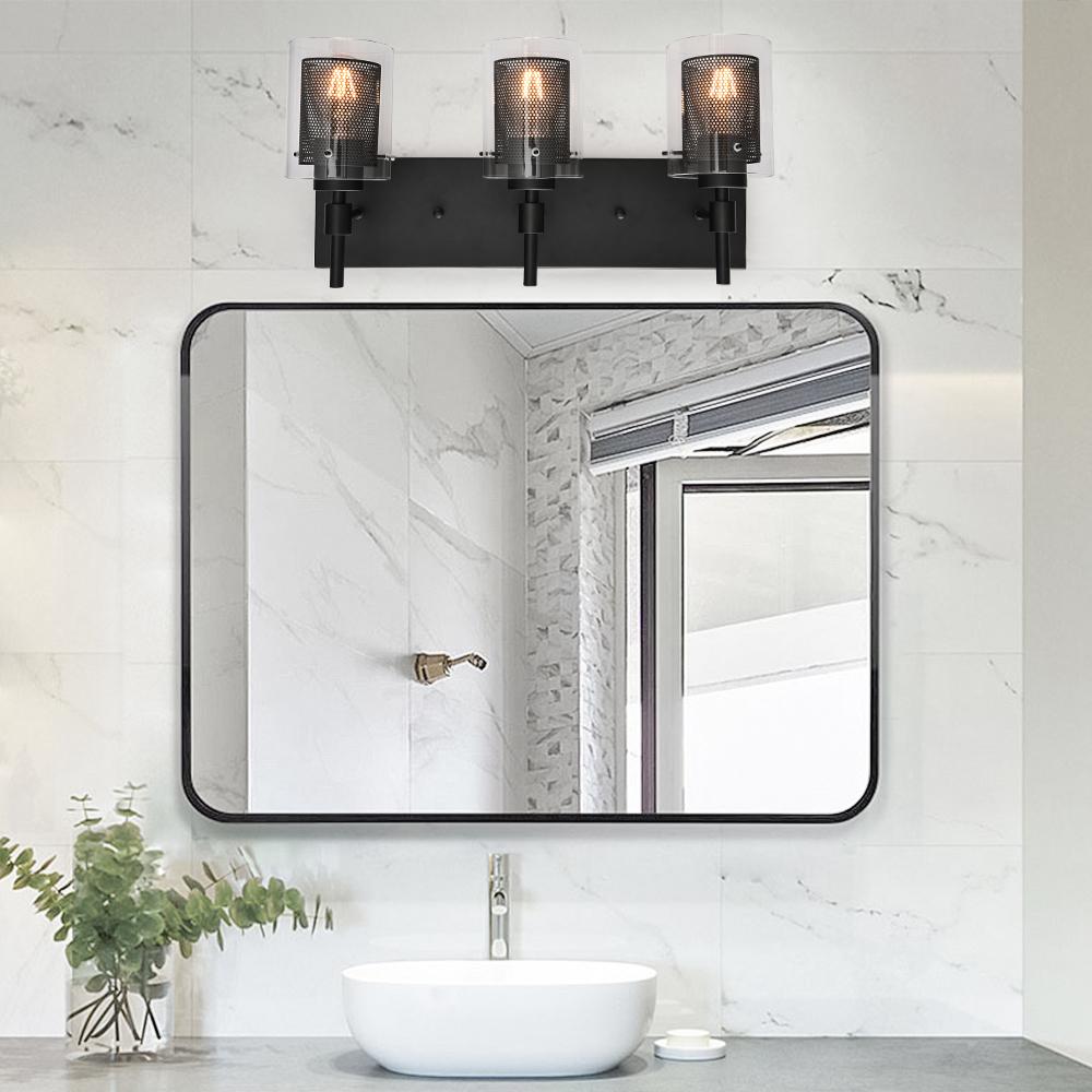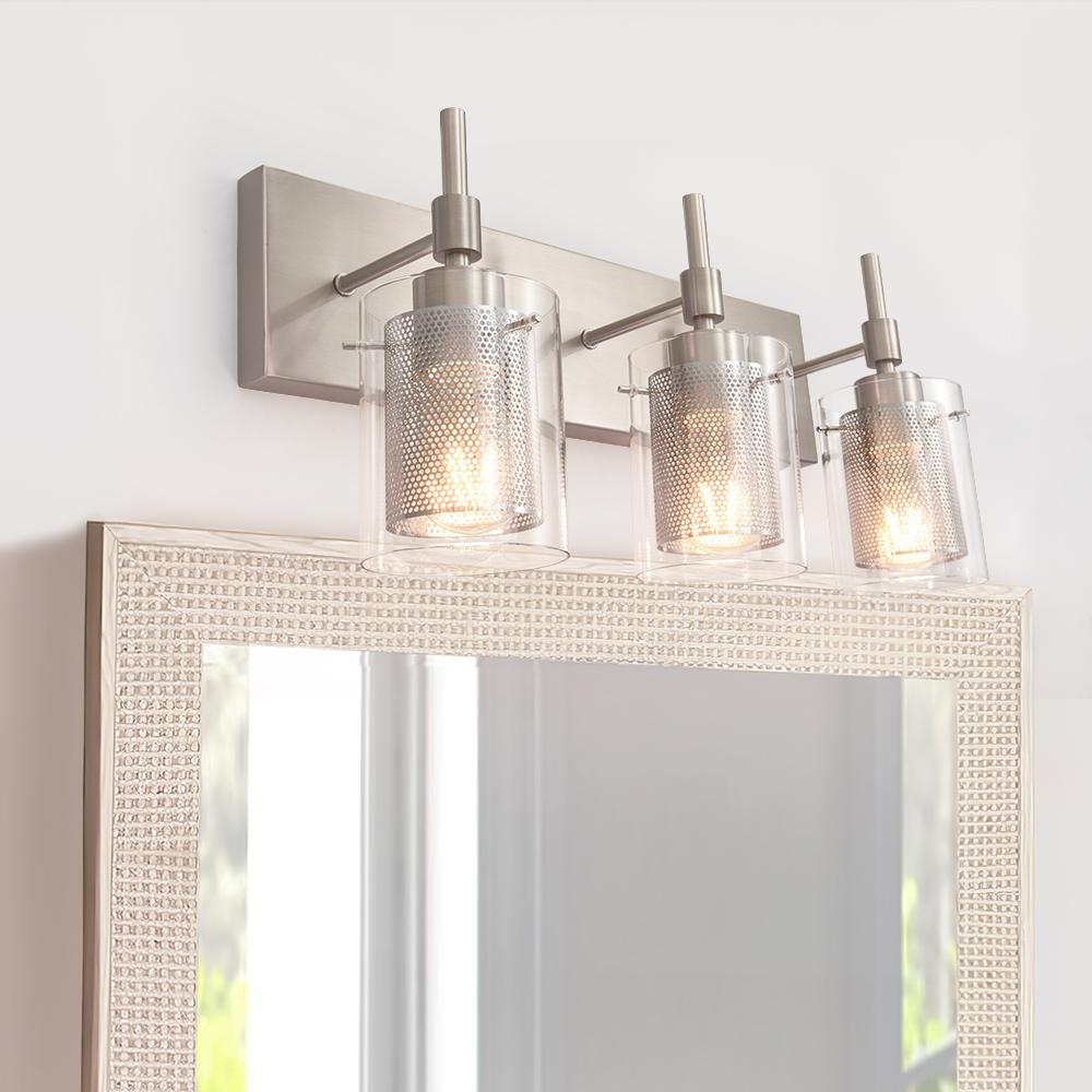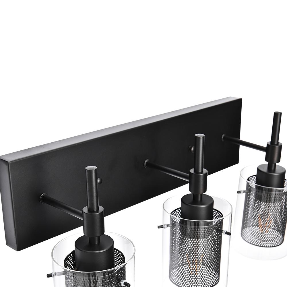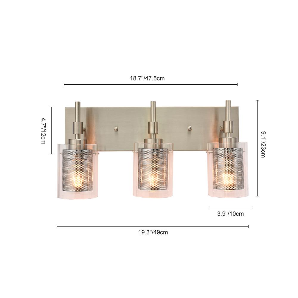 3-kevyinen lasinen meikkivalaisin tyydyttää varmasti jokaisen kodin sisustuksen ystävän. Kiinteä suorakaiteen muotoinen taustalevy ja kolme vartta tukevat kolmea sylinterimäistä kirkasta lasisävyä, jotka korostuvat sisäverkoilla. Harjattu nikkeli tai mattamusta viimeistely luo modernin tyylikkään kosketuksen tähän lasiseinävalaisimeen. Yhteensopiva E26/E27 keskikantaisten polttimoiden kanssa (ei sisälly), tämä 3-valaisin seinävalaisin voidaan asentaa niin, että sen valot osoittavat ylös tai alas. Suosittelemme kirkastamaan wc-huonettasi, kylpyhuonettasi, peiliäsi, sisäänkäyntiäsi, aulaasi, makuuhuonettasi tai käytävääsi tällä meikkivalaisimella.Detail