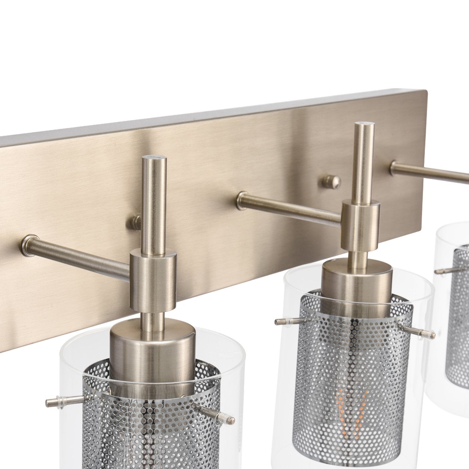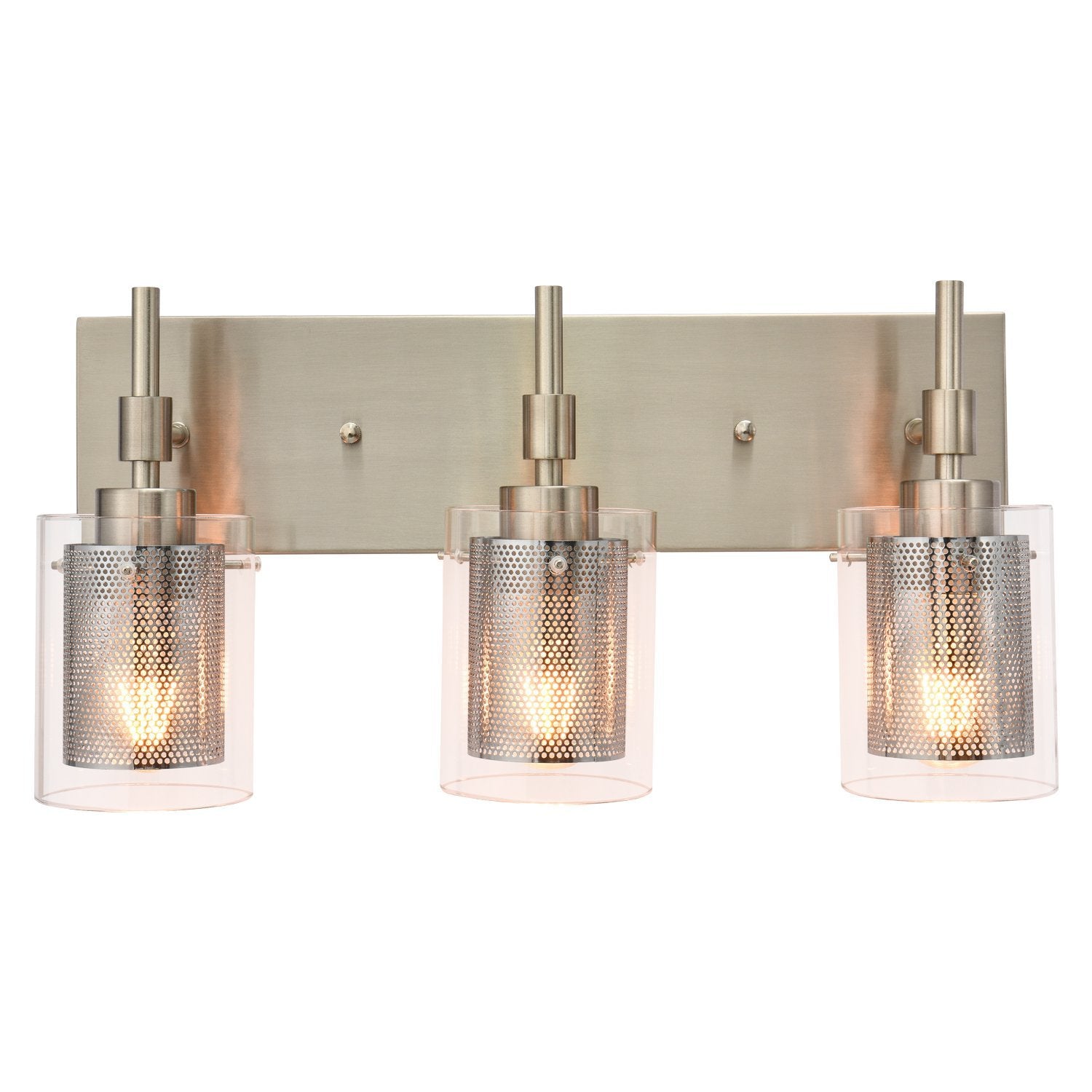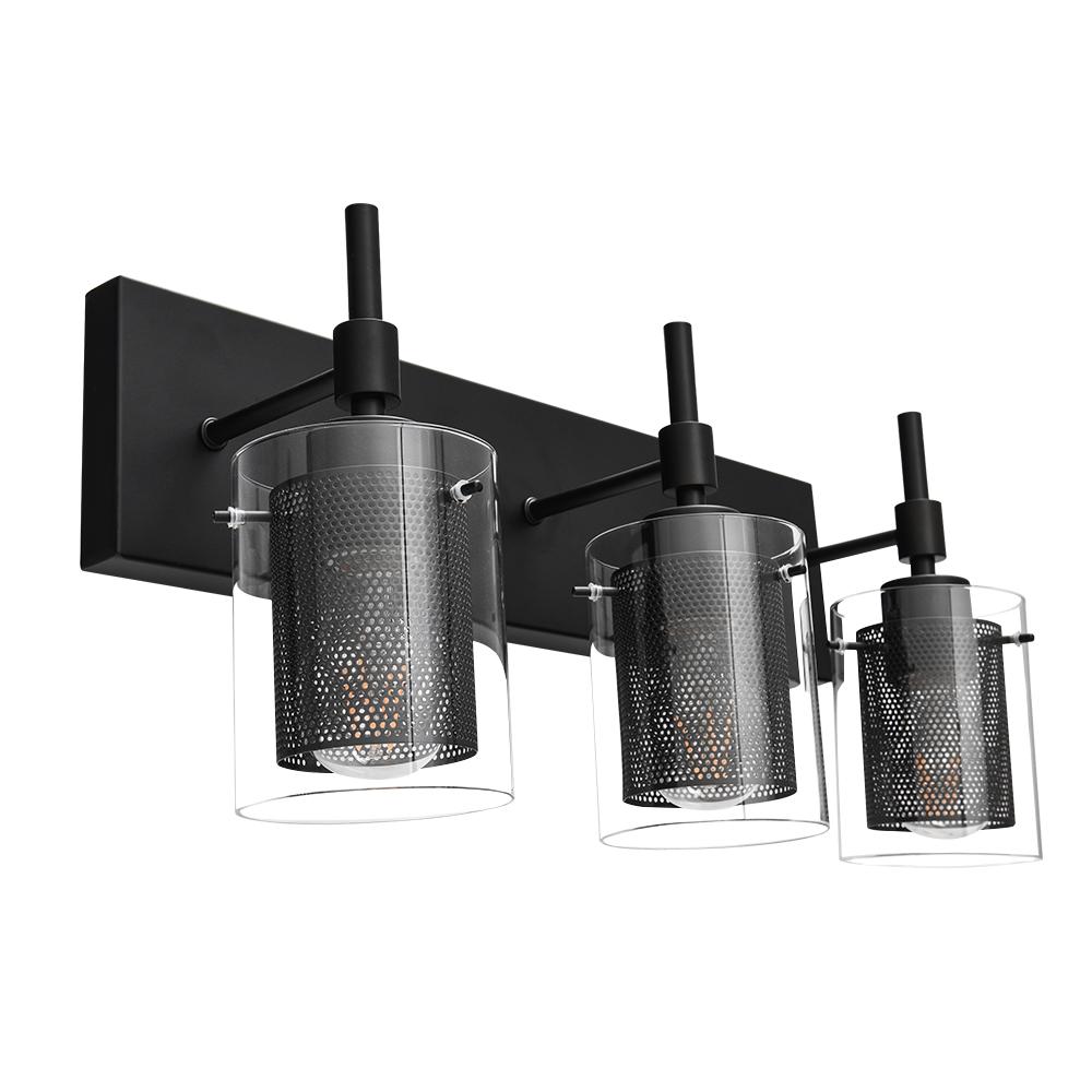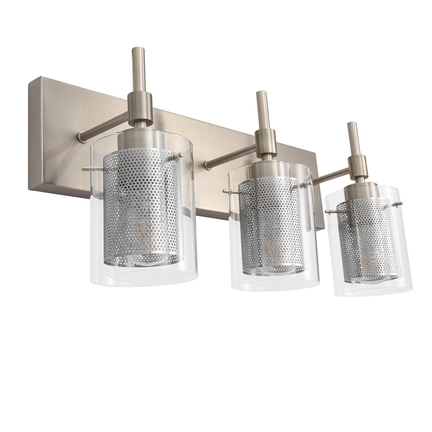 3-kevyinen lasinen meikkivalaisin tyydyttää varmasti jokaisen kodin sisustuksen ystävän. Kiinteä suorakaiteen muotoinen taustalevy ja kolme vartta tukevat kolmea sylinterimäistä kirkasta lasisävyä, jotka korostuvat sisäverkoilla. Harjattu nikkeli tai mattamusta viimeistely luo modernin tyylikkään kosketuksen tähän lasiseinävalaisimeen. Yhteensopiva E26/E27 keskikantaisten polttimoiden kanssa (ei sisälly), tämä 3-valaisin seinävalaisin voidaan asentaa niin, että sen valot osoittavat ylös tai alas. Suosittelemme kirkastamaan wc-huonettasi, kylpyhuonettasi, peiliäsi, sisäänkäyntiäsi, aulaasi, makuuhuonettasi tai käytävääsi tällä meikkivalaisimella.Detail