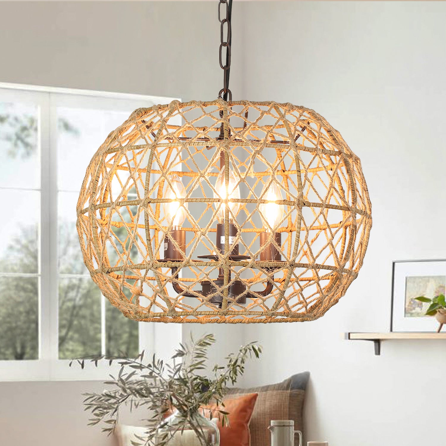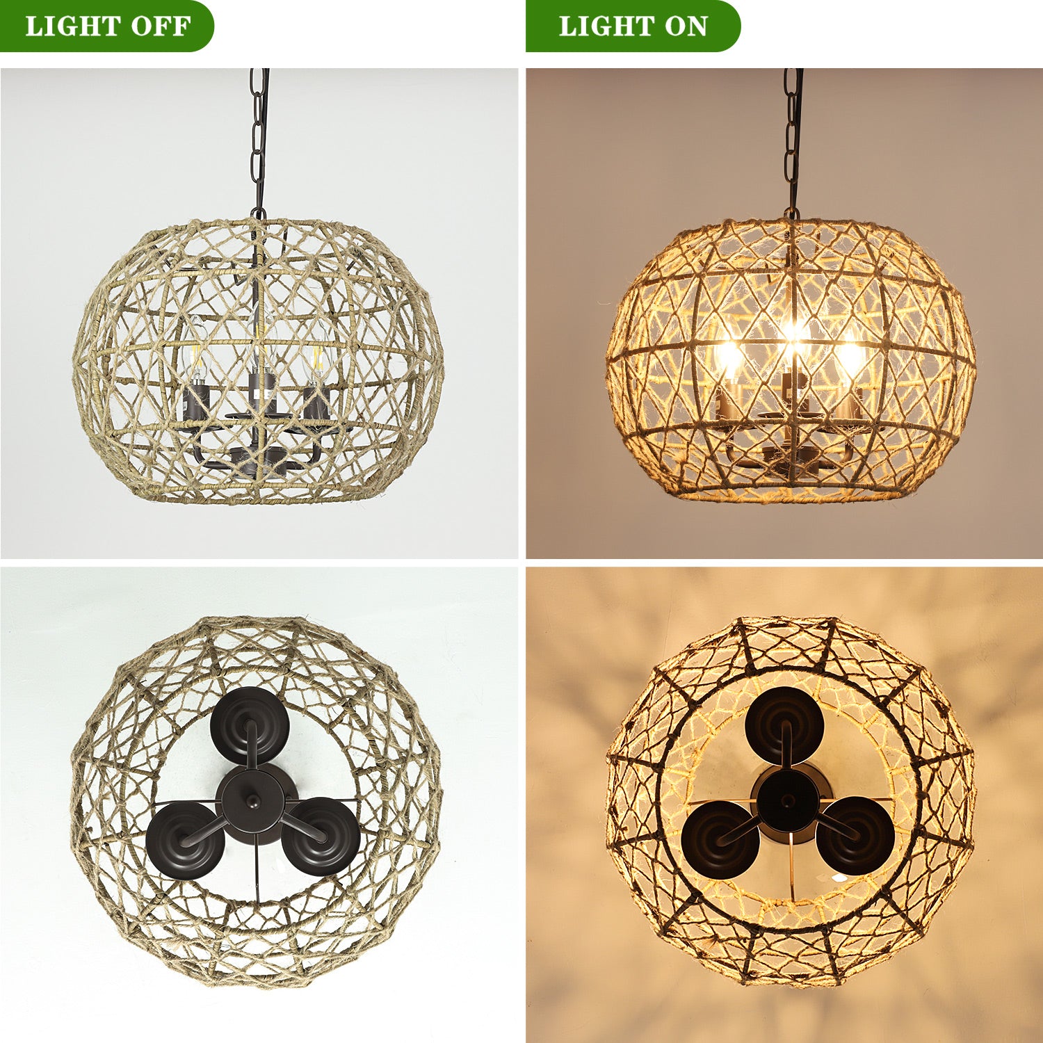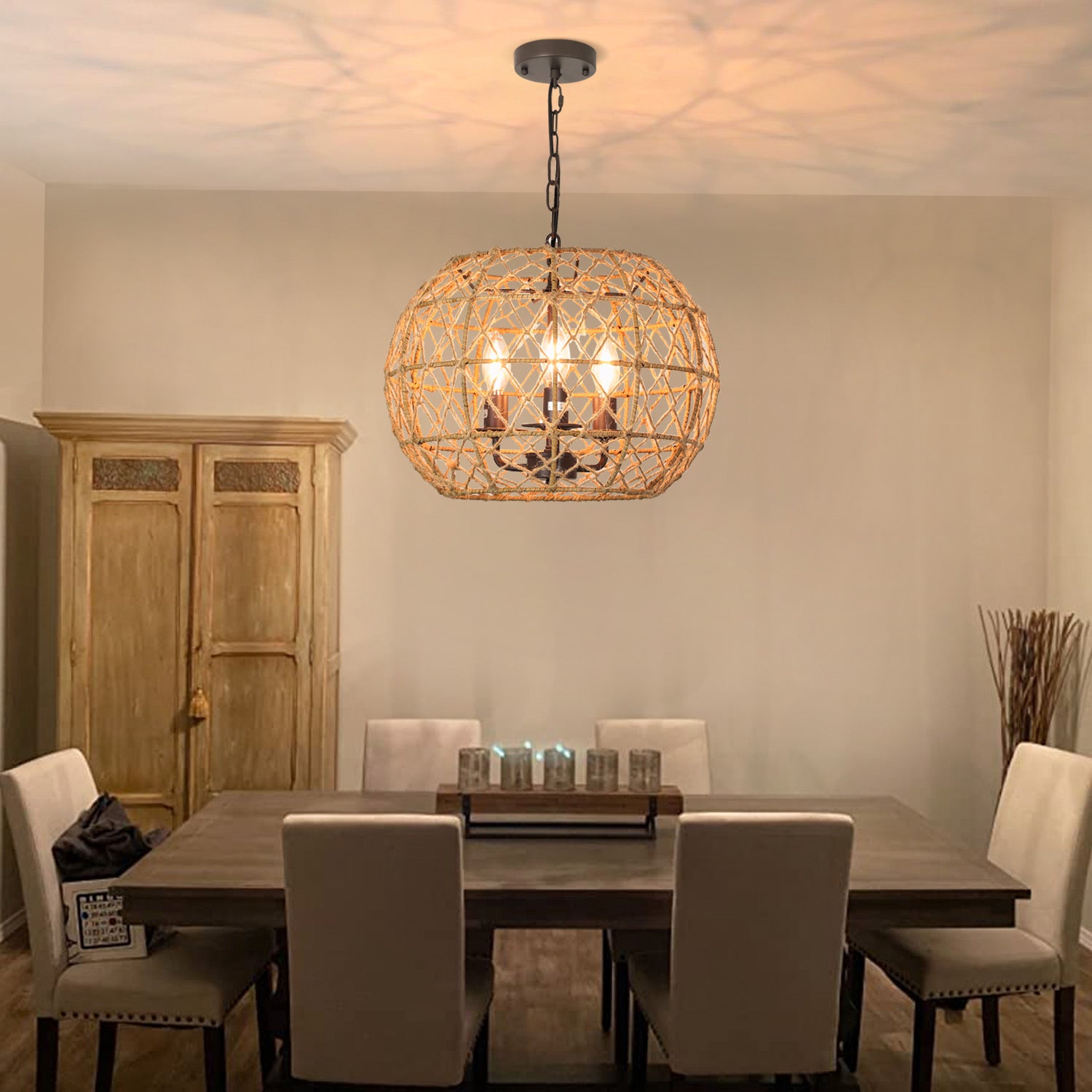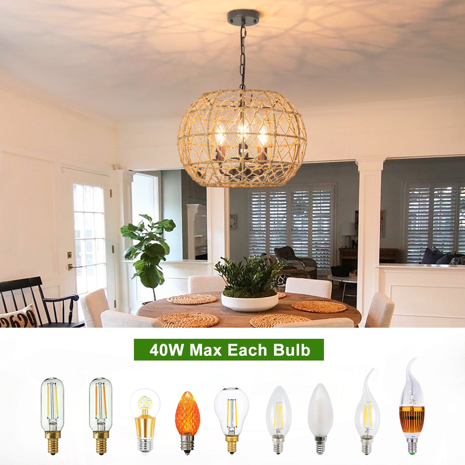 - �【3 valoa】Riippuvissa riippuvalaisimissa on kolme E12-kantapolttimoa (MAX 3*40W), jotka ovat himmentimen kanssa yhteensopivia. Nämä kynttelikkötyyliset sipulit paljastuvat köysivarjostimen läpi ja luovat todella siistin ja kuvioituneen kuvion seinään ja kattoon.