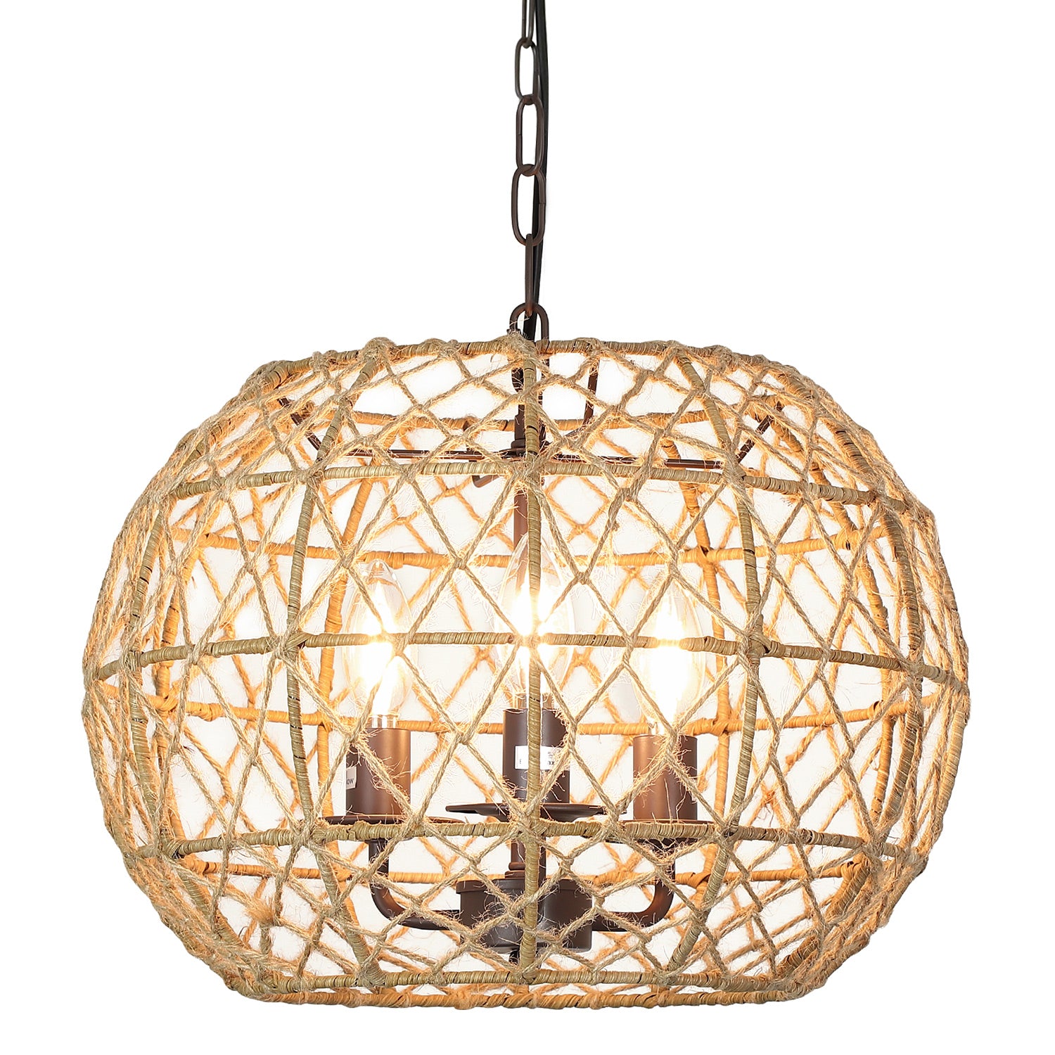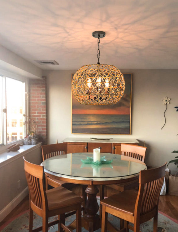 Depuley rustiikkinen kudottu riippuvalaisin, 3-kevyt metallikori riippuvalaisin hamppuköysi viimeistelyllä, 39 tuuman säädettävä ketju vintage kattokruunut keittiöön/ruokapöytään/olohuoneeseen