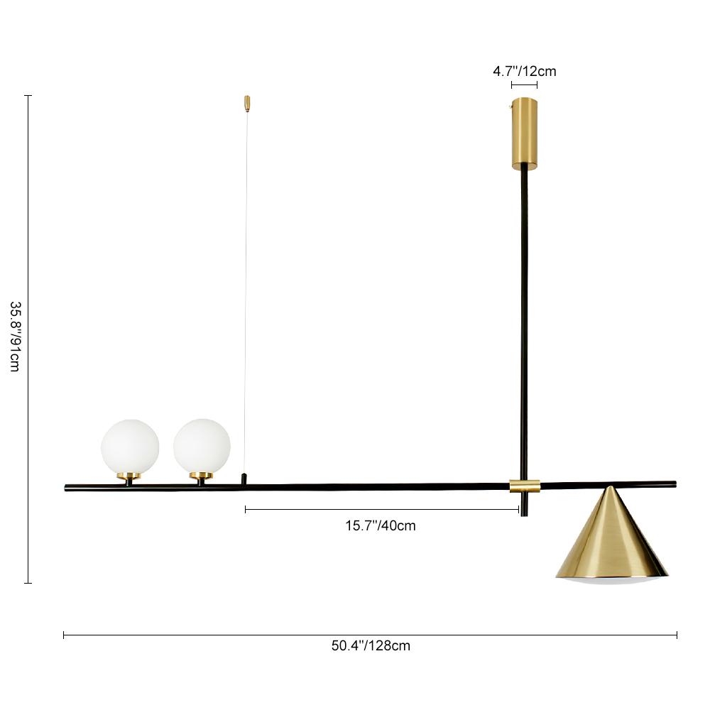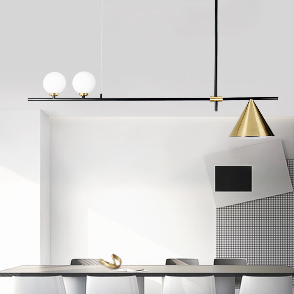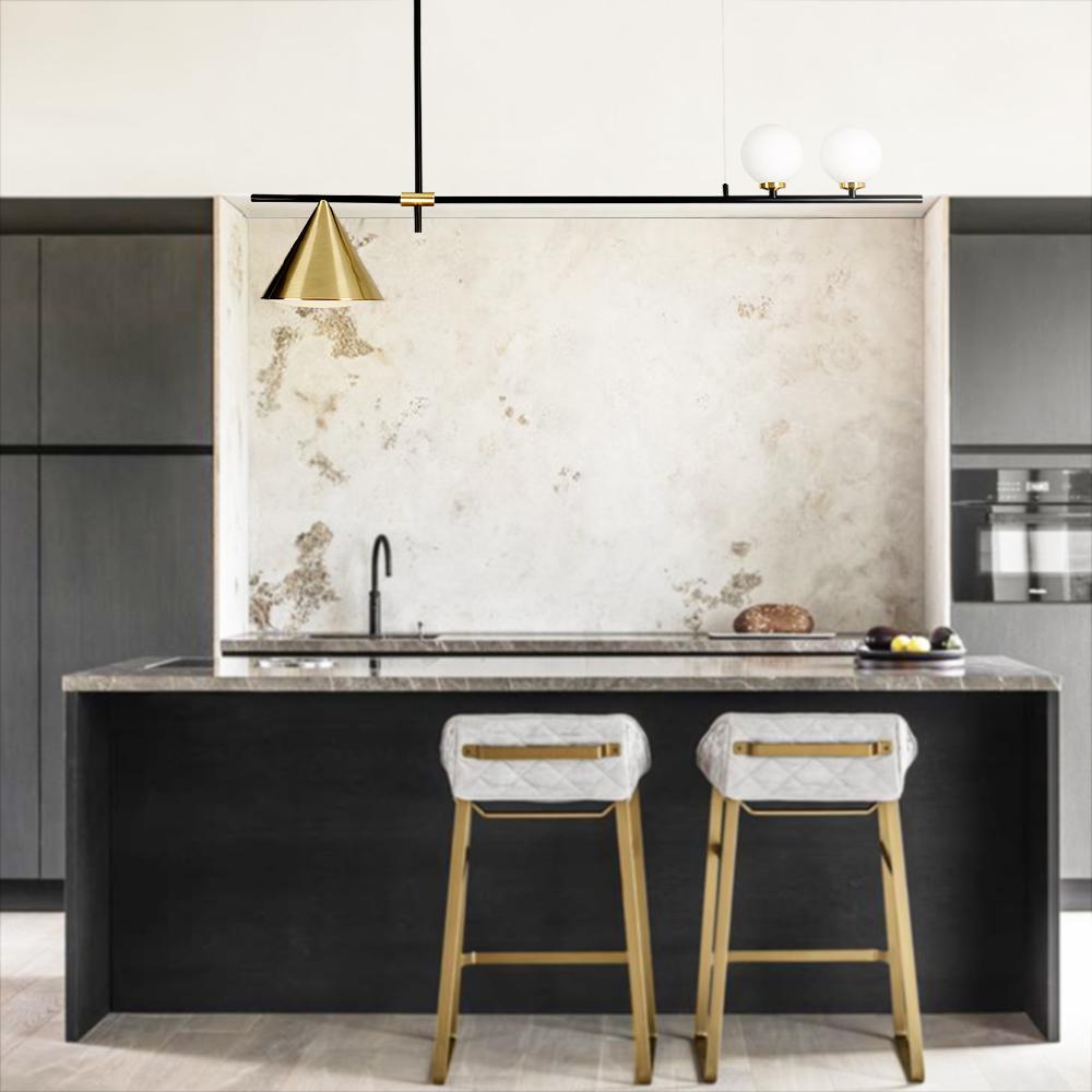 Moderni vuosisadan puolivälin tyyli ja persoonallisuus määrittelevät tämän keittiön lineaarisen saarivalaistuksen muodikkaan suunnittelun. Tämä metallista valmistettu lineaarinen kattokruunu toimitetaan vaakasuorassa ja kapeassa tangossa, joka on ripustettu suoran alasauvan ja kaapelin varaan. Tässä 3-lampuisessa kattokruunussa on luovasti epäsymmetrinen mutta harmoninen muotoilu, jossa on kaksi maitomainen lasipallovarjostin tangon toisella puolella ja kartiovarjostin toisella puolella. Yhteensopiva kahden G9-polttimo ja yhden E26/E27-pohjaisen polttimon kanssa (molemmat eivät sisälly toimitukseen), tämä 3-valaisin keittiön lineaarinen saarivalaistus kehittää keittiösi saareketta, ruokapöytää, olohuonetta ja eteistä.Detail