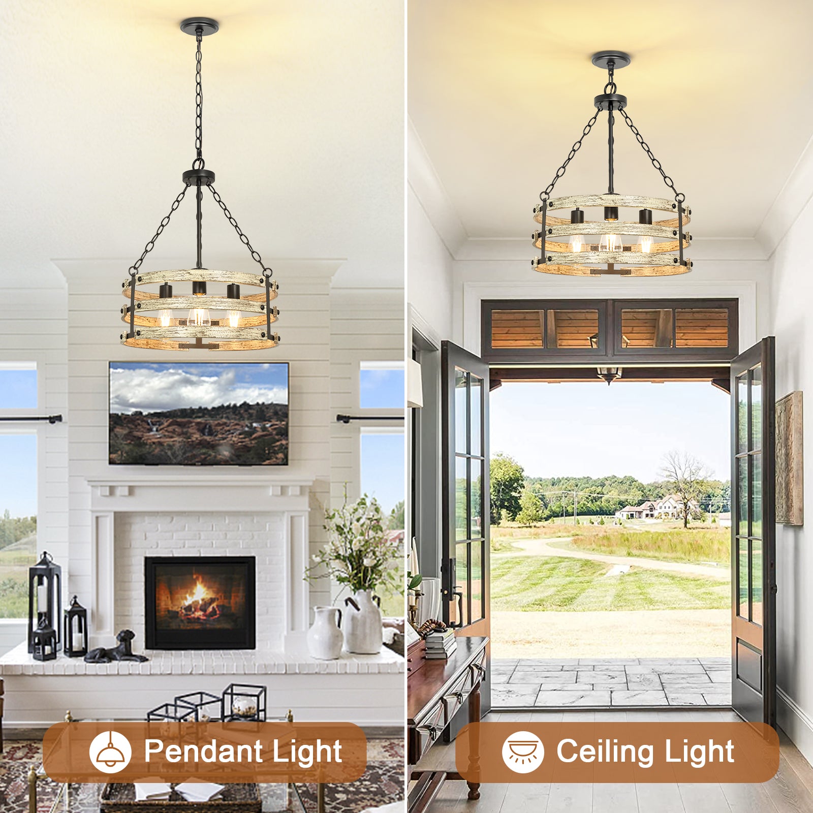 DLLT 3-Light Farmhouse Chandelier Light Fixtures, Rustic Drum Hanging Pendant Lighting, Semi Flush Mount Ceiling Light for Dining Room Kitchen Entryway Foyer Hallway, Black Metal Finish