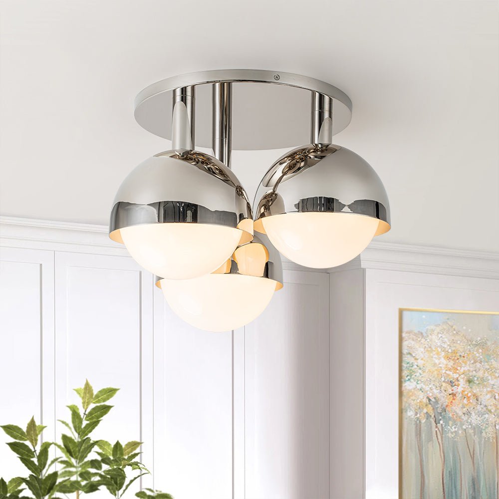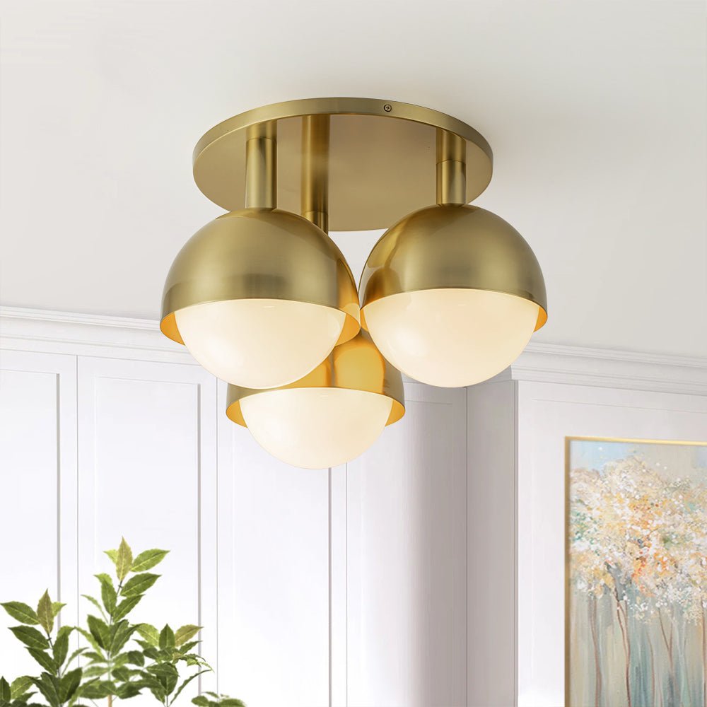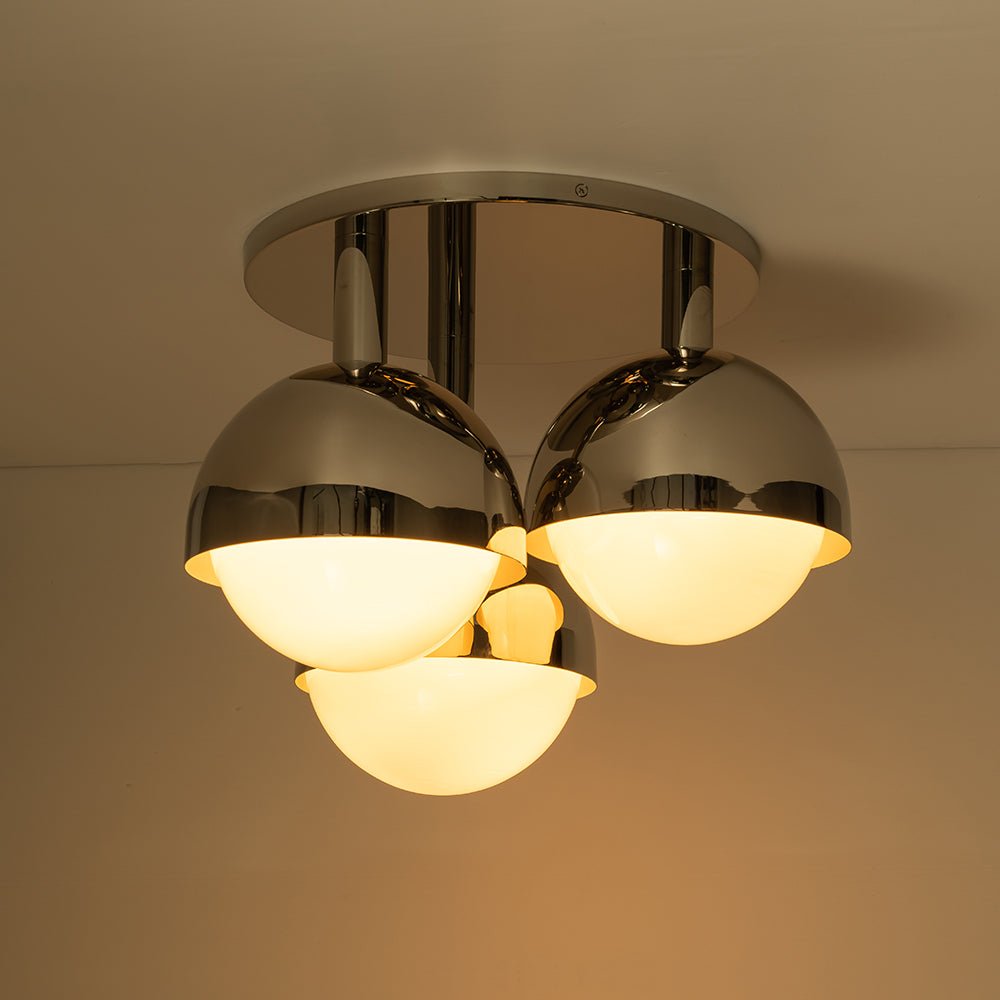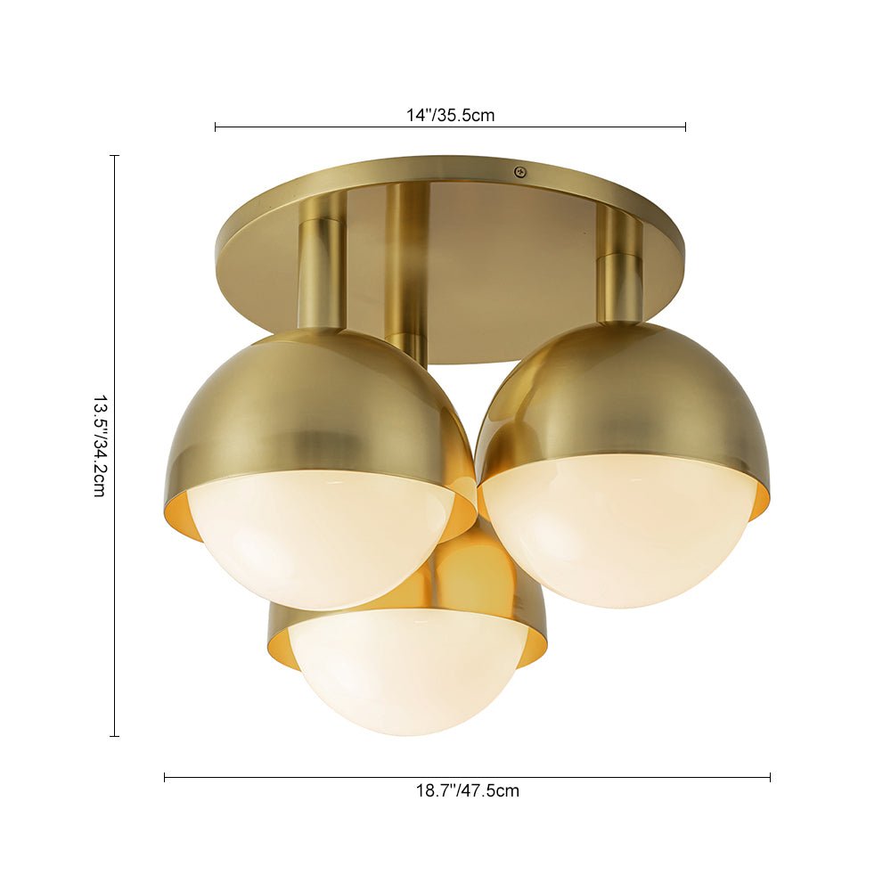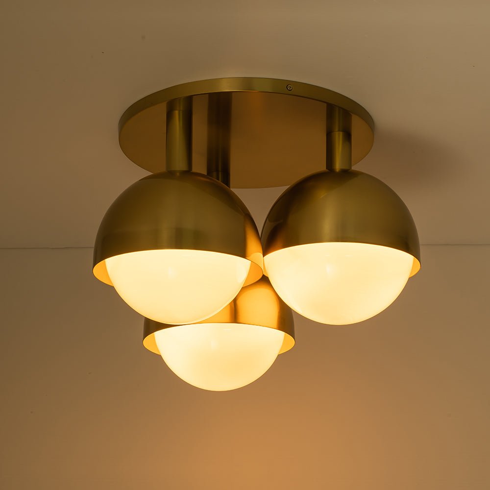 Tässä kestävästä raudasta valmistetun vuosisadan puolivälin modernin 3-valaisimen kattovalaisimessa on kolme lyhyttä sauvaa, jotka tulevat leveästä pyöreästä katosta ja jotka riippuvat kolme puolipallon muotoista sävyä. Jokainen metallivarjostin on ympäröity maidonvalkoisella lasipallolla, joka luo minimalistisen kuplatyylin. E26-pohjaisten polttimoiden (ei sisälly toimitukseen) kanssa tämä puoliksi upotettava kattokruunu toimii erinomaisesti ja tarjoaa lämpimän ja viihtyisän ympäristön valaistuksen. Vanhentuneella messingillä tai kiillotetulla nikkelillä viimeistelty opaalilasipallo, puolitasossa asennettava valaisin on hillitty mutta hienostunut lisä, joka on ihanteellinen ruokailuhuoneen, eteisen, makuuhuoneen, eteisen tai olohuoneen rakentamiseen.Tiedot