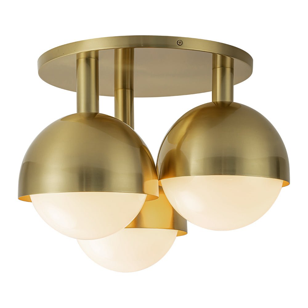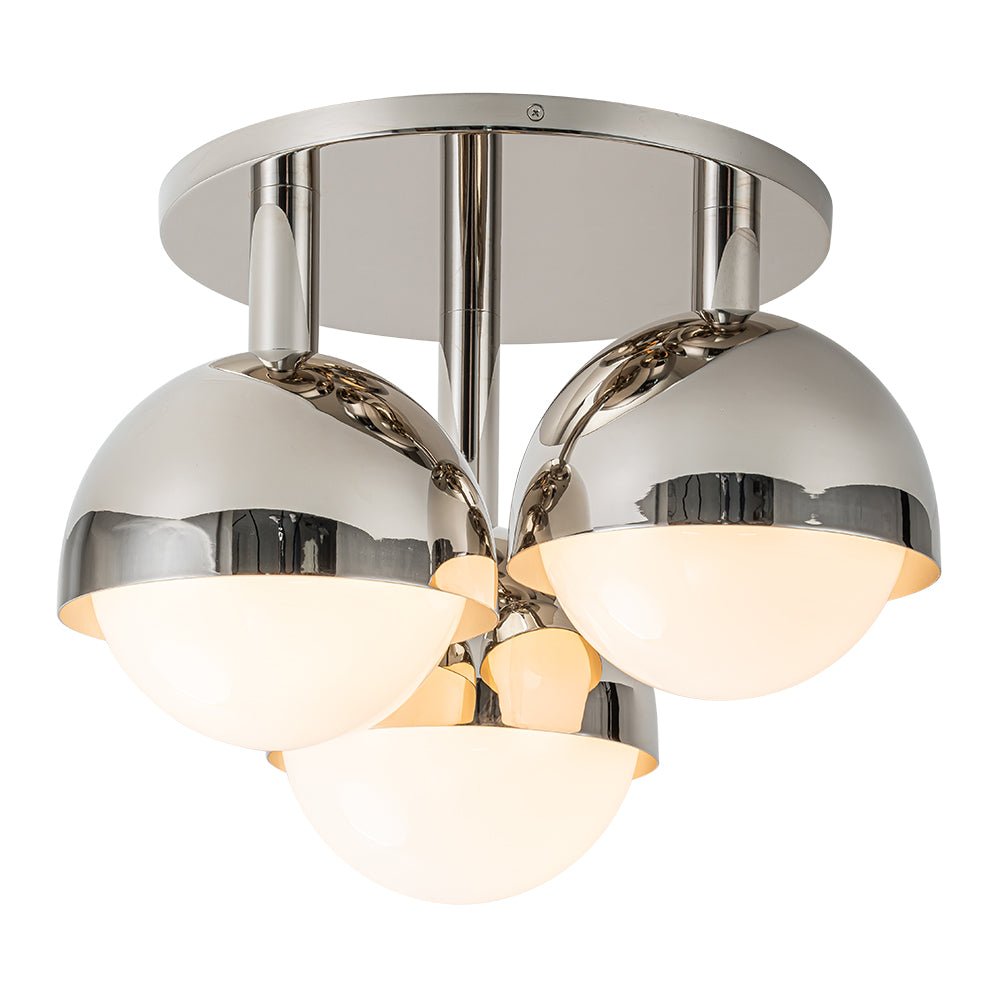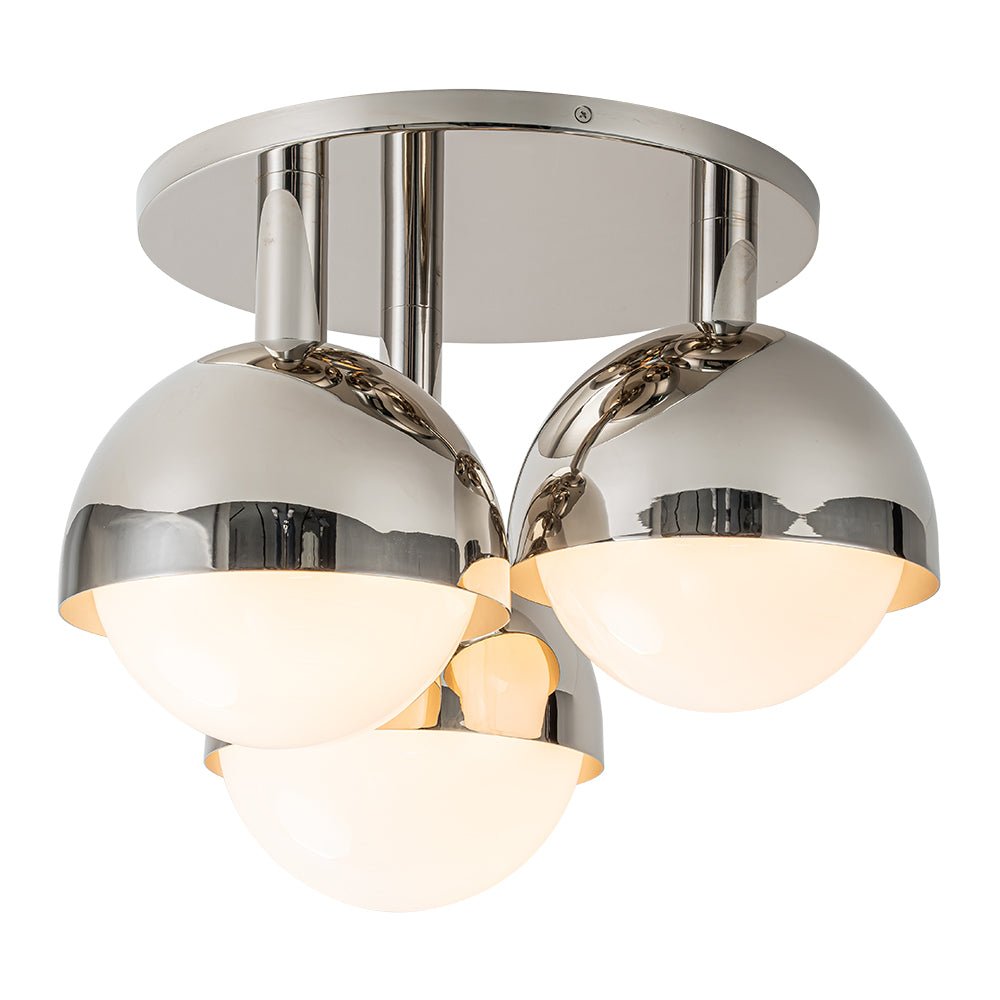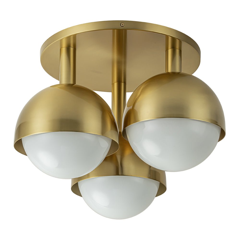 Tässä kestävästä raudasta valmistetun vuosisadan puolivälin modernin 3-valaisimen kattovalaisimessa on kolme lyhyttä sauvaa, jotka tulevat leveästä pyöreästä katosta ja jotka riippuvat kolme puolipallon muotoista sävyä. Jokainen metallivarjostin on ympäröity maidonvalkoisella lasipallolla, joka luo minimalistisen kuplatyylin. E26-pohjaisten polttimoiden (ei sisälly toimitukseen) kanssa tämä puoliksi upotettava kattokruunu toimii erinomaisesti ja tarjoaa lämpimän ja viihtyisän ympäristön valaistuksen. Vanhentuneella messingillä tai kiillotetulla nikkelillä viimeistelty opaalilasipallo, puolitasossa asennettava valaisin on hillitty mutta hienostunut lisä, joka on ihanteellinen ruokailuhuoneen, eteisen, makuuhuoneen, eteisen tai olohuoneen rakentamiseen.Tiedot