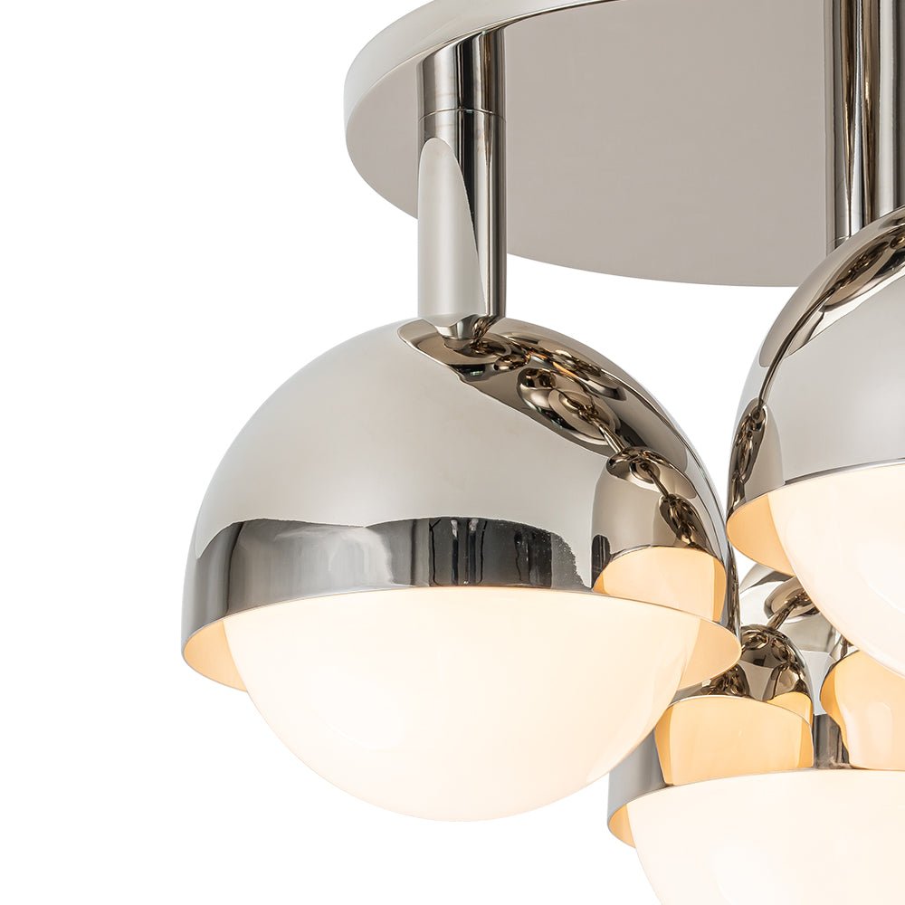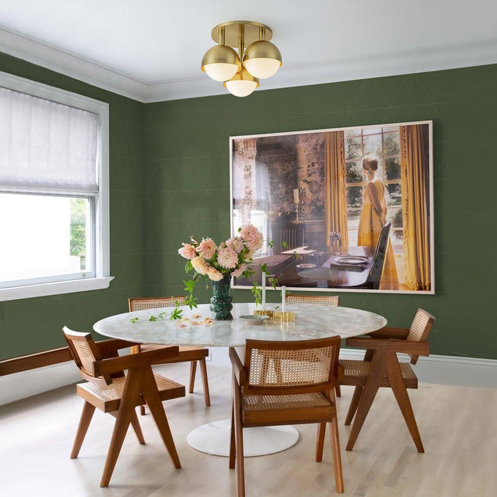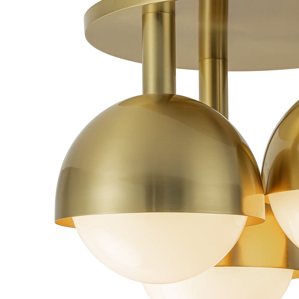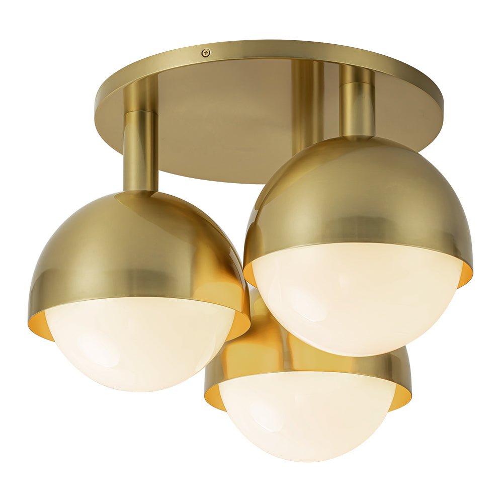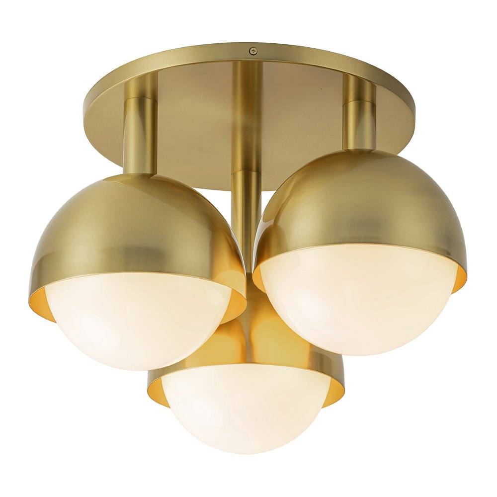 Tässä kestävästä raudasta valmistetun vuosisadan puolivälin modernin 3-valaisimen kattovalaisimessa on kolme lyhyttä sauvaa, jotka tulevat leveästä pyöreästä katosta ja jotka riippuvat kolme puolipallon muotoista sävyä. Jokainen metallivarjostin on ympäröity maidonvalkoisella lasipallolla, joka luo minimalistisen kuplatyylin. E26-pohjaisten polttimoiden (ei sisälly toimitukseen) kanssa tämä puoliksi upotettava kattokruunu toimii erinomaisesti ja tarjoaa lämpimän ja viihtyisän ympäristön valaistuksen. Vanhentuneella messingillä tai kiillotetulla nikkelillä viimeistelty opaalilasipallo, puolitasossa asennettava valaisin on hillitty mutta hienostunut lisä, joka on ihanteellinen ruokailuhuoneen, eteisen, makuuhuoneen, eteisen tai olohuoneen rakentamiseen.Tiedot