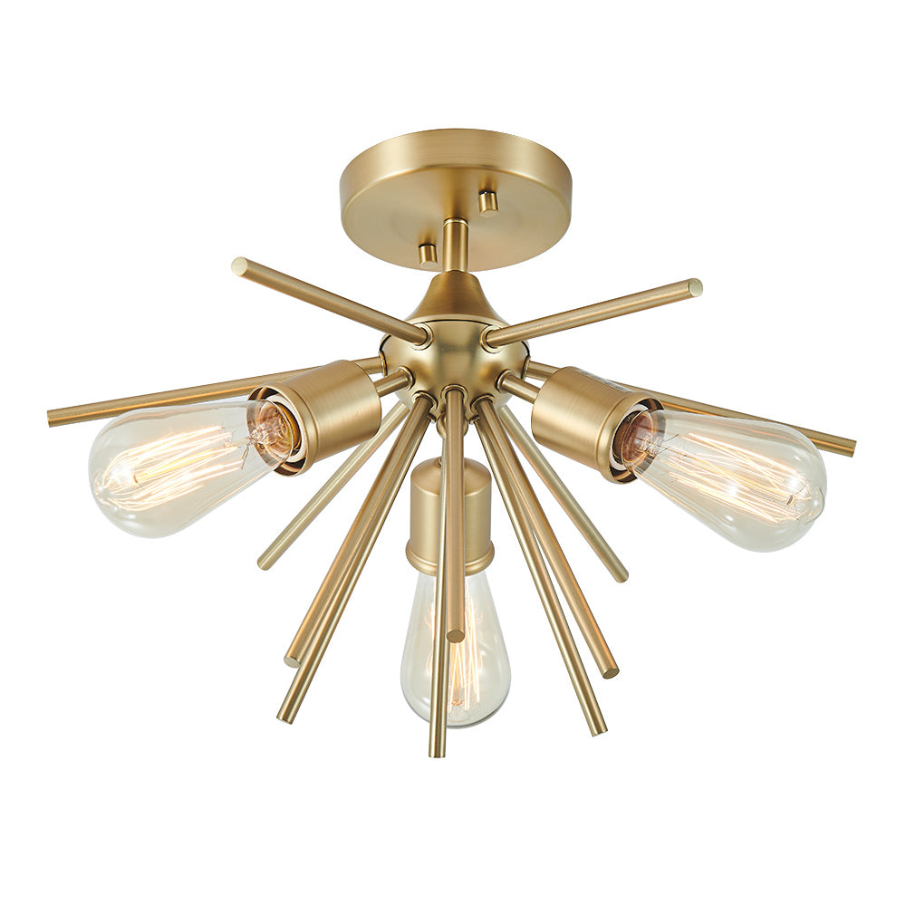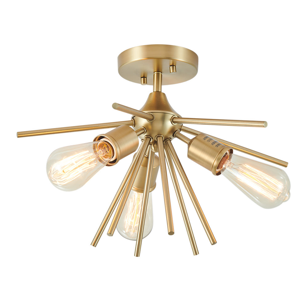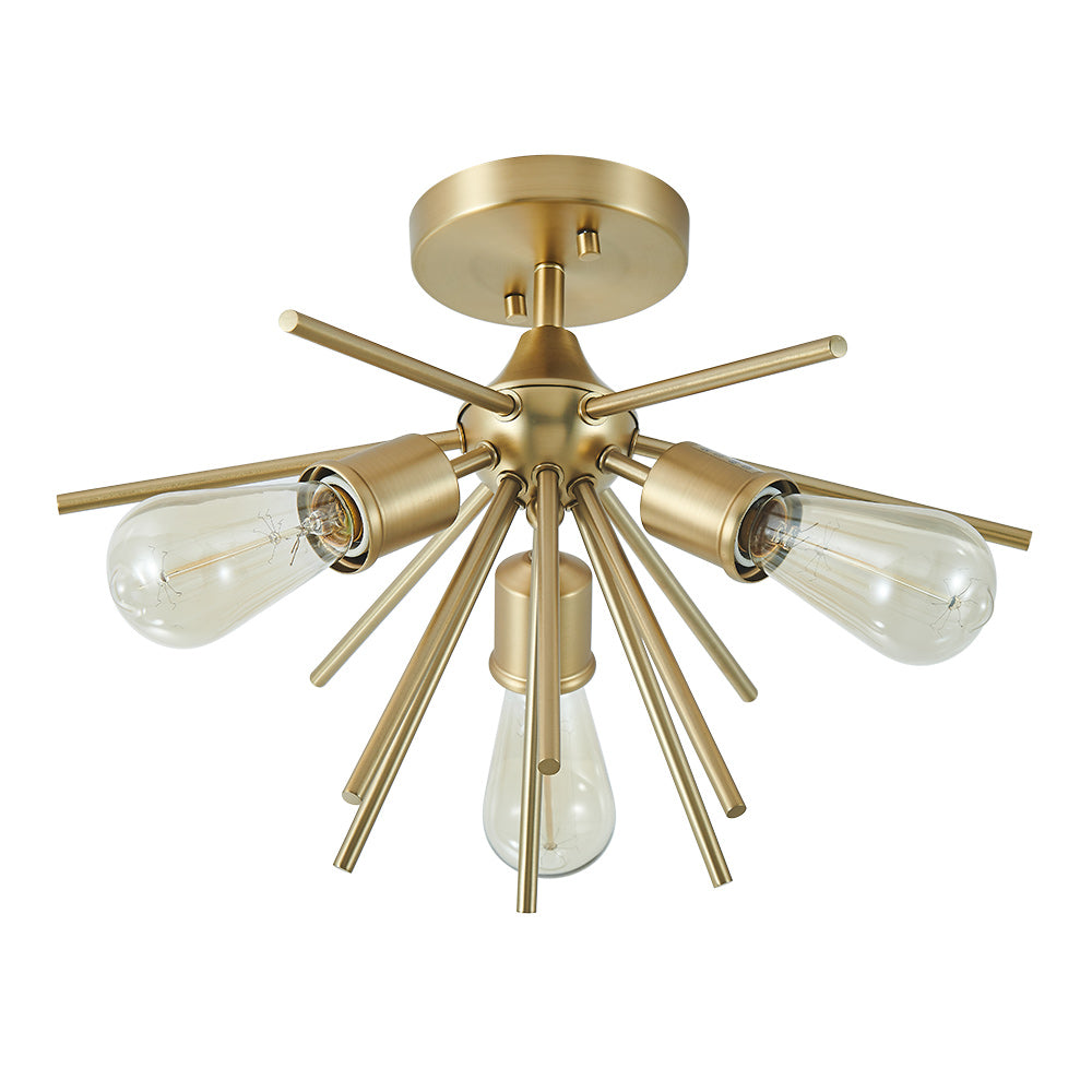 Starburst-tyyliset tangot ulottuvat pyöreästä kuomusta ja kerääntyvät kolmen E26/E27-pohjaisen pistorasian ympärille tässä sputnik-puolivalaisimessa. Kaunis messinkiviimeistely tuo tyylikkään vuosisadan puolivälin kosketuksen tähän 3-kevyiseen starburst-puolisesti uppoasennettavaan valaisimeen. Asennat mielelläsi tämän messinkisen sputnik-kattovalaisimen eteiseen, keittiöön, makuuhuoneeseen, pesutupaan tai mihin tahansa oleskelutilaan.Detail