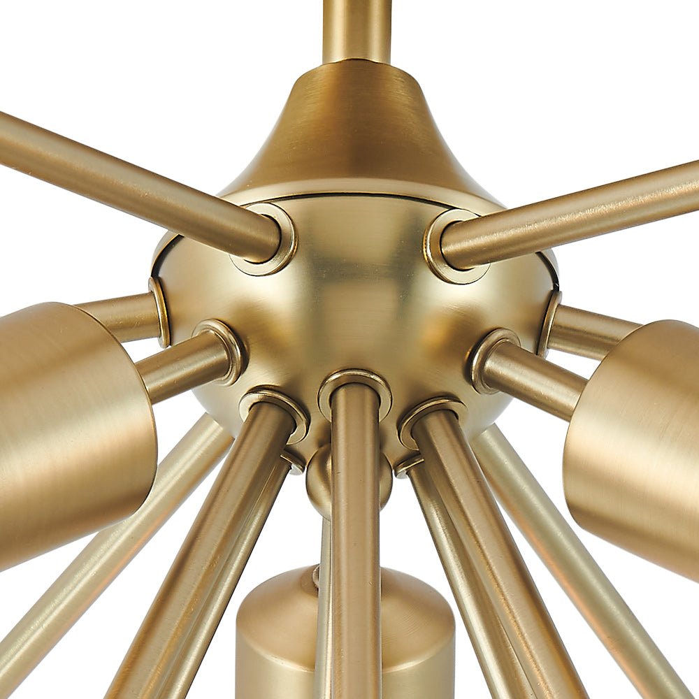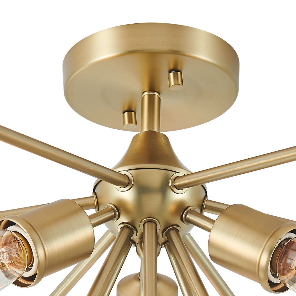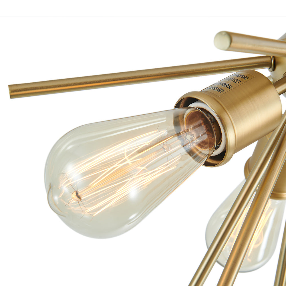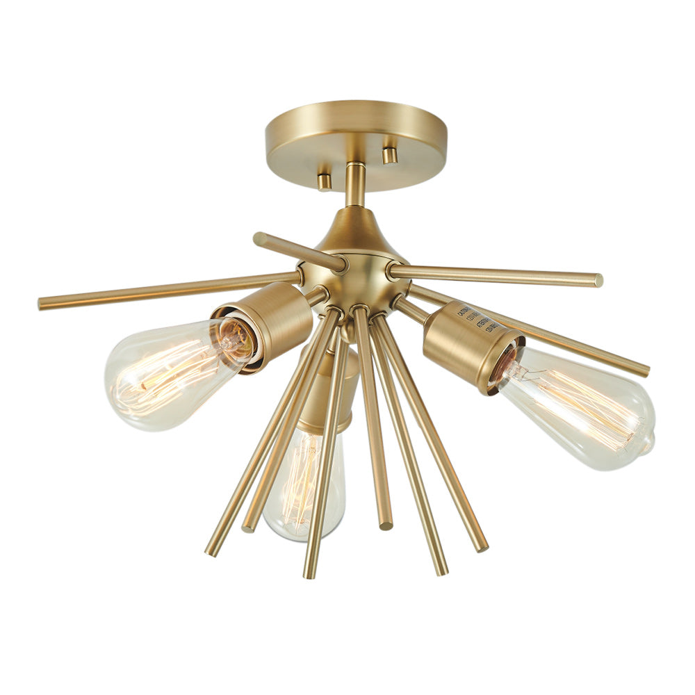 Starburst-tyyliset tangot ulottuvat pyöreästä kuomusta ja kerääntyvät kolmen E26/E27-pohjaisen pistorasian ympärille tässä sputnik-puolivalaisimessa. Kaunis messinkiviimeistely tuo tyylikkään vuosisadan puolivälin kosketuksen tähän 3-kevyiseen starburst-puolisesti uppoasennettavaan valaisimeen. Asennat mielelläsi tämän messinkisen sputnik-kattovalaisimen eteiseen, keittiöön, makuuhuoneeseen, pesutupaan tai mihin tahansa oleskelutilaan.Detail