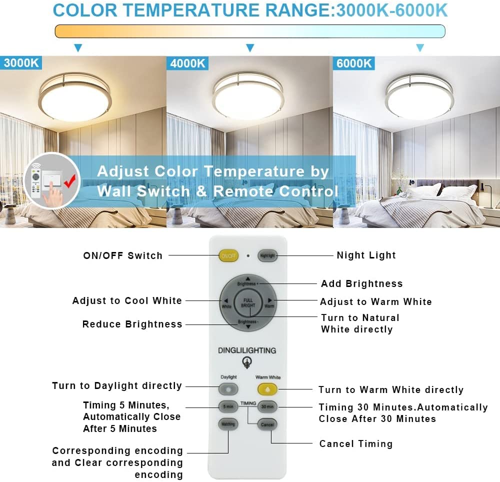 1. Super Bright: 30W himmennettävä kattovalaisin kaukosäätimellä - 3 valon väriä vaihdettava - Viileä valo, luonnonvalo, lämmin valo, 3000K-6000K. 20-100 % tasainen himmennys kaukosäätimellä, erinomainen korkean suorituskyvyn led-kattovalaisin, joka korvaa suoraan vanhan kattovalaisimen. (Ei langatonta/Ei paristokäyttöistä/Ei liiketunnistinta)