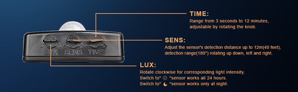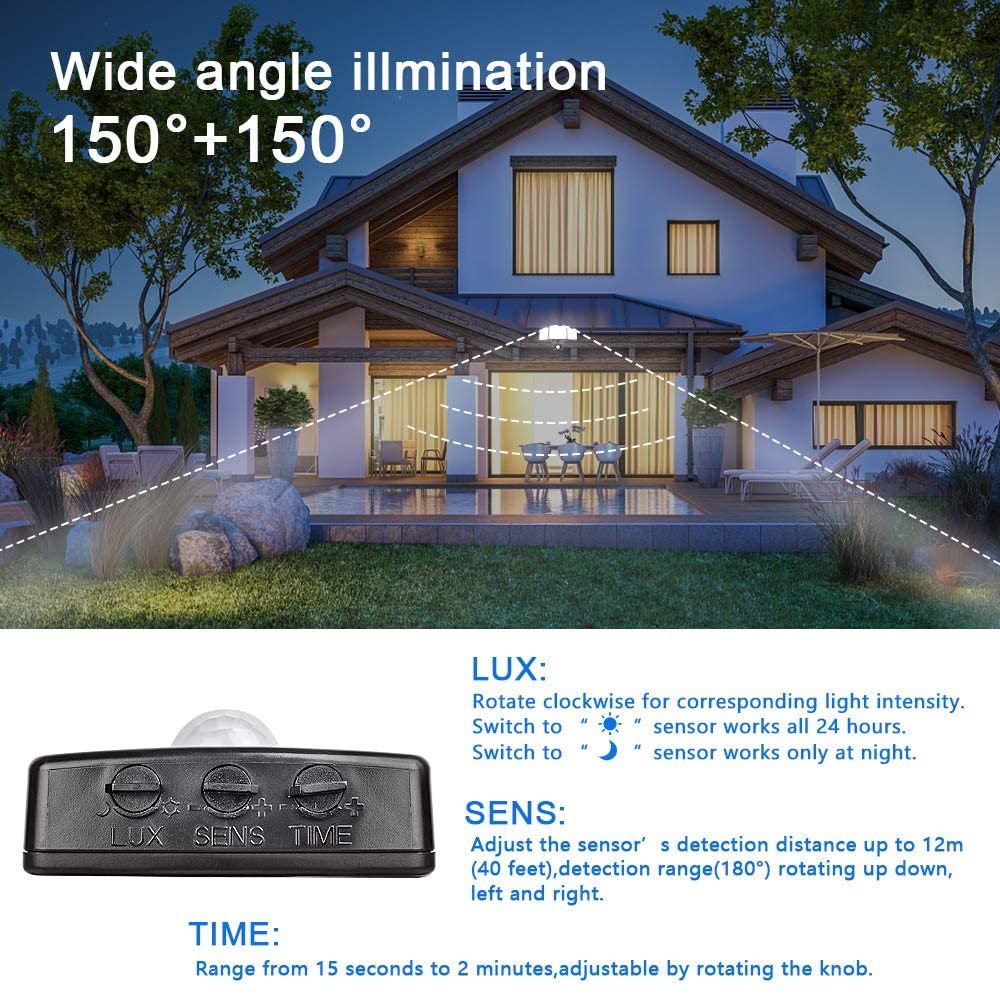 - 【Automaattinen ja helppo valaistus】Ulkovalaisimet voivat syttyä automaattisesti, kun valonheitin havaitaan 180 asteen kääntökulmassa, ja ne havaitsevat valon tason ja liikkeen enintään 12 metriin (40 jalkaan). Ja huomaa, että tämä valo 1,5 metrin johdolla ja pistokkeella.