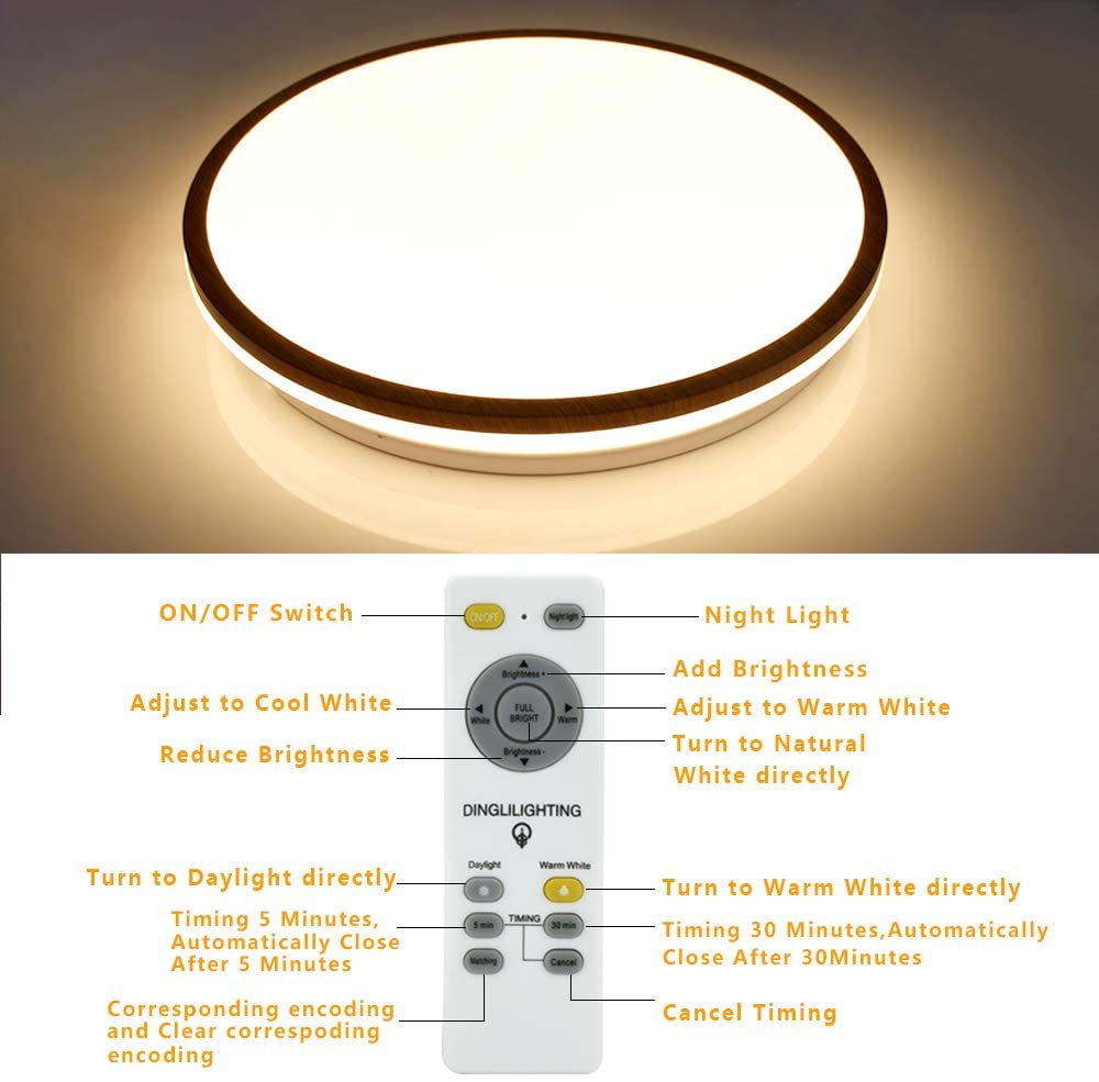 Puinen kattovalaisin on himmennettävissä, ja siinä on 3 valon värivaihtoehtoa, 3000K, 4000K ja 6000K (luonnonvalo, lämmin valo ja valkoinen valo) Väriä säädät kaukosäätimellä. Lisäksi se himmentää 5–100 % kirkkautta eri kohtausten mukaan kaukosäätimellä. Säätämällä yövalotilaa kaukosäätimellä valo voi olla 3000K lämpimän valkoista valoa ja 5 % kirkkautta.