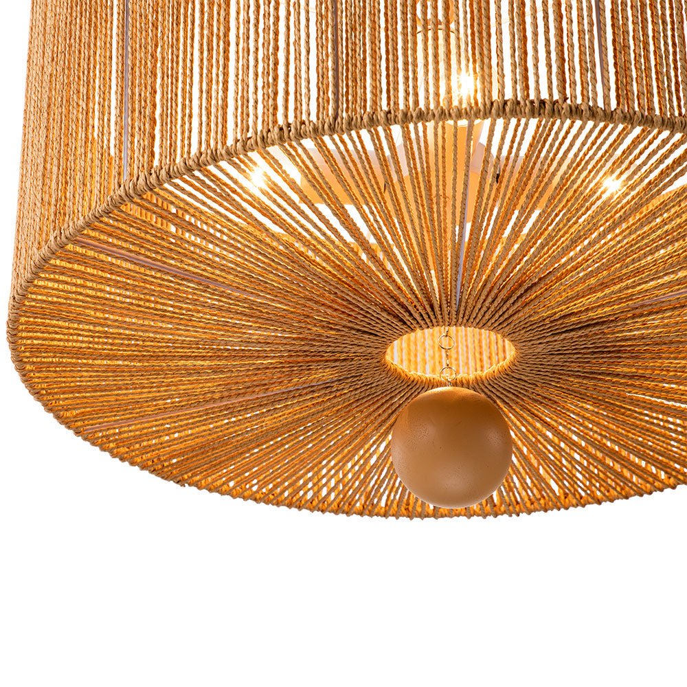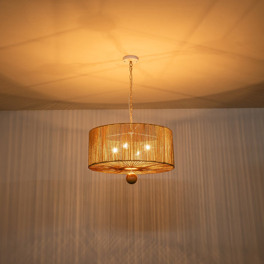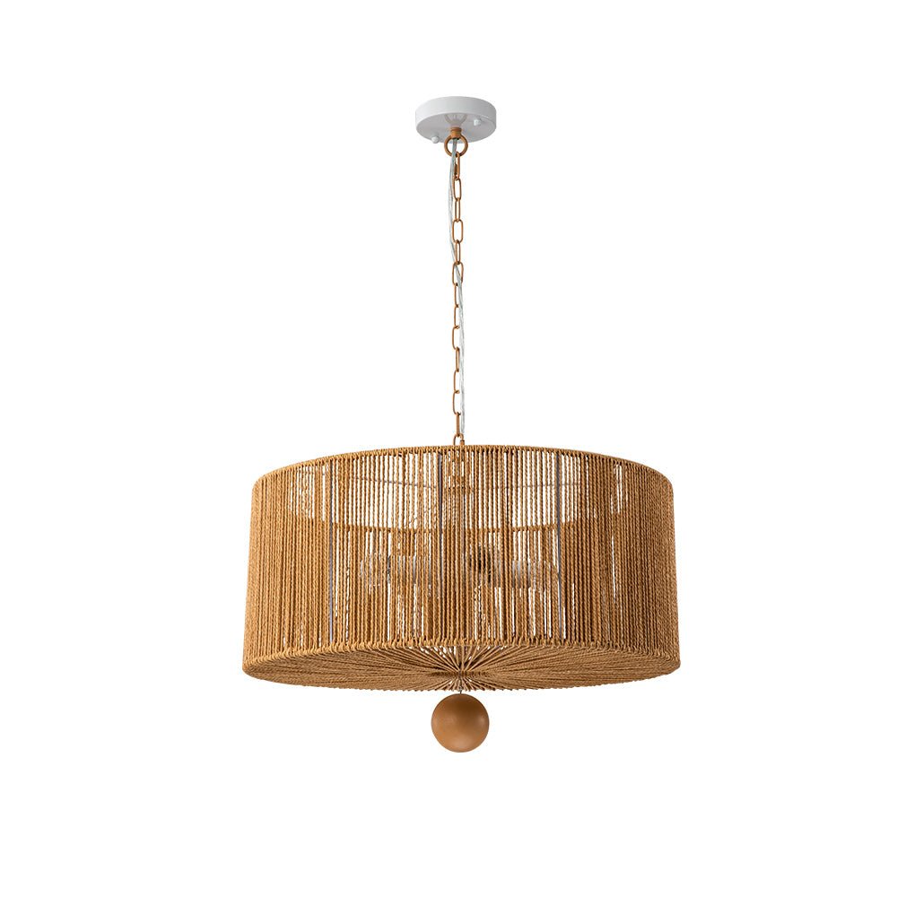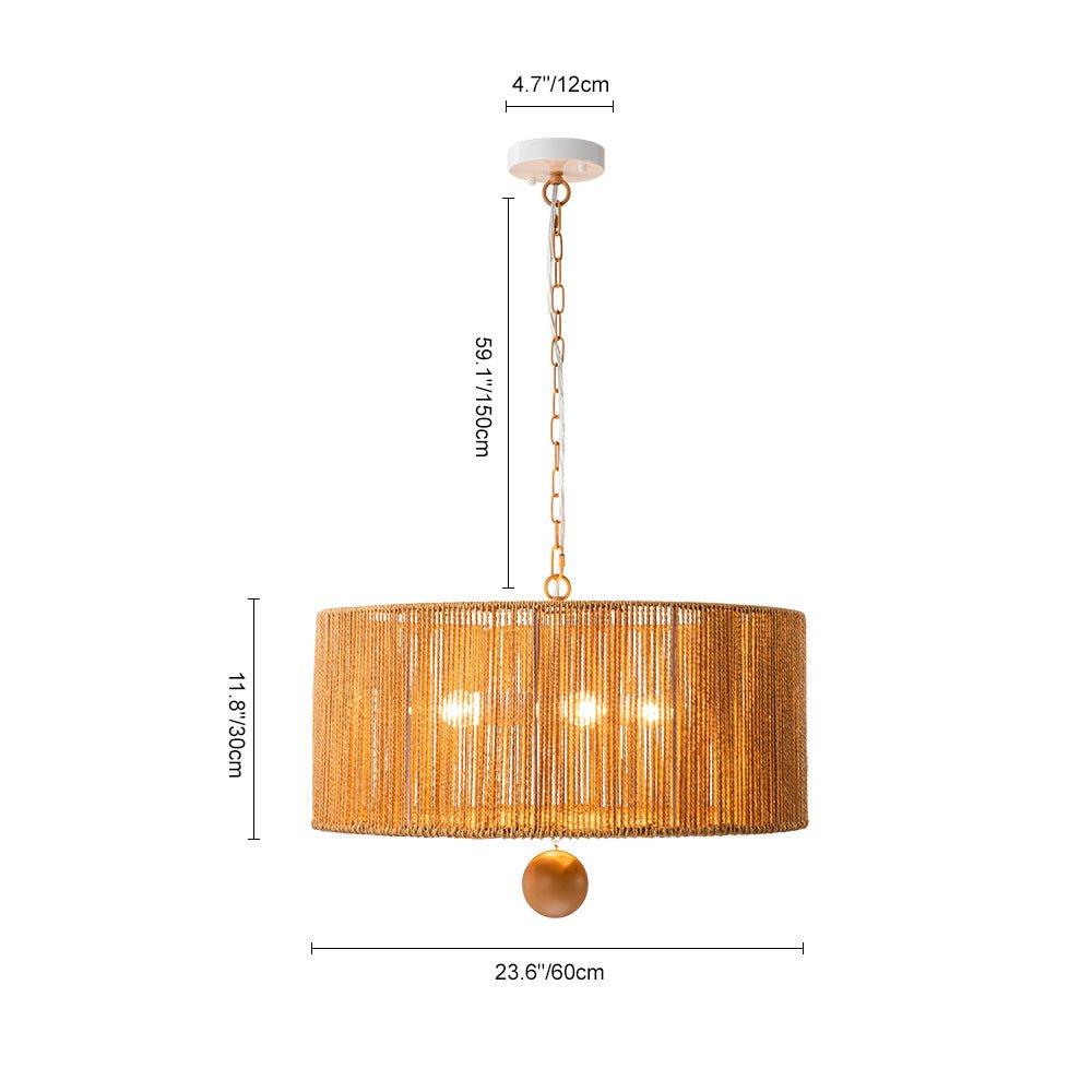 Lisää kotiisi boheemia eleganssia yhdistämällä tämä 4-valaisinköysiriippuvalaisin. Tämä riippuvalaisin, jossa on leveä rumpurunko, joka on kiedottu ruskeilla kudottuilla köysillä, korostaa mitä tahansa ruokailutilaa tai oleskelutilaa tyylikkäällä maalaismaisella ja elegantilla eksoottisella tuulella. Ruskea ketju tarjoaa säädettävän ripustuspituuden harmonisen, maanläheisen sävyn ja vaivattoman, rennon ilmeen saamiseksi. Tämä vintage ruskea köysi leveä rumpuvalaisin tuo mieleen rytminen, saaritunnelma.Tiedot